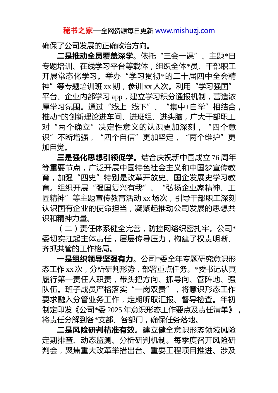 秘书之家—全网资源每日更新 www.mishuzj.com公司 2025 年度意识形态分析研判报告2025 年,在上级*委的坚强领导下,xx 公司*委坚持以**************思想为指导,深入学习贯彻*的二十大及二十届历次全会精神,全面落实*中央及上级*委关于意识形态工作的决策部署,紧密围绕公司改革发展和生产经营中心任务,牢牢掌握意识形态工作领导权、管理权、话语权着力防范化解意识形态领域风险挑战,不断巩固壮大主流思想舆论,为公司实现年度经营目标、推进高质量发展提供了坚强的思想保证、强大的精神动力和良好的舆论环境根据年度工作安排,现将公司 2025 年度意识形态领域分析研判情况报告如下:一、2025 年度意识形态工作总体态势与主要成效公司*委始终将意识形态工作摆在极端重要的位置,坚持*管意识形态原则,严格落实意识形态工作责任制,各项工作扎实推进,意识形态领域总体保持向上向好、平稳可控的态势。(一)理论武装持续深化,思想根基更加牢固。公司*委坚持将理论学习作为首要政治任务,持续用*的创新理论武装头脑、指导实践、推动工作。一是抓实“关键少数”领学。严格执行*委会“第一议题”制度、理论学习中心组学习制度,全年组织*委会“第一议题”学习共 xx 次,理论学习中心组专题学习研讨 xx 次,深入学习《***著作选读》《***关于国有企业改革发展和dj 论述摘编》等重要文献,及时跟进学习******最新重要讲话和指示批示精神,特别是关于发展新质生产力、推动高质量发展、深化国资国企改革等重要论述。领导班子成员的政治判断力、政治领悟力、政治执行力得到有效提升秘书之家—全网资源每日更新 www.mishuzj.com确保了公司发展的正确政治方向。二是推动全员覆盖深学。依托“三会一课”、主题*日专题培训、在线学习平台等载体,组织全体*员、干部职工开展常态化学习。举办“学习贯彻*的二十届四中全会精神”等专题培训班 xx 期,参训 xx 人次。利用“学习强国”平台、企业内部学习 app,建立学习积分通报机制,营造浓厚学习氛围。通过“线上+线下”、“集中+自学”相结合,推动*的创新理论进车间、进班组、进头脑,广大干部职工对“两个确立”决定性意义的认识更加深刻,“四个意识”不断增强,“四个自信”更加坚定,“两个维护”更加自觉。三是强化思想引领促学。结合庆祝新中国成立 76 周年等重要节点,广泛开展中国特色社会主义和中国梦宣传教育,加强“四史”特别是改革开放史、国企发展史学习教育。组织开展“强国复兴有我”、“弘扬企业家精神、工匠精神”等主题宣传教育活动 xx 场次,引导干部职工深刻认识国有企业的使命担当,凝聚起推动公司发展的思想共识和精神力量。(二)责任体系健全完善,防控网络织密扎牢。公司*委切实扛起主体责任,层层传导压力,构建了权责明晰、齐抓共管的工作格局。一是组织领导坚强有力。公司*委全年专题研究意识形态工作 xx 次,分析研判形势,部署重点任务。*委书记认真履行第一责任人职责,带头把方向、抓导向、管阵地、强队伍。班子成员严格落实“一岗双责”,将意识形态工作要求融入分管业务工作,定期听取汇报、督导检查。年初制定印发《公司*委 2025 年意识形态工作要点及责任清单》,将责任分解到各*支部、各部门,确保任务落地。二是风险研判精准有效。建立健全意识形态领域风险定期排查、动态监测、分析研判机制。每季度召开风险研判会,聚焦重大改革举措出台、重要工程项目推进、涉及秘书之家—全网资源每日更新 www.mishuzj.com职工切身利益的政策调整等关键环节,以及网络舆情、社会思潮等外部环境变化,深入排查风险隐患 xx 项,并逐一制定应对预案。加强对重点人群、关键岗位人员的思想动态分析,及时掌握苗头性、倾向性问题。三是阵地管理严格规范。严格落实主管主办和属地管理原则,加强对公司网站、微信公众号、内部报刊、宣传栏、电子屏、会议室、报告厅等各类意识形态阵地的管理严格执行信息发布“三审三校”制度,全年审核发布各类信息 xx 余条,未出现政治性、导向性错误。加强对研讨会、论坛、讲座、培训等活动的审批和内容监管。规范干部职工网络行为,教育引导其恪守网络...