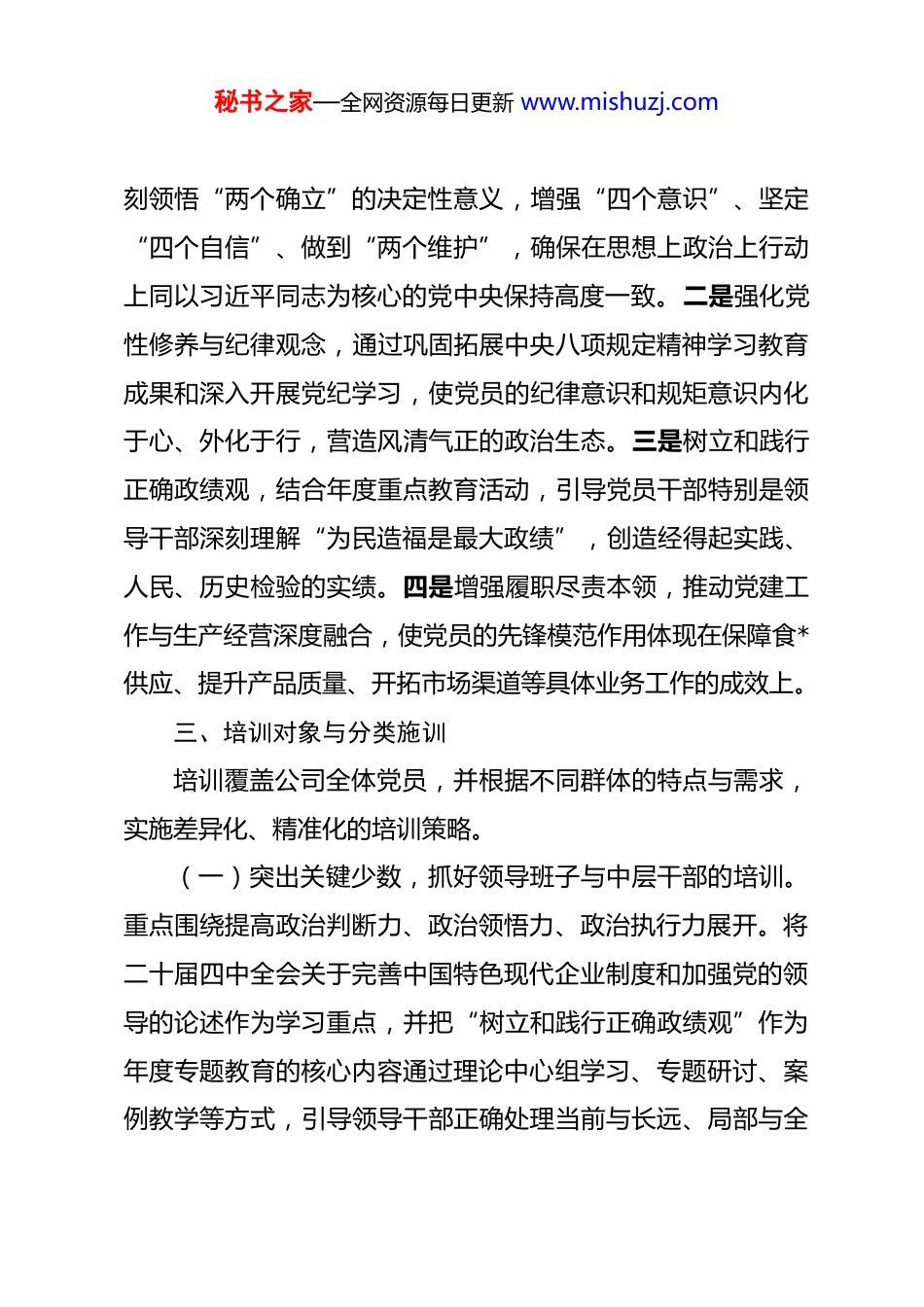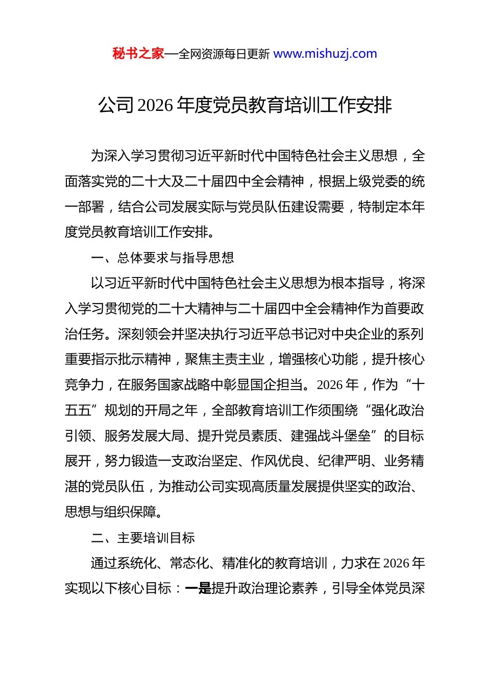 秘书之家—全网资源每日更新 www.mishuzj.com公司 2026 年度党员教育培训工作安排 为深入学习贯彻习近平新时代中国特色社会主义思想,全面落实党的二十大及二十届四中全会精神,根据上级党委的统一部署,结合公司发展实际与党员队伍建设需要,特制定本年度党员教育培训工作安排。一、总体要求与指导思想以习近平新时代中国特色社会主义思想为根本指导,将深入学习贯彻党的二十大精神与二十届四中全会精神作为首要政治任务。深刻领会并坚决执行习近平总书记对中央企业的系列重要指示批示精神,聚焦主责主业,增强核心功能,提升核心竞争力,在服务国家战略中彰显国企担当。2026 年,作为“十五五”规划的开局之年,全部教育培训工作须围绕“强化政治引领、服务发展大局、提升党员素质、建强战斗堡垒”的目标展开,努力锻造一支政治坚定、作风优良、纪律严明、业务精湛的党员队伍,为推动公司实现高质量发展提供坚实的政治、思想与组织保障。二、主要培训目标通过系统化、常态化、精准化的教育培训,力求在 2026 年实现以下核心目标:一是提升政治理论素养,引导全体党员深秘书之家—全网资源每日更新 www.mishuzj.com刻领悟“两个确立”的决定性意义,增强“四个意识”、坚定“四个自信”、做到“两个维护”,确保在思想上政治上行动上同以习近平同志为核心的党中央保持高度一致。二是强化党性修养与纪律观念,通过巩固拓展中央八项规定精神学习教育成果和深入开展党纪学习,使党员的纪律意识和规矩意识内化于心、外化于行,营造风清气正的政治生态。三是树立和践行正确政绩观,结合年度重点教育活动,引导党员干部特别是领导干部深刻理解“为民造福是最大政绩”,创造经得起实践、人民、历史检验的实绩。四是增强履职尽责本领,推动党建工作与生产经营深度融合,使党员的先锋模范作用体现在保障食*供应、提升产品质量、开拓市场渠道等具体业务工作的成效上。三、培训对象与分类施训培训覆盖公司全体党员,并根据不同群体的特点与需求,实施差异化、精准化的培训策略。(一)突出关键少数,抓好领导班子与中层干部的培训。重点围绕提高政治判断力、政治领悟力、政治执行力展开。将二十届四中全会关于完善中国特色现代企业制度和加强党的领导的论述作为学习重点,并把“树立和践行正确政绩观”作为年度专题教育的核心内容通过理论中心组学习、专题研讨、案例教学等方式,引导领导干部正确处理当前与长远、局部与全秘书之家—全网资源每日更新 www.mishuzj.com局的关系,科学决策,务实作为。(二)夯实骨干力量,加强党务工作干部的专业培训。组织党务干部系统学习党建理论、党内法规和实务操作知识,着重提升其组织“三会一课”、开展主题党日、做好党员发展与教育管理工作的专业能力。邀请上级党组织或专业机构的专家进行授课,分享党建工作创新经验,推动公司党建工作制度化、规范化、科学化水平迈上新台阶。(三)筑牢后备基础,做好青年党员与新发展党员的培养教育。针对新党员,系统开展入党启蒙和党性教育,组织学习党章党规党纪,参观红色教育基地,引导其坚定理想信念,扣好“第一粒扣子”。对于青年党员,则侧重于思想淬炼和实践锻炼,鼓励其在急难险重任务中担当作为,将个人成长融入公司发展蓝图。四、核心培训内容本年度培训内容将紧扣时代要求与公司实际,突出政治性、理论性与实践性的有机统一。(一)深化党的创新理论武装。将学习习近平新时代中国特色社会主义思想作为贯穿全年的主线。重点组织学习党的二十届四中全会公报及其精神解读,深刻把握“十五五”时期国资国企改革发展的宏观部署与战略要求。同时,建立学习贯彻秘书之家—全网资源每日更新 www.mishuzj.com习近平总书记对中央企业重要指示批示精神的长效机制,定期组织专题学习研讨,对照指示精神检查公司战略规划、业务布局与改革举措,确保总书记的重要指示在公司不折不扣得到落实。(二)聚焦树立和践行正确政绩观学习教育。按照中央统一部署,将此项学习教育作为年度重点任务抓实抓好。组织全体党员干部深入学习习近平总书记关于正确政绩观的重要论述,围绕“政绩为谁而树、树什么样的政绩...