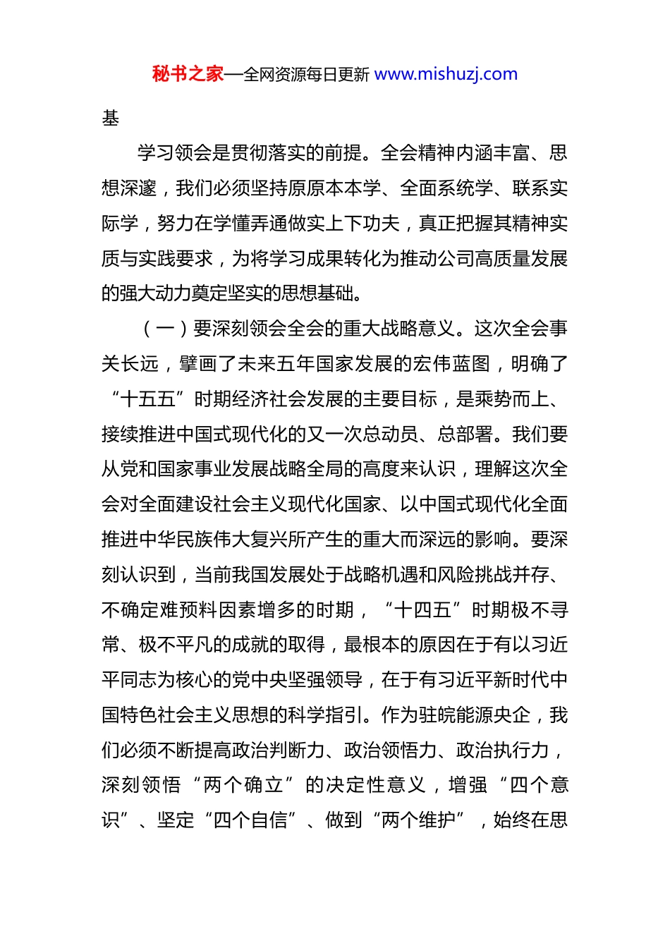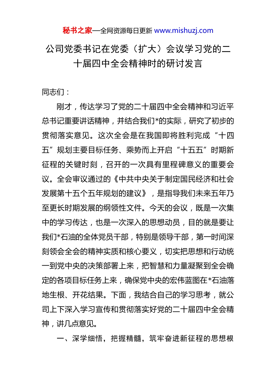秘书之家—全网资源每日更新 www.mishuzj.com公司党委书记在党委(扩大)会议学习党的二十届四中全会精神时的研讨发言 同志们:刚才,传达学习了党的二十届四中全会精神和习近平总书记重要讲话精神,并结合我们*的实际,研究了初步的贯彻落实意见。这次全会是在我国即将胜利完成“十四五”规划主要目标任务、乘势而上开启“十五五”时期新征程的关键时刻,召开的一次具有里程碑意义的重要会议。全会审议通过的《中共中央关于制定国民经济和社会发展第十五个五年规划的建议》,是指导我们未来五年乃至更长时期发展的纲领性文件。今天的会议,既是一次集中的学习传达,也是一次深入的思想动员,目的就是要让我们*石油的全体党员干部,特别是领导干部,第一时间深刻领会全会的精神实质和核心要义,切实把思想和行动统一到党中央的决策部署上来,把智慧和力量凝聚到全会确定的各项目标任务上来,确保党中央的宏伟蓝图在*石油落地生根、开花结果。下面,我结合自己的学习思考,就公司上下深入学习宣传和贯彻落实好党的二十届四中全会精神,讲几点意见。一、深学细悟,把握精髓,筑牢奋进新征程的思想根秘书之家—全网资源每日更新 www.mishuzj.com基学习领会是贯彻落实的前提。全会精神内涵丰富、思想深邃,我们必须坚持原原本本学、全面系统学、联系实际学,努力在学懂弄通做实上下功夫,真正把握其精神实质与实践要求,为将学习成果转化为推动公司高质量发展的强大动力奠定坚实的思想基础。(一)要深刻领会全会的重大战略意义。这次全会事关长远,擘画了未来五年国家发展的宏伟蓝图,明确了“十五五”时期经济社会发展的主要目标,是乘势而上、接续推进中国式现代化的又一次总动员、总部署。我们要从党和国家事业发展战略全局的高度来认识,理解这次全会对全面建设社会主义现代化国家、以中国式现代化全面推进中华民族伟大复兴所产生的重大而深远的影响。要深刻认识到,当前我国发展处于战略机遇和风险挑战并存、不确定难预料因素增多的时期,“十四五”时期极不寻常、极不平凡的成就的取得,最根本的原因在于有以习近平同志为核心的党中央坚强领导,在于有习近平新时代中国特色社会主义思想的科学指引。作为驻皖能源央企,我们必须不断提高政治判断力、政治领悟力、政治执行力,深刻领悟“两个确立”的决定性意义,增强“四个意识”、坚定“四个自信”、做到“两个维护”,始终在思秘书之家—全网资源每日更新 www.mishuzj.com想上政治上行动上同以习近平同志为核心的党中央保持高度一致,确保*石油的各项事业始终沿着正确的政治方向前进。(二)要准确把握高质量发展的核心要求。高质量发展是全面建设社会主义现代化国家的首要任务。全会将“高质量发展取得显著成效”置于“十五五”时期经济社会发展主要目标的首位。这对我们能源企业提出了更高要求。这意味着我们的发展不能仅仅追求量的扩张,更要注重质的有效提升。要牢牢把握“巩固壮大实体经济根基”这一关键,深刻理解建设现代化产业体系,坚持智能化、绿色化、融合化方向,优化提升传统产业、培育壮大新兴产业和未来产业的重要性。对于我们*石油而言,就是要将发展的着力点放在提升能源供应保障的质量和效率上,放在推动绿色低碳转型上,放在依靠科技创新培育新动能上,切实将高质量发展要求贯穿于公司经营管理的全过程、各领域,努力实现更高质量、更有效率、更可持续、更为安全的发展。(三)要清醒认识能源安全的神圣使命。能源安全是关系国家经济社会发展的全局性、战略性问题。习近平总书记反复强调,能源的饭碗必须端在自己手里。全会再次强调了统筹发展和安全的极端重要性,要求建设更高水平秘书之家—全网资源每日更新 www.mishuzj.com的平安中国,国家安全屏障更加巩固。作为中国石油在皖的骨干企业,保障*区域的能源安全,是我们义不容辞的政治责任和初心使命。我们要始终胸怀“国之大者”,深刻认识到我们工作的每一点进展,都直接关系到区域经济社会的稳定运行,关系到国家能源安全大局。要时刻保持清醒头脑,增强忧患意识,发扬以“苦干实干”“三老四严”为核心的石油精神,全力提升油气资源的供应保障能...