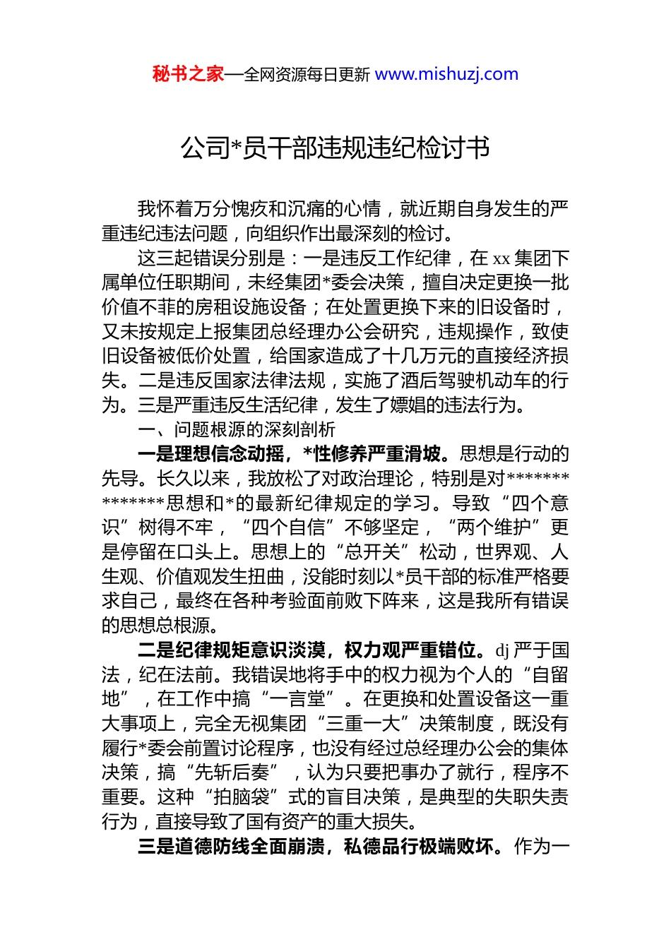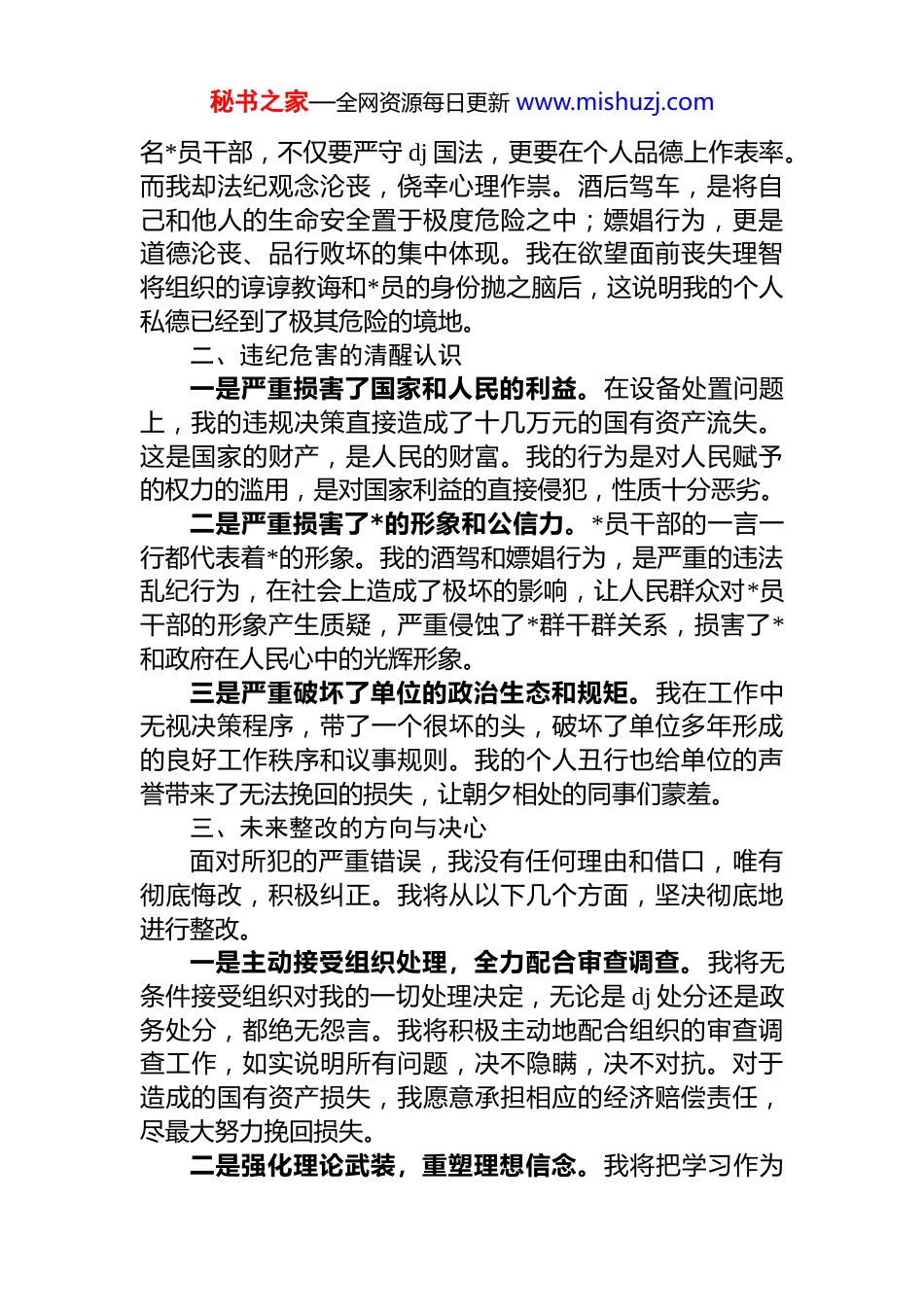 秘书之家—全网资源每日更新 www.mishuzj.com公司*员干部违规违纪检讨书我怀着万分愧疚和沉痛的心情,就近期自身发生的严重违纪违法问题,向组织作出最深刻的检讨。这三起错误分别是:一是违反工作纪律,在 xx 集团下属单位任职期间,未经集团*委会决策,擅自决定更换一批价值不菲的房租设施设备;在处置更换下来的旧设备时,又未按规定上报集团总经理办公会研究,违规操作,致使旧设备被低价处置,给国家造成了十几万元的直接经济损失。二是违反国家法律法规,实施了酒后驾驶机动车的行为。三是严重违反生活纪律,发生了嫖娼的违法行为。一、问题根源的深刻剖析一是理想信念动摇,*性修养严重滑坡。思想是行动的先导。长久以来,我放松了对政治理论,特别是对**************思想和*的最新纪律规定的学习。导致“四个意识”树得不牢,“四个自信”不够坚定,“两个维护”更是停留在口头上。思想上的“总开关”松动,世界观、人生观、价值观发生扭曲,没能时刻以*员干部的标准严格要求自己,最终在各种考验面前败下阵来,这是我所有错误的思想总根源。二是纪律规矩意识淡漠,权力观严重错位。dj 严于国法,纪在法前。我错误地将手中的权力视为个人的“自留地”,在工作中搞“一言堂”。在更换和处置设备这一重大事项上,完全无视集团“三重一大”决策制度,既没有履行*委会前置讨论程序,也没有经过总经理办公会的集体决策,搞“先斩后奏”,认为只要把事办了就行,程序不重要。这种“拍脑袋”式的盲目决策,是典型的失职失责行为,直接导致了国有资产的重大损失。三是道德防线全面崩溃,私德品行极端败坏。作为一秘书之家—全网资源每日更新 www.mishuzj.com名*员干部,不仅要严守 dj 国法,更要在个人品德上作表率。而我却法纪观念沦丧,侥幸心理作祟。酒后驾车,是将自己和他人的生命安全置于极度危险之中;嫖娼行为,更是道德沦丧、品行败坏的集中体现。我在欲望面前丧失理智将组织的谆谆教诲和*员的身份抛之脑后,这说明我的个人私德已经到了极其危险的境地。二、违纪危害的清醒认识一是严重损害了国家和人民的利益。在设备处置问题上,我的违规决策直接造成了十几万元的国有资产流失。这是国家的财产,是人民的财富。我的行为是对人民赋予的权力的滥用,是对国家利益的直接侵犯,性质十分恶劣。二是严重损害了*的形象和公信力。*员干部的一言一行都代表着*的形象。我的酒驾和嫖娼行为,是严重的违法乱纪行为,在社会上造成了极坏的影响,让人民群众对*员干部的形象产生质疑,严重侵蚀了*群干群关系,损害了*和政府在人民心中的光辉形象。三是严重破坏了单位的政治生态和规矩。我在工作中无视决策程序,带了一个很坏的头,破坏了单位多年形成的良好工作秩序和议事规则。我的个人丑行也给单位的声誉带来了无法挽回的损失,让朝夕相处的同事们蒙羞。三、未来整改的方向与决心面对所犯的严重错误,我没有任何理由和借口,唯有彻底悔改,积极纠正。我将从以下几个方面,坚决彻底地进行整改。一是主动接受组织处理,全力配合审查调查。我将无条件接受组织对我的一切处理决定,无论是 dj 处分还是政务处分,都绝无怨言。我将积极主动地配合组织的审查调查工作,如实说明所有问题,决不隐瞒,决不对抗。对于造成的国有资产损失,我愿意承担相应的经济赔偿责任,尽最大努力挽回损失。二是强化理论武装,重塑理想信念。我将把学习作为秘书之家—全网资源每日更新 www.mishuzj.com自我救赎的首要途径。从头开始,系统学习*章*规 dj,特别是逐条逐句精读新修订的《中国共产 dj 律处分条例》,深刻领会其精神实质和具体要求,真正把纪律规矩刻在心上。通过学习,彻底改造自己的主观世界,重新树立对*的忠诚,坚定共产主义理想信念。三是严守纪律底线,净化个人生活。我将以此次检讨为新的起点,时刻心存对 dj 国法的敬畏之心。在任何时候任何情况下,都坚决做到不碰红线、不越底线。同时,深刻汲取教训,彻底净化自己的社交圈、生活圈、朋友圈,培养健康的生活情趣,严格约束“八小时之外”的言行,重塑一名共产*员应有的品德和操守。恳请组织看我的实际行动。我愿意为我的...