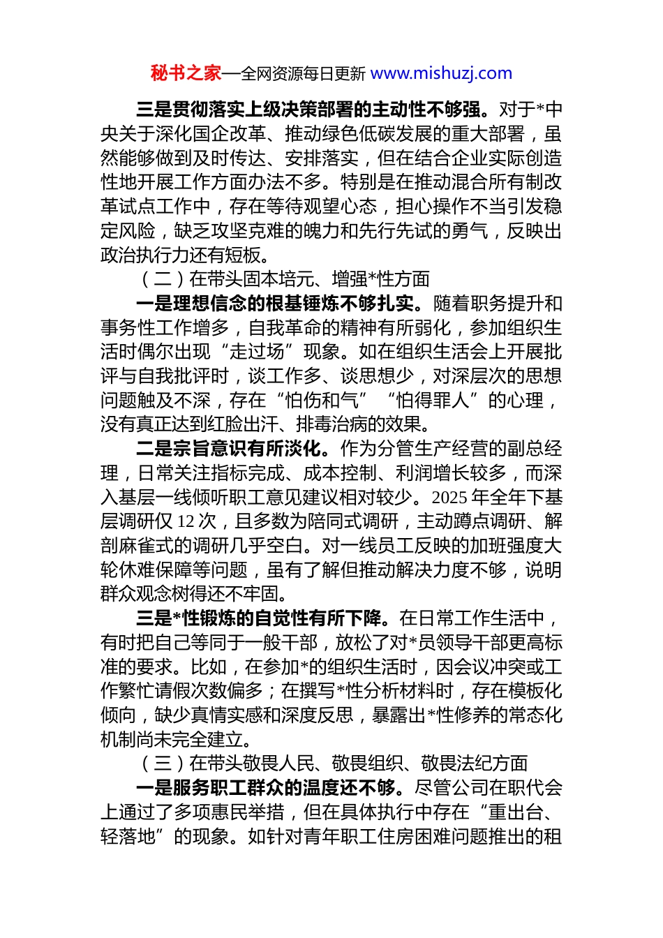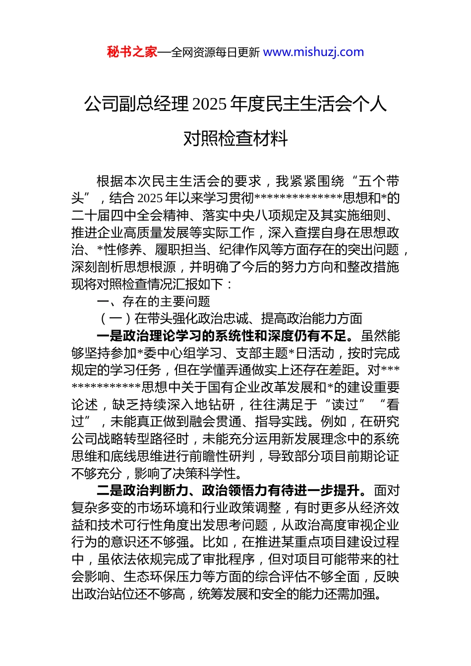 秘书之家—全网资源每日更新 www.mishuzj.com公司副总经理 2025 年度民主生活会个人对照检查材料根据本次民主生活会的要求,我紧紧围绕“五个带头”,结合 2025 年以来学习贯彻**************思想和*的二十届四中全会精神、落实中央八项规定及其实施细则、推进企业高质量发展等实际工作,深入查摆自身在思想政治、*性修养、履职担当、纪律作风等方面存在的突出问题,深刻剖析思想根源,并明确了今后的努力方向和整改措施现将对照检查情况汇报如下:一、存在的主要问题(一)在带头强化政治忠诚、提高政治能力方面一是政治理论学习的系统性和深度仍有不足。虽然能够坚持参加*委中心组学习、支部主题*日活动,按时完成规定的学习任务,但在学懂弄通做实上还存在差距。对**************思想中关于国有企业改革发展和*的建设重要论述,缺乏持续深入地钻研,往往满足于“读过”“看过”,未能真正做到融会贯通、指导实践。例如,在研究公司战略转型路径时,未能充分运用新发展理念中的系统思维和底线思维进行前瞻性研判,导致部分项目前期论证不够充分,影响了决策科学性。二是政治判断力、政治领悟力有待进一步提升。面对复杂多变的市场环境和行业政策调整,有时更多从经济效益和技术可行性角度出发思考问题,从政治高度审视企业行为的意识还不够强。比如,在推进某重点项目建设过程中,虽依法依规完成了审批程序,但对项目可能带来的社会影响、生态环保压力等方面的综合评估不够全面,反映出政治站位还不够高,统筹发展和安全的能力还需加强。秘书之家—全网资源每日更新 www.mishuzj.com三是贯彻落实上级决策部署的主动性不够强。对于*中央关于深化国企改革、推动绿色低碳发展的重大部署,虽然能够做到及时传达、安排落实,但在结合企业实际创造性地开展工作方面办法不多。特别是在推动混合所有制改革试点工作中,存在等待观望心态,担心操作不当引发稳定风险,缺乏攻坚克难的魄力和先行先试的勇气,反映出政治执行力还有短板。(二)在带头固本培元、增强*性方面一是理想信念的根基锤炼不够扎实。随着职务提升和事务性工作增多,自我革命的精神有所弱化,参加组织生活时偶尔出现“走过场”现象。如在组织生活会上开展批评与自我批评时,谈工作多、谈思想少,对深层次的思想问题触及不深,存在“怕伤和气”“怕得罪人”的心理,没有真正达到红脸出汗、排毒治病的效果。二是宗旨意识有所淡化。作为分管生产经营的副总经理,日常关注指标完成、成本控制、利润增长较多,而深入基层一线倾听职工意见建议相对较少。2025 年全年下基层调研仅 12 次,且多数为陪同式调研,主动蹲点调研、解剖麻雀式的调研几乎空白。对一线员工反映的加班强度大轮休难保障等问题,虽有了解但推动解决力度不够,说明群众观念树得还不牢固。三是*性锻炼的自觉性有所下降。在日常工作生活中,有时把自己等同于一般干部,放松了对*员领导干部更高标准的要求。比如,在参加*的组织生活时,因会议冲突或工作繁忙请假次数偏多;在撰写*性分析材料时,存在模板化倾向,缺少真情实感和深度反思,暴露出*性修养的常态化机制尚未完全建立。(三)在带头敬畏人民、敬畏组织、敬畏法纪方面一是服务职工群众的温度还不够。尽管公司在职代会上通过了多项惠民举措,但在具体执行中存在“重出台、轻落地”的现象。如针对青年职工住房困难问题推出的租秘书之家—全网资源每日更新 www.mishuzj.com房补贴政策,由于审核流程烦琐、发放周期较长,部分符合条件的职工未能及时享受到政策红利。这说明我在推动政策落地“最后一公里”上用力不足,缺乏“时时放心不下”的责任感。二是组织纪律观念需进一步强化。在重大事项请示报告制度执行上,虽然总体能够遵守,但个别情况下存在“先斩后奏”或“边干边报”的情况。例如,在一次紧急采购中,因时间紧迫未严格履行事前请示程序,而是事后补报,虽未造成不良后果,但反映出组织程序意识仍需加强。此外,在班子集体决策中,有时为了加快进度,对不同意见听取不够充分,存在“一言堂”倾向,不利于民主集中制的有效落实。三是法纪敬畏之心有待巩固。虽然始终严守廉洁自律底线...
