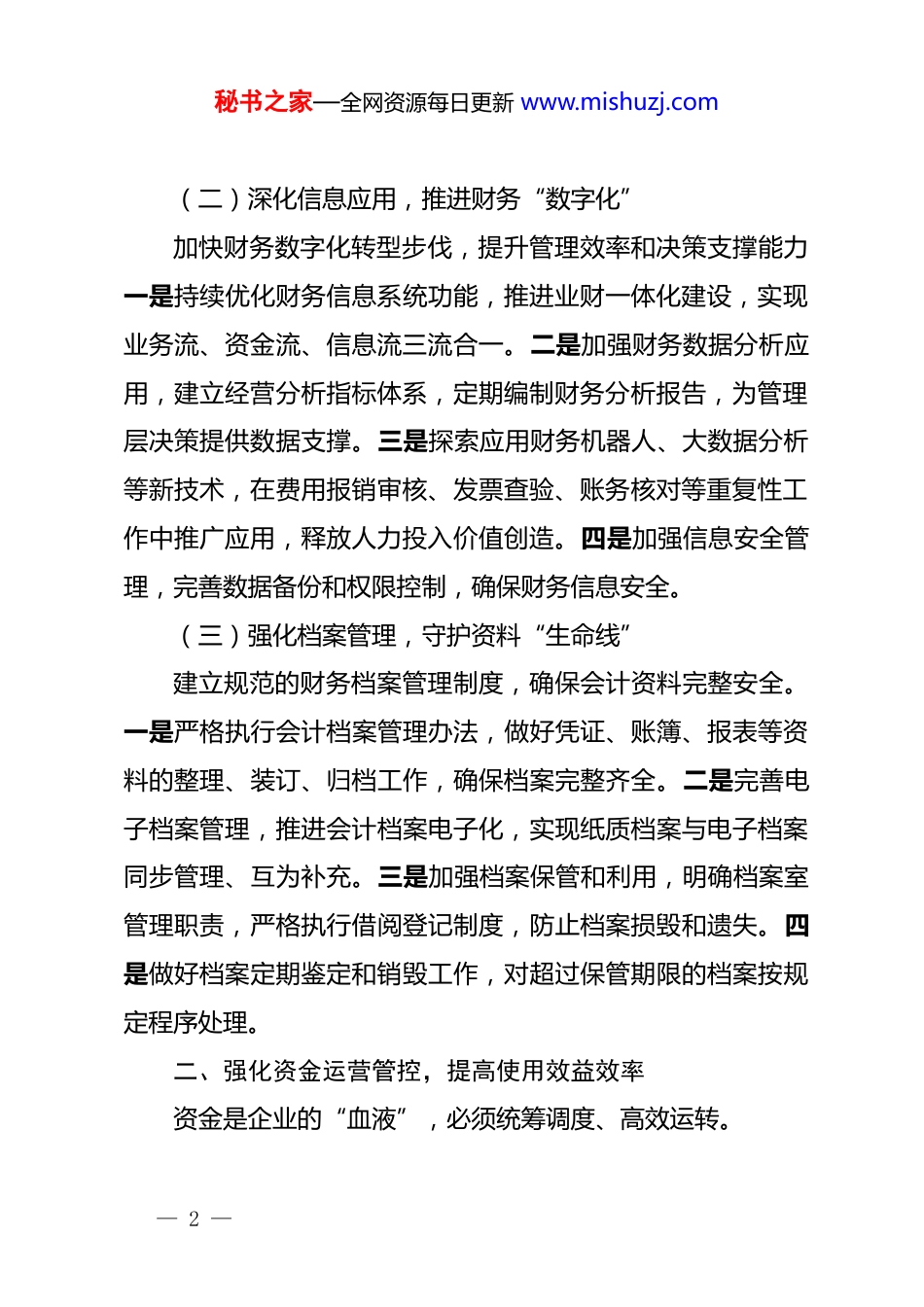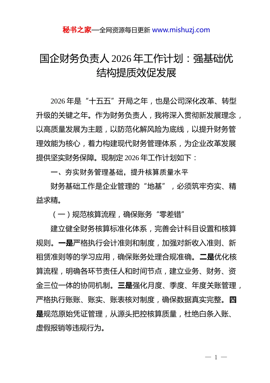 秘书之家—全网资源每日更新 www.mishuzj.com国企财务负责人 2026 年工作计划:强基础优结构提质效促发展2026 年是“十五五”开局之年,也是公司深化改革、转型升级的关键之年。作为财务负责人,我将深入贯彻新发展理念,以高质量发展为主题,以防范化解风险为底线,以提升财务管理效能为核心,着力构建现代财务管理体系,为企业改革发展提供坚实财务保障。现制定 2026 年工作计划如下:一、夯实财务管理基础,提升核算质量水平财务基础工作是企业管理的“地基”,必须筑牢夯实、精益求精。(一)规范核算流程,确保账务“零差错”建立健全财务核算标准化体系,完善会计科目设置和核算规则。一是严格执行会计准则和制度,加强对新收入准则、新租赁准则等的学习应用,确保账务处理合规准确。二是优化核算流程,明确各环节责任人和时间节点,建立业务、财务、资金三位一体的协同机制。三是强化月度、季度、年度关账管理,严格执行账账、账实、账表核对制度,确保数据真实完整。四是规范原始凭证管理,从源头把控核算质量,杜绝白条入账、虚假报销等违规行为。— 1 —秘书之家—全网资源每日更新 www.mishuzj.com(二)深化信息应用,推进财务“数字化”加快财务数字化转型步伐,提升管理效率和决策支撑能力一是持续优化财务信息系统功能,推进业财一体化建设,实现业务流、资金流、信息流三流合一。二是加强财务数据分析应用,建立经营分析指标体系,定期编制财务分析报告,为管理层决策提供数据支撑。三是探索应用财务机器人、大数据分析等新技术,在费用报销审核、发票查验、账务核对等重复性工作中推广应用,释放人力投入价值创造。四是加强信息安全管理,完善数据备份和权限控制,确保财务信息安全。(三)强化档案管理,守护资料“生命线”建立规范的财务档案管理制度,确保会计资料完整安全。一是严格执行会计档案管理办法,做好凭证、账簿、报表等资料的整理、装订、归档工作,确保档案完整齐全。二是完善电子档案管理,推进会计档案电子化,实现纸质档案与电子档案同步管理、互为补充。三是加强档案保管和利用,明确档案室管理职责,严格执行借阅登记制度,防止档案损毁和遗失。四是做好档案定期鉴定和销毁工作,对超过保管期限的档案按规定程序处理。二、强化资金运营管控,提高使用效益效率资金是企业的“血液”,必须统筹调度、高效运转。— 2 —秘书之家—全网资源每日更新 www.mishuzj.com(一)加强资金统筹,打好现金流“保卫战”建立资金集中管理机制,提升资金使用效率。一是完善资金预算管理,建立月度、季度、年度资金收支预算体系,加强预算执行监控,确保资金收支平衡。二是优化资金结算方式,推广使用票据池、银企直连等现代支付工具,降低资金沉淀和在途时间。三是加强应收账款管理,建立客户信用评级制度,实施账龄分析和逾期催收,确保资金及时回笼。四是合理安排融资规模和期限结构,保持适度负债水平,防范资金链断裂风险。(二)深化预算管理,念好成本费用“紧箍咒”强化全面预算刚性约束,推动降本增效落地见效。一是科学编制年度预算,坚持“以收定支、量入为出”原则,合理确定各项收支指标,确保预算目标可达可控。二是严格预算执行管理,建立预算执行月度分析机制,及时发现和纠正偏差,对超预算支出实行严格审批。三是深入开展成本对标,查找管理短板和提升空间,在采购、生产、销售等环节挖潜增效。四是加强费用定额管理,完善差旅、招待、办公等费用标准,压减非生产性开支,将有限资金用在刀刃上。(三)盘活存量资产,激发闲置资源“新活力”加强资产全生命周期管理,提高资产使用效益。一是开展— 3 —秘书之家—全网资源每日更新 www.mishuzj.com资产清查盘点,摸清资产家底,对闲置、低效资产分类处置,该盘活的盘活、该处置的处置。二是完善固定资产管理制度,规范资产购置、使用、处置流程,建立资产台账和标识管理,做到账实相符、账账相符。三是加强在建工程管理,严格控制工程概算,加快工程竣工决算,及时转固定资产,减少资金占用。四是推进存货周转管理,优化库存结构,降低库存资金占用,防止积压浪费。三、防范...