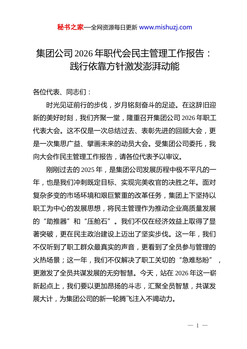 秘书之家—全网资源每日更新 www.mishuzj.com集团公司 2026 年职代会民主管理工作报告:践行依靠方针激发澎湃动能各位代表、同志们:时光见证前行的步伐,岁月铭刻奋斗的足迹。在这辞旧迎新的美好时刻,我们齐聚一堂,隆重召开集团公司 2026 年职工代表大会。这不仅是一次总结过去、表彰先进的回顾大会,更是一次集思广益、擘画未来的动员大会。受集团公司委托,我向大会作民主管理工作报告,请各位代表予以审议。刚刚过去的 2025 年,是集团公司发展历程中极不平凡的一年,也是我们冲刺既定目标、实现完美收官的决胜之年。面对复杂多变的市场环境和艰巨繁重的改革任务,集团上下坚持以职工为中心的发展思想,将民主管理作为推动企业高质量发展的“助推器”和“压舱石”。我们不仅在经济效益上取得了显著突破,更在民主政治建设上迈出了坚实步伐。这一年,我们不仅听到了职工群众最真实的声音,更看到了全员参与管理的火热场景;这一年,我们不仅解决了职工关切的“急难愁盼”,更激发了全员共谋发展的无穷智慧。今天,站在 2026 年这一崭新起点上,我们要以更加昂扬的斗志,汇聚全员智慧,共谋发展大计,为集团公司的新一轮腾飞注入不竭动力。— 1 —秘书之家—全网资源每日更新 www.mishuzj.com一、回首二〇二五,我们坚持“强基固本”不动摇,民主根基在深耕细作中愈加坚实2025 年,我们紧紧围绕集团中心工作,以规范化、制度化、程序化为抓手,不断夯实民主管理基础。通过完善顶层设计、畅通诉求渠道、强化建章立制,确保了民主管理工作有章可循、有据可依,让职工当家作主的权利得到了更加充分的体现。(一)完善制度体系,织密“规范运行”的经纬网制度是管理的基石,规范是运行的保障。2025 年,集团公司全面梳理并修订了民主管理相关制度 xx 项,构建起一套纵向到底、横向到边的制度体系。首先,我们强化了职代会制度的刚性约束,明确规定涉及企业重大决策和职工切身利益的重大事项,必须经职代会审议通过,确保了程序的合法性和决策的科学性。其次,我们建立了民主管理质量评估机制,制定了详细的量化考核标准,对各基层单位的职代会召开情况、提案落实情况进行全过程跟踪考核,并将考核结果纳入 dj 工作责任制评价体系。再次,我们规范了职工董事、职工监事履职管理办法,通过定期开展履职培训和述职评议,提升了源头参与的能力和水平,确保职工代表在董事会、监事会中能够“发得出声、说得上话、管得住事”。(二)畅通参与渠道,架起“上通下达”的连心桥— 2 —秘书之家—全网资源每日更新 www.mishuzj.com沟通产生理解,参与激发热情。过去一年,我们致力于打破信息壁垒,拓宽职工参与管理的广度和深度。一方面,我们创新推行了“直通车”机制,设立了董事长信箱、总经理接待日以及“我为企业献一策”线上平台,累计收集职工合理化建议 xx 条,采纳实施 xx 条,创造经济效益 xx 万元。这不仅让职工的智慧转化为真金白银,更让职工感受到了被尊重、被重视的成就感。另一方面,我们深化了厂务公开工作,坚持“公开是常态、不公开是例外”的原则,利用企业内网、公开栏、微信公众号等载体,及时公开企业改革发展的难点、职工关心的热点以及廉洁从业的关键点。全年累计公开事项 xx 项,满意度测评达到 xx%以上,真正做到了给职工一个明白,还管理者一个清白。(三)提升提案质量,打造“落地有声”的回音壁提案是职工代表履行职责的重要载体,也是民主管理成效的直接体现。2025 年,我们坚持“重数量更重质量、重答复更重落实”的导向,推动提案工作提质增效。一是严把立案关,在职代会召开前夕,组织专门力量深入基层开展调研,指导代表围绕企业转型升级、降本增效、安全生产等核心议题撰写提案,确保提案言之有物、切中肯綮。二是强化办理关,建立了“分级负责、归口办理、定期督办、结果反馈”的闭环管理机— 3 —秘书之家—全网资源每日更新 www.mishuzj.com制,对 xx 件立案提案实行清单化管理,明确责任人和完成时限。三是注重反馈关,定期召开提案办理面对面沟通会,邀请提议代表与承办部门直接对话,不仅要说明“办得怎么样...