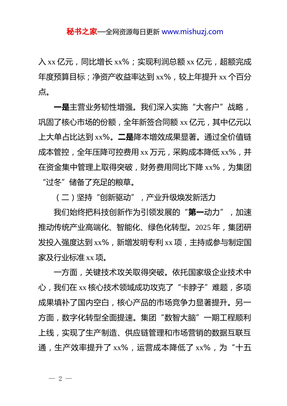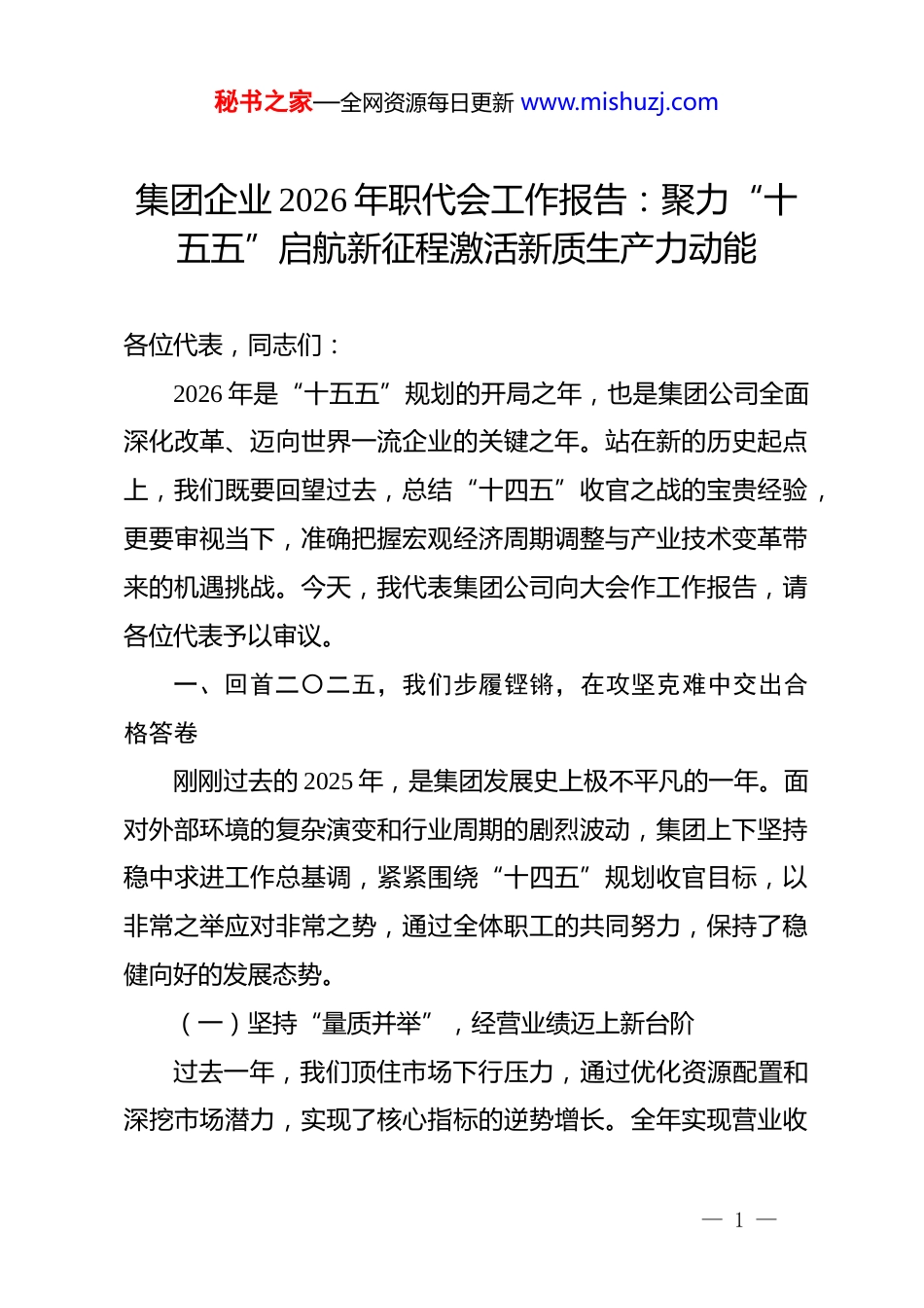 秘书之家—全网资源每日更新 www.mishuzj.com集团企业 2026 年职代会工作报告:聚力“十五五”启航新征程激活新质生产力动能各位代表,同志们:2026 年是“十五五”规划的开局之年,也是集团公司全面深化改革、迈向世界一流企业的关键之年。站在新的历史起点上,我们既要回望过去,总结“十四五”收官之战的宝贵经验,更要审视当下,准确把握宏观经济周期调整与产业技术变革带来的机遇挑战。今天,我代表集团公司向大会作工作报告,请各位代表予以审议。一、回首二〇二五,我们步履铿锵,在攻坚克难中交出合格答卷刚刚过去的 2025 年,是集团发展史上极不平凡的一年。面对外部环境的复杂演变和行业周期的剧烈波动,集团上下坚持稳中求进工作总基调,紧紧围绕“十四五”规划收官目标,以非常之举应对非常之势,通过全体职工的共同努力,保持了稳健向好的发展态势。(一)坚持“量质并举”,经营业绩迈上新台阶过去一年,我们顶住市场下行压力,通过优化资源配置和深挖市场潜力,实现了核心指标的逆势增长。全年实现营业收— 1 —秘书之家—全网资源每日更新 www.mishuzj.com入 xx 亿元,同比增长 xx%;实现利润总额 xx 亿元,超额完成年度预算目标;净资产收益率达到 xx%,较上年提升 xx 个百分点。一是主营业务韧性增强。我们深入实施“大客户”战略,巩固了核心市场的份额,全年新签合同额 xx 亿元,其中亿元以上大单占比达到 xx%。二是降本增效成果显著。通过全价值链成本管控,全年压降可控费用 xx 万元,采购成本降低 xx%,并在资金集中管理上取得突破,财务费用同比下降 xx%,为集团“过冬”储备了充足的粮草。(二)坚持“创新驱动”,产业升级焕发新活力我们始终把科技创新作为引领发展的“第一动力”,加速推动传统产业高端化、智能化、绿色化转型。2025 年,集团研发投入强度达到 xx%,新增发明专利 xx 项,主持或参与制定国家及行业标准 xx 项。一方面,关键技术攻关取得突破。依托国家级企业技术中心,我们在 xx 核心技术领域成功攻克了“卡脖子”难题,多项成果填补了国内空白,核心产品的市场竞争力显著提升。另一方面,数字化转型全面提速。集团“数智大脑”一期工程顺利上线,实现了生产制造、供应链管理和市场营销的数据互联互通,生产效率提升了 xx%,运营成本降低了 xx%,为“十五— 2 —秘书之家—全网资源每日更新 www.mishuzj.com五”数字化战略落地奠定了坚实基础。(三)坚持“深化改革”,体制机制释放新效能我们以国企改革深化提升行动为抓手,动真碰硬破除体制机制障碍,企业治理效能持续提升。2025 年,集团完成了所属xx 家子企业的专业化整合,主责主业更加清晰,资源配置效率大幅提高。首先,三项制度改革走向深水区。全面推行经理层成员任期制和契约化管理,管理人员末等调整和不胜任退出人数占比达到 xx%,真正实现了“干部能上能下”。其次,市场化激励机制更加灵活。我们在 xx 个核心业务单元实施了超额利润分享计划,对关键技术人才实施了项目跟投机制,极大激发了核心骨干的干事创业热情。(四)坚持“以人为本”,民生福祉达到新水平我们始终牢记“企业发展依靠职工、发展成果由职工共享”的理念,在企业效益增长的同时,持续提升职工获得感、幸福感、安全感。一是收入分配向基层倾斜。2025 年,在岗职工年人均工资增长 xx%,其中一线技能人才薪酬增幅高于平均水平 xx 个百分点。二是职工关爱体系更加完善。全年投入 xx 万元用于改善一线职工生产生活条件,解决了 xx 名职工的住房困难问题,并在— 3 —秘书之家—全网资源每日更新 www.mishuzj.comxx 个基层单位新建了“职工小家”。三是民主管理渠道畅通有效。职代会提案办结率达到 100%,涉及职工切身利益的重大事项均经过职代会审议通过,和谐劳动关系进一步巩固。二、正视短板不足,我们清醒坚定,在对标一流中找准差距在肯定成绩的同时,我们必须保持清醒头脑,深刻认识到集团发展中还存在不少矛盾和问题,主要表现在以下三个方面:(一)市场竞争能力仍需提升面对行业存量博弈的严峻形势,我们的市场敏锐度还不够高,商业模式...