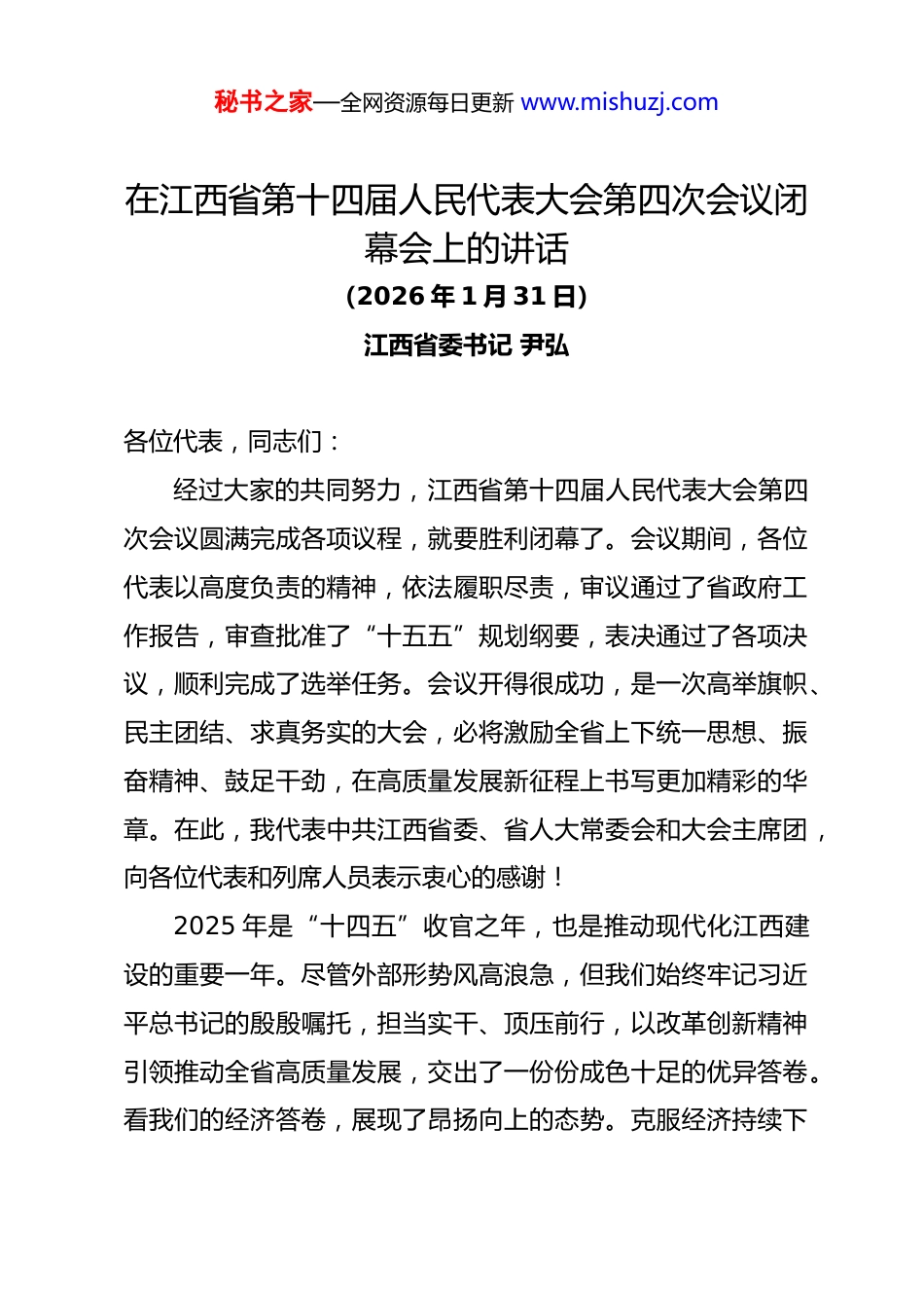 秘书之家—全网资源每日更新 www.mishuzj.com在江西省第十四届人民代表大会第四次会议闭幕会上的讲话(2026 年 1 月 31 日)江西省委书记 尹弘各位代表,同志们:经过大家的共同努力,江西省第十四届人民代表大会第四次会议圆满完成各项议程,就要胜利闭幕了。会议期间,各位代表以高度负责的精神,依法履职尽责,审议通过了省政府工作报告,审查批准了“十五五”规划纲要,表决通过了各项决议,顺利完成了选举任务。会议开得很成功,是一次高举旗帜、民主团结、求真务实的大会,必将激励全省上下统一思想、振奋精神、鼓足干劲,在高质量发展新征程上书写更加精彩的华章。在此,我代表中共江西省委、省人大常委会和大会主席团,向各位代表和列席人员表示衷心的感谢!2025 年是“十四五”收官之年,也是推动现代化江西建设的重要一年。尽管外部形势风高浪急,但我们始终牢记习近平总书记的殷殷嘱托,担当实干、顶压前行,以改革创新精神引领推动全省高质量发展,交出了一份份成色十足的优异答卷。看我们的经济答卷,展现了昂扬向上的态势。克服经济持续下秘书之家—全网资源每日更新 www.mishuzj.com行带来的不利影响,主要指标增速跑赢全国,去年 GDP 增长5.2%、总量达到 3.6 万亿元,连续 10 个季度保持总体向好势头,规上工业增加值增长 7.5%、总量达到 1.2 万亿元左右,有色金属产业营收突破万亿元大关,研发投入强度首次突破2%,“1269”行动正在持续向纵深推进。看我们的改革答卷,形成了多点突破的格局。绿色低碳发展、科技创新和产业创新深度融合等重点领域改革取得突破性进展,293 项年度改革任务顺利完成,特别是以改革优环境、增动力,全省市场环境、法治环境、创新环境、政务环境指标均进入了全国前 10,民间投资逆势增长 2.7%、高出全国 9.1 个百分点,越来越多的企业家给江西发展投下“信任票”。看我们的民生答卷,收获了万家灯火的温暖。10 件民生实事全部兑现,城乡居民人均可支配收入稳步增长,就业岗位、托幼园位、上学学位、医疗床位、养老点位、停车车位等一批“大事小情”得到有效解决,基层治理水平全面提高,全省公众安全感达 99.3%、创历史新高,“民生温度”更加可感可及!在经济社会发展的火热实践中,广大干部作风能力得到了锤炼提升,干事创业的精气神明显提振。如今的江西,人心齐、干劲足、风气正,可以说是长风破浪、未来可期!各位代表,同志们!回望“十四五”的五年,走过的每一秘书之家—全网资源每日更新 www.mishuzj.com年都不容易,迈出的每一步都挥洒了艰辛的汗水,极不平凡、令人难忘。这五年,我们以铁肩担使命,接续奋斗、砥砺前行,全力克服世纪疫情和外部不利环境影响,如期打赢脱贫攻坚战,与全国同步全面建成小康社会,推动经济发展量质齐升,工业实力大幅增强,创新能力显著提高,人民生活全面改善,现代化江西建设迈出坚实步伐。这份实打实、沉甸甸的成绩单,根本在于以习近平同志为核心的党中央领航掌舵,在于习近平新时代中国特色社会主义思想科学指引,也是全省干部群众同舟共济、风雨兼程,用勤劳和智慧拼出来、干出来的!近年来,全省各级人大和人大代表围绕中心大局,忠实履行宪法法律赋予的职责,推动各项工作迈上了新台阶。一是服务大局有力有效。锚定人大在推进现代化江西建设中的使命任务,围绕“十五五”规划编制、重大项目建设、改革发展稳定等谋划推进工作,确保党的决策部署在人大工作中得到全面贯彻和有效执行。二是履职为民用心用情。把增进民生福祉作为工作的出发点和落脚点,聚焦群众急难愁盼开展调查研究,强化法治保障和跟踪问效,助推办成了一批惠泽群众的民生实事。三是守正创新可圈可点。探索推进“小快灵”“小切口”立法,不断提高立法质量,优化监督工作方式方法,健全民主民意表达平台,有效激发代表履职活力,进一步丰富全过程人民民主的江西实践,秘书之家—全网资源每日更新 www.mishuzj.com为全省高质量发展作出了积极贡献!各位代表,同志们!2026 年是“十五五”开局之年。五年看头年,开局最关键。关于“十五五”和今年工作,省委十五届九次全会、省委经济工作会...