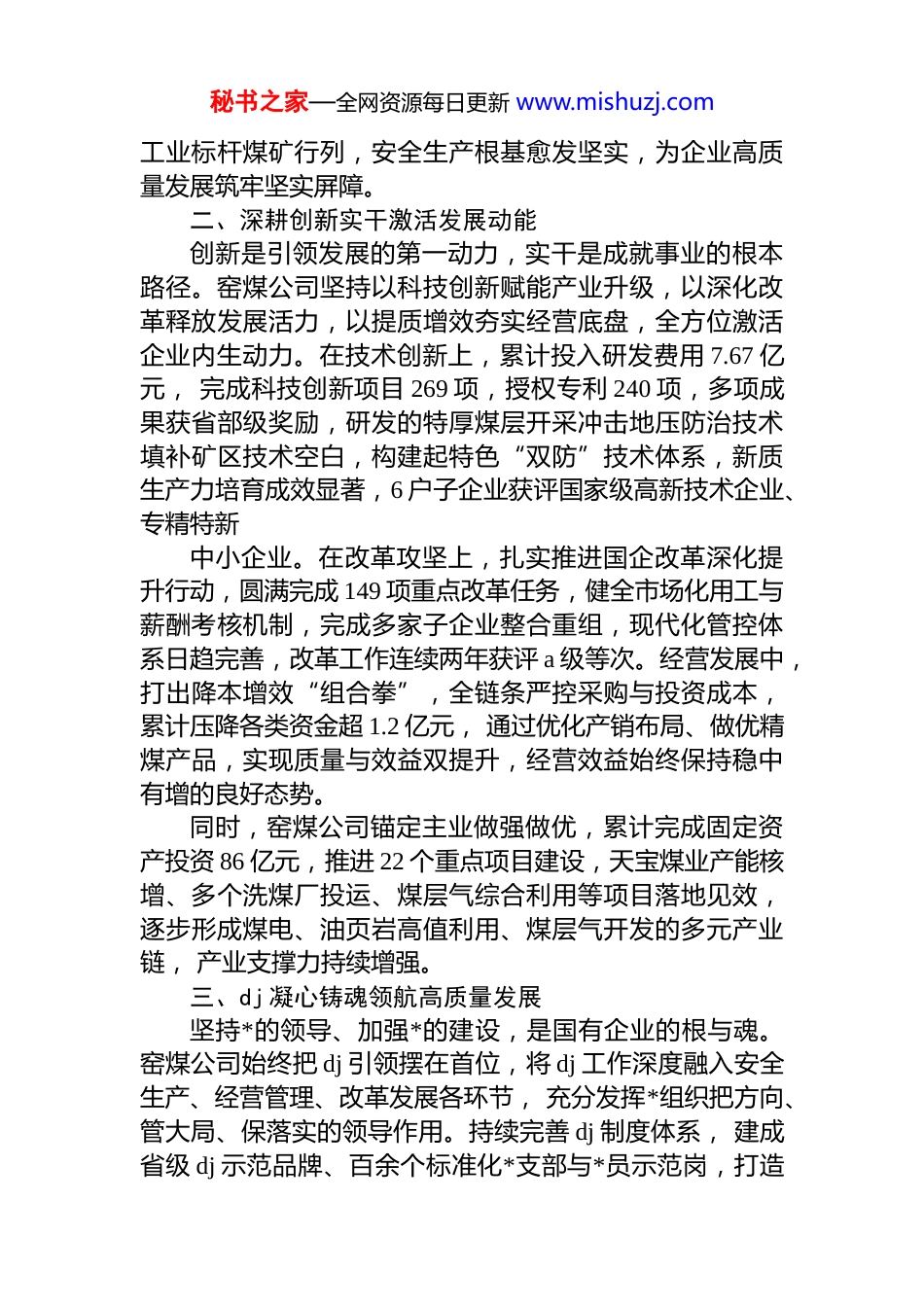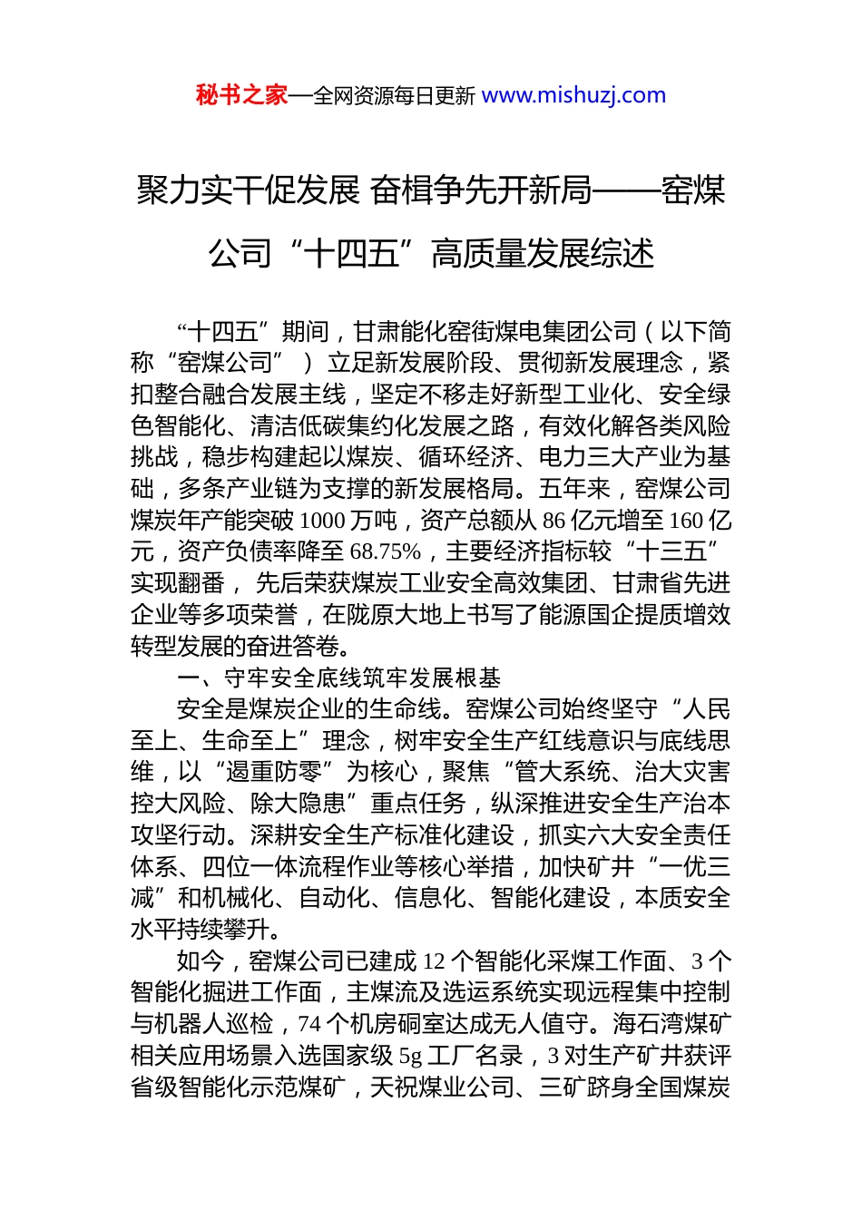 秘书之家—全网资源每日更新 www.mishuzj.com聚力实干促发展 奋楫争先开新局——窑煤公司“十四五”高质量发展综述“十四五”期间,甘肃能化窑街煤电集团公司(以下简称“窑煤公司”) 立足新发展阶段、贯彻新发展理念,紧扣整合融合发展主线,坚定不移走好新型工业化、安全绿色智能化、清洁低碳集约化发展之路,有效化解各类风险挑战,稳步构建起以煤炭、循环经济、电力三大产业为基础,多条产业链为支撑的新发展格局。五年来,窑煤公司煤炭年产能突破 1000 万吨,资产总额从 86 亿元增至 160 亿元,资产负债率降至 68.75%,主要经济指标较“十三五”实现翻番, 先后荣获煤炭工业安全高效集团、甘肃省先进企业等多项荣誉,在陇原大地上书写了能源国企提质增效转型发展的奋进答卷。一、守牢安全底线筑牢发展根基安全是煤炭企业的生命线。窑煤公司始终坚守“人民至上、生命至上”理念,树牢安全生产红线意识与底线思维,以“遏重防零”为核心,聚焦“管大系统、治大灾害控大风险、除大隐患”重点任务,纵深推进安全生产治本攻坚行动。深耕安全生产标准化建设,抓实六大安全责任体系、四位一体流程作业等核心举措,加快矿井“一优三减”和机械化、自动化、信息化、智能化建设,本质安全水平持续攀升。如今,窑煤公司已建成 12 个智能化采煤工作面、3 个智能化掘进工作面,主煤流及选运系统实现远程集中控制与机器人巡检,74 个机房硐室达成无人值守。海石湾煤矿相关应用场景入选国家级 5g 工厂名录,3 对生产矿井获评省级智能化示范煤矿,天祝煤业公司、三矿跻身全国煤炭秘书之家—全网资源每日更新 www.mishuzj.com工业标杆煤矿行列,安全生产根基愈发坚实,为企业高质量发展筑牢坚实屏障。二、深耕创新实干激活发展动能创新是引领发展的第一动力,实干是成就事业的根本路径。窑煤公司坚持以科技创新赋能产业升级,以深化改革释放发展活力,以提质增效夯实经营底盘,全方位激活企业内生动力。在技术创新上,累计投入研发费用 7.67 亿元, 完成科技创新项目 269 项,授权专利 240 项,多项成果获省部级奖励,研发的特厚煤层开采冲击地压防治技术填补矿区技术空白,构建起特色“双防”技术体系,新质生产力培育成效显著,6 户子企业获评国家级高新技术企业、专精特新中小企业。在改革攻坚上,扎实推进国企改革深化提升行动,圆满完成 149 项重点改革任务,健全市场化用工与薪酬考核机制,完成多家子企业整合重组,现代化管控体系日趋完善,改革工作连续两年获评 a 级等次。经营发展中,打出降本增效“组合拳”,全链条严控采购与投资成本,累计压降各类资金超 1.2 亿元, 通过优化产销布局、做优精煤产品,实现质量与效益双提升,经营效益始终保持稳中有增的良好态势。同时,窑煤公司锚定主业做强做优,累计完成固定资产投资 86 亿元,推进 22 个重点项目建设,天宝煤业产能核增、多个洗煤厂投运、煤层气综合利用等项目落地见效,逐步形成煤电、油页岩高值利用、煤层气开发的多元产业链, 产业支撑力持续增强。三、dj 凝心铸魂领航高质量发展坚持*的领导、加强*的建设,是国有企业的根与魂。窑煤公司始终把 dj 引领摆在首位,将 dj 工作深度融入安全生产、经营管理、改革发展各环节, 充分发挥*组织把方向、管大局、保落实的领导作用。持续完善 dj 制度体系, 建成省级 dj 示范品牌、百余个标准化*支部与*员示范岗,打造秘书之家—全网资源每日更新 www.mishuzj.com的特色 dj 工作模式与思政载体登上省部级主流媒体,dj 引领发展的效能充分彰显。潮涌扬帆正当时,砥砺奋进启新程。站在新的发展起点,窑煤公司将始终锚定高质量发展目标,紧扣安全为本效益为重、精细管理、创新驱动、稳健发展的总体思路,做精做专做强煤炭产业,持续推动资源利用向绿色清洁高效转变、产品生产向高附加值转变、产业发展向信息智能化转变跃升。未来,窑煤公司将以打造同行业先进企业为目标,争做高质量发展践行者、智慧矿山示范者、资源绿色利用引领者,持续深耕主业、勇毅创新,为甘肃能化集团建设现代化综合能源企业和全省经济社会发展贡献窑煤力量。