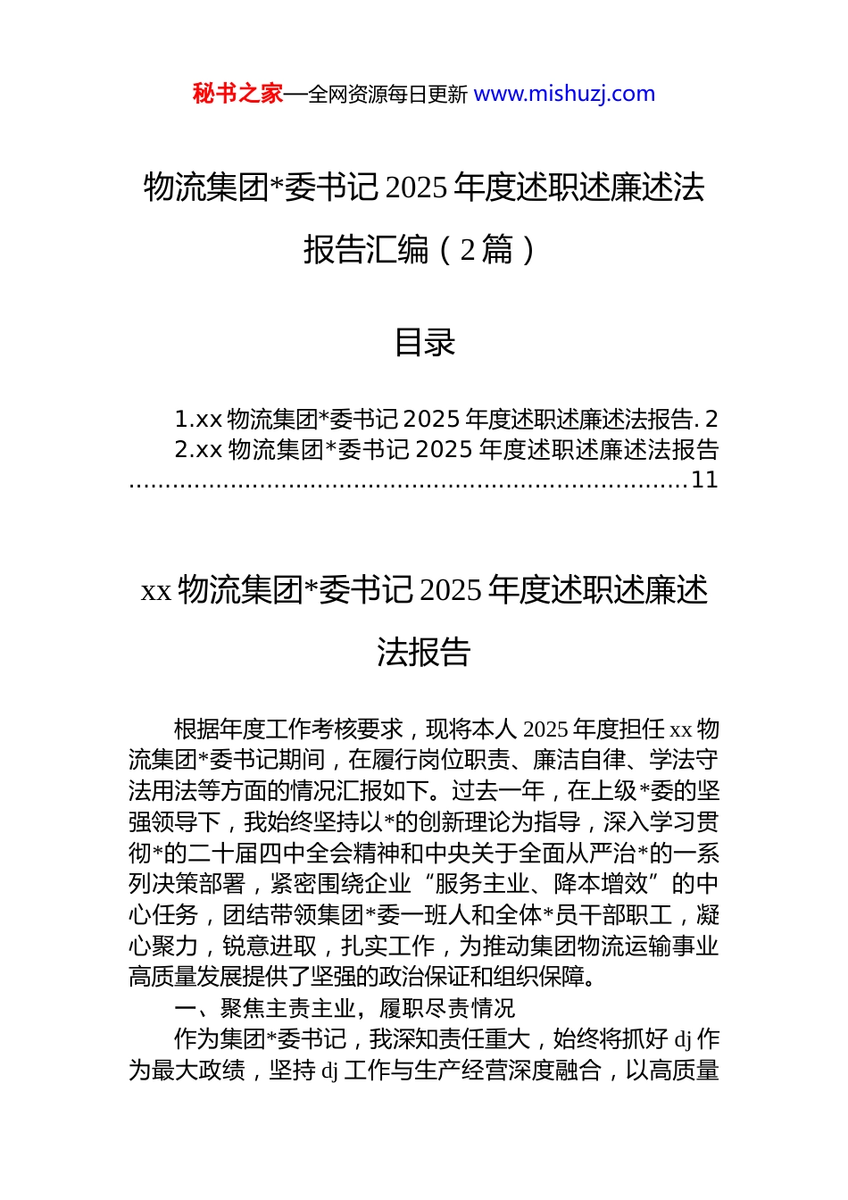 秘书之家—全网资源每日更新 www.mishuzj.com物流集团*委书记 2025 年度述职述廉述法报告汇编(2 篇)目录1.xx 物流集团*委书记 2025 年度述职述廉述法报告. 22.xx 物流集团*委书记 2025 年度述职述廉述法报告.............................................................................11xx 物流集团*委书记 2025 年度述职述廉述法报告根据年度工作考核要求,现将本人 2025 年度担任 xx 物流集团*委书记期间,在履行岗位职责、廉洁自律、学法守法用法等方面的情况汇报如下。过去一年,在上级*委的坚强领导下,我始终坚持以*的创新理论为指导,深入学习贯彻*的二十届四中全会精神和中央关于全面从严治*的一系列决策部署,紧密围绕企业“服务主业、降本增效”的中心任务,团结带领集团*委一班人和全体*员干部职工,凝心聚力,锐意进取,扎实工作,为推动集团物流运输事业高质量发展提供了坚强的政治保证和组织保障。一、聚焦主责主业,履职尽责情况作为集团*委书记,我深知责任重大,始终将抓好 dj 作为最大政绩,坚持 dj 工作与生产经营深度融合,以高质量秘书之家—全网资源每日更新 www.mishuzj.comdj 引领保障高质量发展。(一)强化政治引领,把稳企业发展方向我始终将政治建设摆在首位,带头深刻领悟“两个确立”的决定性意义,增强“四个意识”、坚定“四个自信”、做到“两个维护”,确保集团各项工作始终沿着正确政治方向前进。深化理论武装,统一思想认识。坚持将学习贯彻*的创新理论作为首要政治任务,特别是组织集团上下深入学习领会*的二十届四中全会关于坚持和完善中国特色社会主义制度、推进国家治理体系和治理能力现代化的重大部署,引导*员干部深刻理解其核心要义和实践要求,自觉将思想和行动统一到*中央决策部署上来。通过*委理论学习中心组学习、专题研讨、辅导报告、个人自学等多种形式,不断提升班子成员和*员干部的政治判断力、政治领悟力、政治执行力。将学习成果转化为推动工作的具体思路和举措确保中央精神和上级要求在企业不折不扣落地生根。发挥核心作用,科学决策施策。严格执行*委议事规则和“三重一大”决策制度,坚持民主集中制,凡属重大决策、重要干部任免、重大项目安排和大额度资金运作等事项,均提交*委会集体研究决定,确保决策的科学化、民主化、规范化。2025 年,集团*委共召开*委会 xx 次,研究议题 xx 项,其中涉及物流发展战略、重大投资、改革创新等关键事项 xx 项,有效发挥了*委把方向、管大局、促落实的领导作用。围绕中心工作,服务发展大局。紧密围绕“服务主业、降本增效”核心目标,将 dj 工作深度融入物流运输各环节引导各级*组织和广大*员在保供保障、成本管控、创新升级等重点任务中冲锋在前、担当作为。例如,在“织密保供网络,筑牢运行根基”方面,*委指导相关支部开展“dj+汽运卸车服务”等专项行动,将*的组织优势转化为攻坚克难的强大力量,确保了全年焦炭、熔剂 4 小时卸车率均达秘书之家—全网资源每日更新 www.mishuzj.com98%以上,物料配送准确率 100%。在推动“精准降本增效,激活管控动能”中,*委倡导“算账经营”理念,鼓励*员在优化运输结构、盘活资产、提升设备效能等方面献计献策,助力全年全口径物流费用较 2024 年降低 9.48%。(二)夯实组织基础,建强战斗堡垒坚持大抓基层的鲜明导向,以提升组织力为重点,不断增强基层*组织的政治功能和组织功能。规范组织建设。严格落实*的组织生活制度,督促指导各基层*支部认真落实“三会一课”、主题*日、组织生活会、民主评议*员等制度,不断提升组织生活的质量和效果。优化基层*组织设置,确保业务开展到哪里,*的组织和工作就覆盖到哪里。加强队伍建设。高度重视*员教育管理和干部人才培养工作。认真落实新时代*的组织路线,坚持*管干部原则,突出政治标准,严格按照程序选拔任用干部。深入实施“人才强企”战略,*委牵头制定并推动落实《人才梯队建设方案》《学习型团队建设方案》,通过搭建分层人才库开展定向专班培训 20 次、内训师分享 19 场、举办机车司机等技能比武 9 次,着力打造一支“专才+综合...
