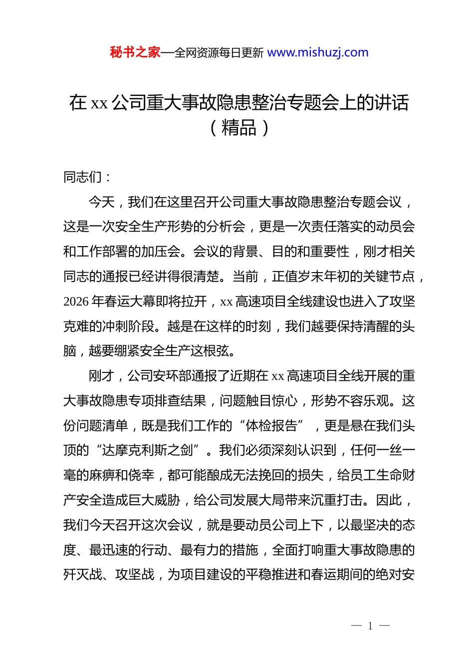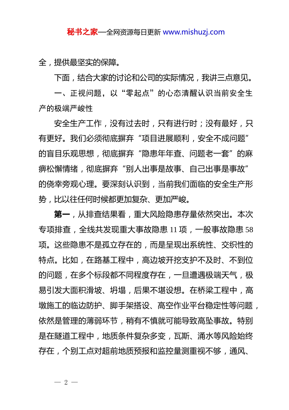 秘书之家—全网资源每日更新 www.mishuzj.com在 xx 公司重大事故隐患整治专题会上的讲话(精品)同志们:今天,我们在这里召开公司重大事故隐患整治专题会议,这是一次安全生产形势的分析会,更是一次责任落实的动员会和工作部署的加压会。会议的背景、目的和重要性,刚才相关同志的通报已经讲得很清楚。当前,正值岁末年初的关键节点,2026 年春运大幕即将拉开,xx 高速项目全线建设也进入了攻坚克难的冲刺阶段。越是在这样的时刻,我们越要保持清醒的头脑,越要绷紧安全生产这根弦。刚才,公司安环部通报了近期在 xx 高速项目全线开展的重大事故隐患专项排查结果,问题触目惊心,形势不容乐观。这份问题清单,既是我们工作的“体检报告”,更是悬在我们头顶的“达摩克利斯之剑”。我们必须深刻认识到,任何一丝一毫的麻痹和侥幸,都可能酿成无法挽回的损失,给员工生命财产安全造成巨大威胁,给公司发展大局带来沉重打击。因此,我们今天召开这次会议,就是要动员公司上下,以最坚决的态度、最迅速的行动、最有力的措施,全面打响重大事故隐患的歼灭战、攻坚战,为项目建设的平稳推进和春运期间的绝对安— 1 —秘书之家—全网资源每日更新 www.mishuzj.com全,提供最坚实的保障。下面,结合大家的讨论和公司的实际情况,我讲三点意见。一、正视问题,以“零起点”的心态清醒认识当前安全生产的极端严峻性安全生产工作,没有过去时,只有进行时;没有最好,只有更好。我们必须彻底摒弃“项目进展顺利,安全不成问题”的盲目乐观思想,彻底摒弃“隐患年年查、问题老一套”的麻痹松懈情绪,彻底摒弃“别人出事是故事、自己出事是事故”的侥幸旁观心理。要深刻认识到,当前我们面临的安全生产形势,比以往任何时候都更加复杂、更加严峻。第一,从排查结果看,重大风险隐患存量依然突出。本次专项排查,全线共发现重大事故隐患 11 项,一般事故隐患 58项。这些隐患不是孤立存在的,而是呈现出系统性、交织性的特点。比如,在路基工程中,高边坡开挖支护不及时、不到位的问题,在多个标段都不同程度存在,一旦遭遇极端天气,极易引发大面积滑坡、坍塌,后果不堪设想。在桥梁工程中,高墩施工的临边防护、脚手架搭设、高空作业平台稳定性等问题,依然是管理的薄弱环节,稍有不慎就可能导致高坠事故。特别是在隧道工程中,地质条件复杂多变,瓦斯、涌水等风险始终存在,个别工点对超前地质预报和监控量测重视不够,通风、— 2 —秘书之家—全网资源每日更新 www.mishuzj.com防排水等保障措施未能完全与开挖作业面同步跟进,这是在拿生命当儿戏!这些问题,每一个都可能成为压垮安全堤坝的“最后一根稻草”。我们必须清醒地看到,这些隐患的存在,充分暴露了我们的安全管理体系在某些环节还存在“中梗阻”,现场执行力还存在“逐级递减”的现象。第二,从思想根源看,“重生产、轻安全”的惯性思维依然顽固。当前项目建设任务重、工期紧,部分管理人员和施工单位的负责同志,脑子里想的更多的是进度、是产值,把安全生产简单地视为“麻烦事”、“绊脚石”。这种思想偏差直接导致了安全投入不足、安全培训走过场、安全措施不落实等一系列问题。有的单位在制定施工方案时,对安全技术措施考虑不周、论证不充分;有的现场管理人员,对违章指挥、违规作业“睁一只眼闭一只眼”,甚至默许纵容;有的基层作业人员,安全意识淡薄,缺乏基本的自我保护能力,习惯性违章屡禁不止。思想上的“病毒”不清除,行为上的“顽疾”就难以根治。我们必须认识到,安全是“1”,其他的一切都是跟在后面的“0”。没有了安全这个“1”,再多的产值、再快的进度,都将失去意义,甚至变成负资产。第三,从管理机制看,系统性的风险辨识和管控能力依然不足。从这次排查的情况来看,我们发现的一些重大隐患,并— 3 —秘书之家—全网资源每日更新 www.mishuzj.com非是新问题,有些甚至是反复出现、屡改屡犯的“老面孔”。这说明什么?说明我们的管理还停留在“头痛医头、脚痛医脚”的浅层次,没有真正深入到问题的根源,没有建立起一套能够从根本上预防和消除隐患的长效机制。比如,会议要求要系统...