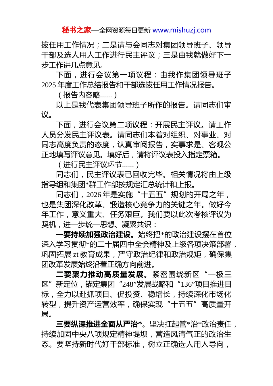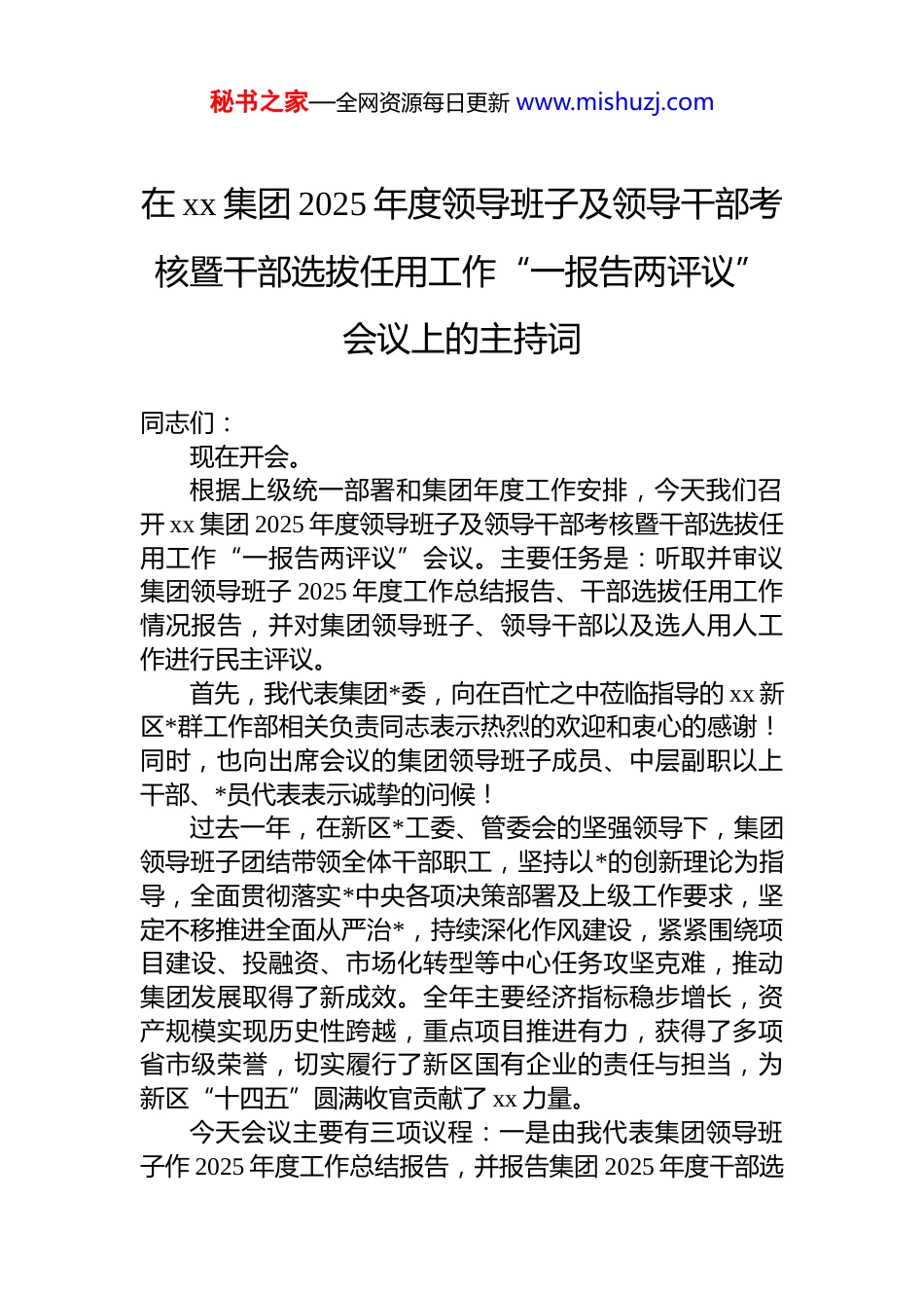 秘书之家—全网资源每日更新 www.mishuzj.com在 xx 集团 2025 年度领导班子及领导干部考核暨干部选拔任用工作“一报告两评议”会议上的主持词同志们:现在开会。根据上级统一部署和集团年度工作安排,今天我们召开 xx 集团 2025 年度领导班子及领导干部考核暨干部选拔任用工作“一报告两评议”会议。主要任务是:听取并审议集团领导班子 2025 年度工作总结报告、干部选拔任用工作情况报告,并对集团领导班子、领导干部以及选人用人工作进行民主评议。首先,我代表集团*委,向在百忙之中莅临指导的 xx 新区*群工作部相关负责同志表示热烈的欢迎和衷心的感谢!同时,也向出席会议的集团领导班子成员、中层副职以上干部、*员代表表示诚挚的问候!过去一年,在新区*工委、管委会的坚强领导下,集团领导班子团结带领全体干部职工,坚持以*的创新理论为指导,全面贯彻落实*中央各项决策部署及上级工作要求,坚定不移推进全面从严治*,持续深化作风建设,紧紧围绕项目建设、投融资、市场化转型等中心任务攻坚克难,推动集团发展取得了新成效。全年主要经济指标稳步增长,资产规模实现历史性跨越,重点项目推进有力,获得了多项省市级荣誉,切实履行了新区国有企业的责任与担当,为新区“十四五”圆满收官贡献了 xx 力量。今天会议主要有三项议程:一是由我代表集团领导班子作 2025 年度工作总结报告,并报告集团 2025 年度干部选秘书之家—全网资源每日更新 www.mishuzj.com拔任用工作情况;二是请与会同志对集团领导班子、领导干部及选人用人工作进行民主评议;三是由我就做好下一步工作讲几点意见。下面,进行会议第一项议程:由我作集团领导班子2025 年度工作总结报告和干部选拔任用工作情况报告。(报告内容略……)以上是我代表集团领导班子所作的报告。请同志们审议。下面,进行会议第二项议程:开展民主评议。请工作人员分发民主评议表。请同志们本着对组织、对事业、对同志高度负责的态度,认真审阅报告,实事求是、客观公正地填写评议意见。填好后,请将评议表投入指定票箱。(进行民主评议环节……)同志们,民主评议表已回收完毕。相关情况将由上级指导组和集团*群工作部按规定汇总统计和上报。同志们,2026 年是实施“十五五”规划的开局之年,也是集团深化改革、锻造核心竞争力的关键之年。做好今年工作,意义重大、任务艰巨。我们要以此次考核评议为契机,进一步统一思想、凝聚共识:一要持续加强政治建设。始终把*的政治建设摆在首位深入学习贯彻*的二十届四中全会精神及上级各项决策部署,巩固拓展 zt 教育成果,严守政治纪律和政治规矩,确保集团改革发展始终沿着正确方向前进。二要聚力推动高质量发展。紧密围绕新区“一极三区”新定位,锚定集团“248”发展战略和“136”项目推进目标,全力以赴抓项目、促投资、稳增长,持续深化市场化转型,提升资产运营效率,确保实现“十五五”高质量开局。三要纵深推进全面从严治*。坚决扛起管*治*政治责任,持续加固中央八项规定精神堤坝,营造风清气正的政治生态。要坚持新时代好干部标准,树立正确选人用人导向,秘书之家—全网资源每日更新 www.mishuzj.com进一步健全培养选拔、管理监督机制,打造忠诚干净担当的高素质专业化干部队伍。四要狠抓工作落实。集团领导班子要带头担当作为,全体干部职工要提振精气神,以“时时放心不下”的责任感,紧盯年度目标任务,细化措施、压实责任、攻坚克难确保各项工作落到实处、取得实效。今天的会议议程已全部进行完毕。再次感谢新区*群工作部领导的莅临指导!感谢各位同志的认真参与和辛勤付出!散会。