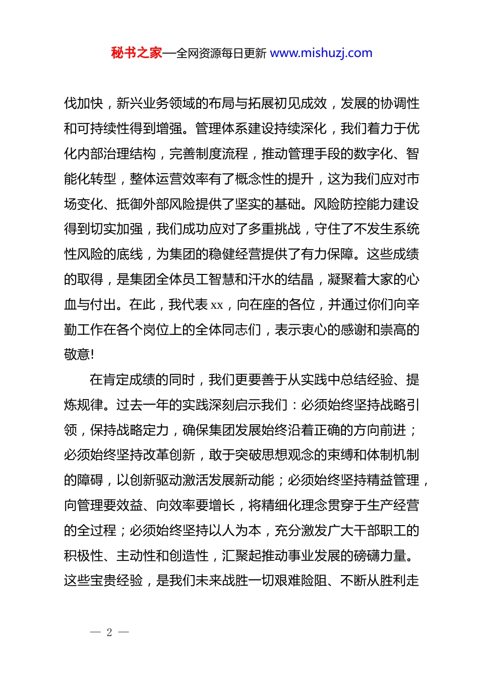 秘书之家—全网资源每日更新 www.mishuzj.com在 xx 集团 2026 年度工作推进暨管理质效提升会议上的讲话同志们:大家好。今天,我们在这里召开集团 2026 年度工作推进暨管理质效提升会议,时值岁首年初,这既是一次回顾总结、表彰先进的鼓劲会,更是一次分析形势、部署任务的动员会。本次会议的核心议题,是深入贯彻落实国家关于高质量发展的战略部署,全面审视我们当前面临的机遇与挑战,系统谋划新一年发展的目标、路径与举措,核心是聚焦“管理”与“质效”两大关键词,推动集团在新征程上开创新局面、实现新跨越。下面,我讲几点意见。第一,充分肯定过去一年的工作成绩,在总结经验中坚定发展信心刚刚过去的 2025 年,是集团发展史上极不平凡的一年。面对复杂多变的外部环境和艰巨繁重的发展任务,集团上下在 xx的坚强领导下,全体干部职工团结一心,攻坚克难,紧紧围绕年初制定的战略目标,扎实推进各项工作,取得了来之不易的成绩。我们的整体发展态势稳中向好,综合实力迈上了新台阶。产业结构调整取得了阶段性成果,传统业务板块的转型升级步— 1 —秘书之家—全网资源每日更新 www.mishuzj.com伐加快,新兴业务领域的布局与拓展初见成效,发展的协调性和可持续性得到增强。管理体系建设持续深化,我们着力于优化内部治理结构,完善制度流程,推动管理手段的数字化、智能化转型,整体运营效率有了概念性的提升,这为我们应对市场变化、抵御外部风险提供了坚实的基础。风险防控能力建设得到切实加强,我们成功应对了多重挑战,守住了不发生系统性风险的底线,为集团的稳健经营提供了有力保障。这些成绩的取得,是集团全体员工智慧和汗水的结晶,凝聚着大家的心血与付出。在此,我代表 xx,向在座的各位,并通过你们向辛勤工作在各个岗位上的全体同志们,表示衷心的感谢和崇高的敬意!在肯定成绩的同时,我们更要善于从实践中总结经验、提炼规律。过去一年的实践深刻启示我们:必须始终坚持战略引领,保持战略定力,确保集团发展始终沿着正确的方向前进;必须始终坚持改革创新,敢于突破思想观念的束缚和体制机制的障碍,以创新驱动激活发展新动能;必须始终坚持精益管理,向管理要效益、向效率要增长,将精细化理念贯穿于生产经营的全过程;必须始终坚持以人为本,充分激发广大干部职工的积极性、主动性和创造性,汇聚起推动事业发展的磅礴力量。这些宝贵经验,是我们未来战胜一切艰难险阻、不断从胜利走— 2 —秘书之家—全网资源每日更新 www.mishuzj.com向新的胜利的重要法宝,必须长期坚持,并在新的实践中不断丰富和发展。第二,深刻认识当前面临的形势任务,在分析挑战中增强忧患意识同志们,身处百年未有之大变局加速演进的时代,我们必须具备清醒的头脑和敏锐的洞察力,既要看到发展的光明前景,也要正视前进道路上的风险挑战。从宏观政策背景看,当前国家正处在转变发展方式、优化经济结构、转换增长动力的攻关期,一系列重大战略部署,如构建“双循环”新发展格局、推动数字经济与实体经济深度融合等,为我们提供了前所未有的发展机遇。这些宏观政策导向为我们指明了转型升级的方向,也为我们拓展新业务、开辟新赛道创造了有利条件。我们必须紧紧抓住政策窗口期,主动将自身发展融入国家战略大局,谋求更大的发展空间。然而,机遇与挑战并存。从外部环境看,全球经济格局深度调整,产业链、供应链面临重构,市场竞争日趋激烈。从内部发展看,我们也面临着一些不容忽视的突出问题。一是管理模式与高质量发展的要求还不完全适应。部分单位的管理方式仍然较为粗放,精细化、体系化管理水平有待提升,管理链条过长、响应速度偏慢的问题在一定程度上仍然存在。二是创新— 3 —秘书之家—全网资源每日更新 www.mishuzj.com能力仍需进一步加强。虽然我们取得了一定的技术进步,但在关键核心技术、颠覆性商业模式创新等方面,与行业领先水平相比仍有差距,创新驱动发展的引擎作用尚未得到充分发挥。这要求我们必须深刻理解并应用创新扩散理论等框架,加速新知识、新技术的内部转化与应用。三是风险防控体系仍需持续完善。随着集团业务领域的不断拓展,...