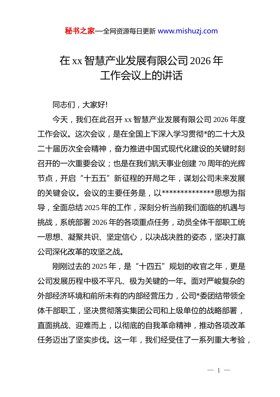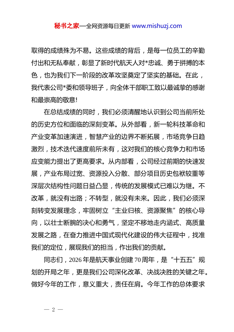 秘书之家—全网资源每日更新 www.mishuzj.com在 xx 智慧产业发展有限公司 2026 年工作会议上的讲话同志们,大家好!今天,我们在此召开 xx 智慧产业发展有限公司 2026 年度工作会议。这次会议,是在全国上下深入学习贯彻*的二十大及二十届历次全会精神,奋力推进中国式现代化建设的关键时刻召开的一次重要会议;也是在我们航天事业创建 70 周年的光辉节点,开启“十五五”新征程的开局之年,谋划公司未来发展的关键会议。会议的主要任务是,以**************思想为指导,全面总结 2025 年的工作,深刻分析当前我们面临的机遇与挑战,系统部署 2026 年的各项重点任务,动员全体干部职工统一思想、凝聚共识、坚定信心,以决战决胜的姿态,坚决打赢公司深化改革的攻坚之战。刚刚过去的 2025 年,是“十四五”规划的收官之年,更是公司发展历程中极不平凡、极为关键的一年。面对严峻复杂的外部经济环境和前所未有的内部经营压力,公司*委团结带领全体干部职工,坚决贯彻落实集团公司和上级单位的战略部署,直面挑战、迎难而上,以彻底的自我革命精神,推动各项改革任务迈出了坚实步伐。这一年,我们经受住了一系列重大考验,— 1 —秘书之家—全网资源每日更新 www.mishuzj.com取得的成绩殊为不易。这些成绩的背后,是每一位员工的辛勤付出和无私奉献,彰显了新时代航天人对*忠诚、勇于拼搏的本色,也为我们下一阶段的改革攻坚奠定了坚实的基础。在此,我代表公司*委和领导班子,向全体干部职工致以最诚挚的感谢和最崇高的敬意!在总结成绩的同时,我们必须清醒地认识到公司当前所处的历史方位和面临的深刻变革。从外部看,新一轮科技革命和产业变革加速演进,智慧产业的边界不断拓展,市场竞争日趋激烈,技术迭代速度前所未有,这对我们的核心竞争力和市场应变能力提出了更高要求。从内部看,公司经过前期的快速发展,产业布局过宽、资源投入分散、部分项目历史包袱较重等深层次结构性问题日益凸显,传统的发展模式已难以为继。不改革,就没有出路;不转型,就没有未来。因此,我们必须深刻转变发展理念,牢固树立“主业归核、资源聚焦”的核心导向,以壮士断腕的决心和勇气,坚定不移地走内涵式、高质量发展之路,在奋力推进中国式现代化建设的伟大征程中,找准我们的定位,展现我们的担当,作出我们的贡献。同志们,2026 年是航天事业创建 70 周年,是“十五五”规划的开局之年,更是我们公司深化改革、决战决胜的关键之年。做好今年的工作,意义重大,责任在肩。今年工作的总体要求— 2 —秘书之家—全网资源每日更新 www.mishuzj.com是:以**************思想为指导,全面贯彻*的二十大和二十届历次全会及中央经济工作会议精神,坚决落实******对中央企业和航天事业的****批示精神,时刻铭记*中央对航天军工的殷殷重托,全面落实集团公司和上级单位的战略部署,深入推动产业结构优化,坚决完成深化改革任务,高效统筹发展与安全,奋力实现“十五五”时期的良好开局。围绕这一总体要求,我们确立了 2026 年工作的总体目标,即“三个确保”:一是确保全面完成深化改革的各项硬任务,实现公司治理结构和产业布局的根本性优化;二是确保全面完成年度经营业绩考核指标,实现质的有效提升和量的合理增长;三是确保不发生任何纪律、法治、**、安全等红线底线问题,为公司改革发展营造安全稳定的环境。为实现上述目标,必须聚焦关键,精准发力,重点抓好以下四个方面的工作。一、坚持*的全面领导,持之以恒推进全面从严治**的领导是国有企业的“根”和“魂”,是我们战胜一切艰难险阻最根本的保证。在改革攻坚的紧要关头,我们更要毫不动摇地坚持和加强*的全面领导,将政治优势转化为发展优势、竞争优势。要持续深入学习贯彻***新 new_par 时代中国特色社会主义思想,巩固拓展 zt 教育成果,确保公司改革发展的正确— 3 —秘书之家—全网资源每日更新 www.mishuzj.com政治方向。各级*组织要切实担负起管*治*主体责任,各级负责人要严格履行“一岗双责”,将*风廉政建设与业务工作同谋划、同部署、同检查、同考核,做到两手抓、两手硬。要持续深化纪律建...