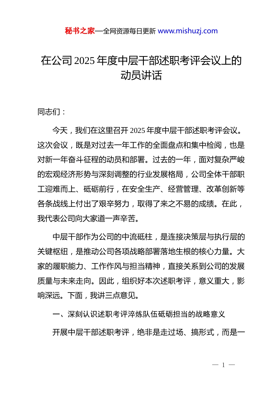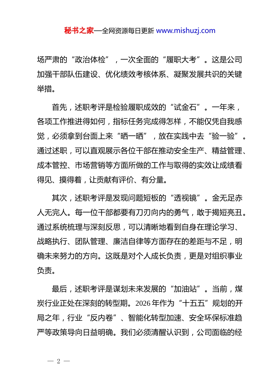 秘书之家—全网资源每日更新 www.mishuzj.com在公司 2025 年度中层干部述职考评会议上的动员讲话同志们:今天,我们在这里召开 2025 年度中层干部述职考评会议。这次会议,既是对过去一年工作的全面盘点和集中检阅,也是对新一年奋斗征程的动员和部署。过去的一年,面对复杂严峻的宏观经济形势与深刻调整的行业发展格局,公司全体干部职工迎难而上、砥砺前行,在安全生产、经营管理、改革创新等各条战线上付出了艰辛努力,取得了来之不易的成绩。在此,我代表公司向大家道一声辛苦。中层干部作为公司的中流砥柱,是连接决策层与执行层的关键枢纽,是推动公司各项战略部署落地生根的核心力量。大家的履职能力、工作作风与担当精神,直接关系到公司的发展质量与未来走向。因此,组织好本次述职考评,意义重大,影响深远。下面,我讲三点意见。一、深刻认识述职考评淬炼队伍砥砺担当的战略意义开展中层干部述职考评,绝非是走过场、搞形式,而是一— 1 —秘书之家—全网资源每日更新 www.mishuzj.com场严肃的“政治体检”,一次全面的“履职大考”。这是公司加强干部队伍建设、优化绩效考核体系、凝聚发展共识的关键举措。首先,述职考评是检验履职成效的“试金石”。一年来,各项工作推进得如何,指标任务完成得怎样,不能仅凭自我感觉,必须拿到台面上来“晒一晒”,放在实践中去“验一验”。通过述职,可以直观展示各位干部在推动安全生产、精益管理、成本管控、市场营销等方面所做的工作与取得的实效让成绩看得见、摸得着,让贡献有评价、有分量。其次,述职考评是发现问题短板的“透视镜”。金无足赤人无完人。每一位干部都要有刀刃向内的勇气,敢于揭短亮丑。通过系统梳理与深刻反思,可以清晰地看到自身在理论学习、战略执行、团队管理、廉洁自律等方面存在的差距与不足,明确未来努力的方向。这既是对个人成长负责,更是对组织事业负责。最后,述职考评是谋划未来发展的“加油站”。当前,煤炭行业正处在深刻的转型期。2026 年作为“十五五”规划的开局之年,行业“反内卷”、智能化转型加速、安全环保标准趋严等政策导向日益明确。我们必须清醒认识到,公司面临的经— 2 —秘书之家—全网资源每日更新 www.mishuzj.com营压力与发展挑战依然巨大。通过述职考评,可以集思广益,汇聚集体智慧,在总结经验、分析形势的基础上,科学谋划2026 年的工作思路、目标任务与关键举措,为公司在新的一年里破局开路、行稳致远奠定坚实基础。二、准确把握述职报告实事求是谋深谋远的核心要求述职报告是对一年工作的浓缩与提炼,述职过程则是对个人综合素质的集中展示。要确保述职取得实效,必须在内容上做到“三个聚焦”。一要聚焦“绩”,客观全面讲成果。要紧密围绕公司下达的年度目标任务,用事实和数据说话。例如,安全生产方面,是否实现了全年安全“零事故”目标,隐患排查整改完成率达到多少;经营管理方面,原煤产量、销售收入、利润指标完成情况如何,成本控制、提质增效采取了哪些硬措施,取得了哪些具体成效。讲成绩要实事求是,既不夸大,也不谦虚,把亮点和特色讲出来,把攻坚克难的过程讲清楚。二要聚焦“思”,深刻透彻找不足。问题是时代的声音,也是进步的起点。述职报告不能只谈成绩、不谈问题,更不能避重就轻、蜻蜓点水。要敢于正视在部门管理、工作执行、作— 3 —秘书之家—全网资源每日更新 www.mishuzj.com风建设中存在的短板弱项,深刻剖析问题背后的思想根源、制度漏洞与能力短板。查找问题要精准,分析原因要透彻,真正做到见人见事见思想。三要聚焦“谋”,立足长远定思路。述职不仅是总结过去,更是为了开创未来。在谋划 2026 年工作时,必须紧扣行业发展大势与公司战略部署。要思考如何应对电煤中长期合同政策变化带来的市场挑战,提升营销与合规能力;要思考如何推动矿井智能化建设,提升技术管理水平与生产效率;要思考如何将“德、能、勤、绩、廉”五方面要求内化于心、外化于行,打造一支政治过硬、本领高强的管理团队。思路要清,目标要明,措施要实。三、严格遵循客观公正民主集中的评议准则评议是述职考评的关键环节,直接关系到...