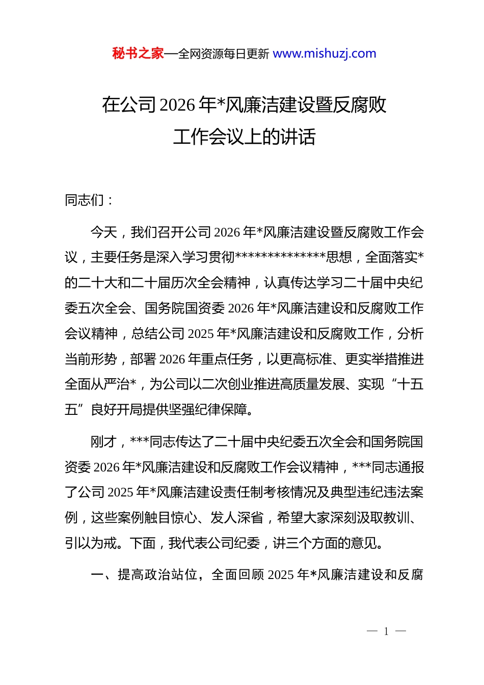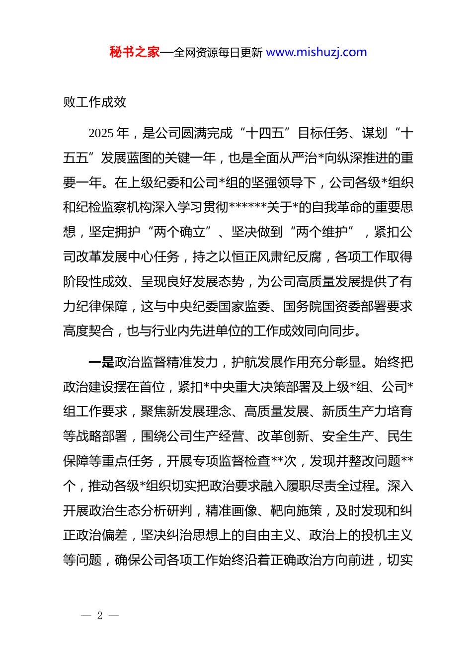 秘书之家—全网资源每日更新 www.mishuzj.com在公司 2026 年*风廉洁建设暨反腐败工作会议上的讲话同志们:今天,我们召开公司 2026 年*风廉洁建设暨反腐败工作会议,主要任务是深入学习贯彻**************思想,全面落实*的二十大和二十届历次全会精神,认真传达学习二十届中央纪委五次全会、国务院国资委 2026 年*风廉洁建设和反腐败工作会议精神,总结公司 2025 年*风廉洁建设和反腐败工作,分析当前形势,部署 2026 年重点任务,以更高标准、更实举措推进全面从严治*,为公司以二次创业推进高质量发展、实现“十五五”良好开局提供坚强纪律保障。刚才,***同志传达了二十届中央纪委五次全会和国务院国资委 2026 年*风廉洁建设和反腐败工作会议精神,***同志通报了公司 2025 年*风廉洁建设责任制考核情况及典型违纪违法案例,这些案例触目惊心、发人深省,希望大家深刻汲取教训、引以为戒。下面,我代表公司纪委,讲三个方面的意见。一、提高政治站位,全面回顾 2025 年*风廉洁建设和反腐— 1 —秘书之家—全网资源每日更新 www.mishuzj.com败工作成效2025 年,是公司圆满完成“十四五”目标任务、谋划“十五五”发展蓝图的关键一年,也是全面从严治*向纵深推进的重要一年。在上级纪委和公司*组的坚强领导下,公司各级*组织和纪检监察机构深入学习贯彻******关于*的自我革命的重要思想,坚定拥护“两个确立”、坚决做到“两个维护”,紧扣公司改革发展中心任务,持之以恒正风肃纪反腐,各项工作取得阶段性成效、呈现良好发展态势,为公司高质量发展提供了有力纪律保障,这与中央纪委国家监委、国务院国资委部署要求高度契合,也与行业内先进单位的工作成效同向同步。一是政治监督精准发力,护航发展作用充分彰显。始终把政治建设摆在首位,紧扣*中央重大决策部署及上级*组、公司*组工作要求,聚焦新发展理念、高质量发展、新质生产力培育等战略部署,围绕公司生产经营、改革创新、安全生产、民生保障等重点任务,开展专项监督检查**次,发现并整改问题**个,推动各级*组织切实把政治要求融入履职尽责全过程。深入开展政治生态分析研判,精准画像、靶向施策,及时发现和纠正政治偏差,坚决纠治思想上的自由主义、政治上的投机主义等问题,确保公司各项工作始终沿着正确政治方向前进,切实— 2 —秘书之家—全网资源每日更新 www.mishuzj.com把“两个维护”体现到实干实绩上。扎实推进中央巡视整改“后半篇文章”,建立整改长效机制,整改完成率达 100%,整改成效得到上级肯定,这与中国石化等央企巡视整改工作成效保持一致。二是正风肃纪持续深化,作风建设成效不断巩固。严格落实中央八项规定及其实施细则精神,深入开展作风建设专项整治,重点纠治形式主义、官僚主义,坚决整治不作为、慢作为、乱作为等突出问题,查处形式主义、官僚主义问题**起,处理**人。持续狠刹享乐主义、奢靡之风,对违规吃喝、违规收送礼品礼金、公款旅游等易发多发问题深化整治,开展节日廉洁提醒**次,查处享乐主义、奢靡之风问题**起,处理**人,通报曝光典型案例**起,形成有力震慑。深入开展作风建设常态化教育,引导*员干部树立正确的权力观、政绩观、事业观,推动作风建设从集中整治向常态长效转变,这与二十届中央纪委五次全会关于作风建设的部署要求精准对接。三是腐败治理标本兼治,“三不腐”一体推进走深走实。坚持无禁区、全覆盖、零容忍,坚持重遏制、强高压、长震慑,严肃查处违纪违法案件**起,给予 dj 政务处分**人,移送司法机关**人,挽回经济损失**万元。深化重点领域腐败治理,聚— 3 —秘书之家—全网资源每日更新 www.mishuzj.com焦工程建设、物资采购、招标投标、财务管理、选人用人等关键领域和重点环节,开展专项整治,排查梳理廉政风险点**个,健全完善防控措施**项,有效防范化解廉政风险,契合中央纪委深化整治国企、能源等重点领域腐败的工作要求。加强警示教育,组织观看警示教育片、参观廉政教育基地、开展廉政谈话等活动**场次,覆盖*员干部**人次,引导*员干部知敬畏、存戒惧、守底线。深入推进廉洁文化建设,开展廉洁文化进班子、进...