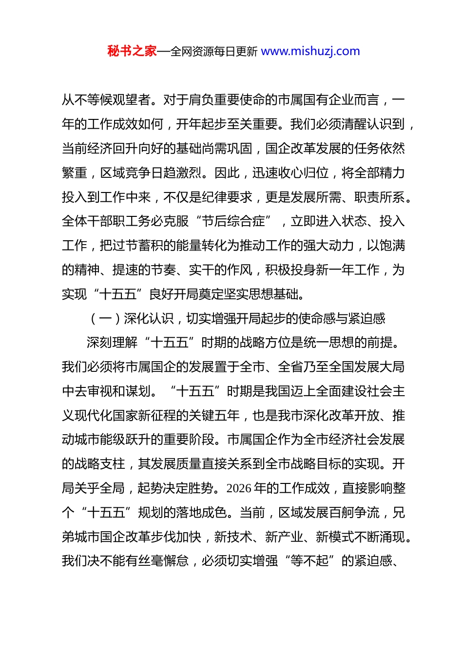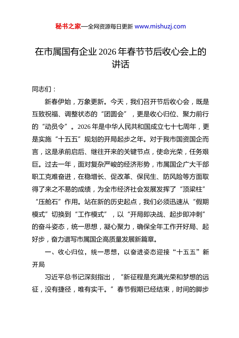 秘书之家—全网资源每日更新 www.mishuzj.com在市属国有企业 2026 年春节节后收心会上的讲话 同志们:新春伊始,万象更新。今天,我们召开节后收心会,既是互致祝福、调整状态的“团圆会”,更是收心归位、聚力前行的“动员令”。2026 年是中华人民共和国成立七十七周年,更是实施“十五五”规划的开局起步之年。对于我市国资国企而言,这是承前启后、继往开来的关键节点,使命光荣,任务艰巨。过去一年,面对复杂严峻的经济形势,市属国企广大干部职工克难奋进,在稳增长、促改革、保民生、防风险等方面取得了来之不易的成绩,为全市经济社会发展发挥了“顶梁柱”“压舱石”作用。站在新的历史起点,我们必须迅速从“假期模式”切换到“工作模式”,以“开局即决战、起步即冲刺”的奋斗姿态,统一思想,凝心聚力,确保全年工作开好局、起好步,奋力谱写市属国企高质量发展新篇章。一、收心归位,统一思想,以奋进姿态迎接“十五五”新开局习近平总书记深刻指出,“新征程是充满光荣和梦想的远征,没有捷径,唯有实干。”春节假期已经结束,时间的脚步秘书之家—全网资源每日更新 www.mishuzj.com从不等候观望者。对于肩负重要使命的市属国有企业而言,一年的工作成效如何,开年起步至关重要。我们必须清醒认识到,当前经济回升向好的基础尚需巩固,国企改革发展的任务依然繁重,区域竞争日趋激烈。因此,迅速收心归位,将全部精力投入到工作中来,不仅是纪律要求,更是发展所需、职责所系。全体干部职工务必克服“节后综合症”,立即进入状态、投入工作,把过节蓄积的能量转化为推动工作的强大动力,以饱满的精神、提速的节奏、实干的作风,积极投身新一年工作,为实现“十五五”良好开局奠定坚实思想基础。(一)深化认识,切实增强开局起步的使命感与紧迫感深刻理解“十五五”时期的战略方位是统一思想的前提。我们必须将市属国企的发展置于全市、全省乃至全国发展大局中去审视和谋划。“十五五”时期是我国迈上全面建设社会主义现代化国家新征程的关键五年,也是我市深化改革开放、推动城市能级跃升的重要阶段。市属国企作为全市经济社会发展的战略支柱,其发展质量直接关系到全市战略目标的实现。开局关乎全局,起势决定胜势。2026 年的工作成效,直接影响整个“十五五”规划的落地成色。当前,区域发展百舸争流,兄弟城市国企改革步伐加快,新技术、新产业、新模式不断涌现。我们决不能有丝毫懈怠,必须切实增强“等不起”的紧迫感、秘书之家—全网资源每日更新 www.mishuzj.com“慢不得”的危机感和“坐不住”的责任感,把“规划图”迅速变成“施工图”,把“时间表”切实变成“计程表”。全体干部职工要深刻认识到,我们手中的每一项工作,都是国企改革发展宏大叙事的一部分;我们所取得的每一点进步,都是在为城市未来积势蓄能。要以对历史、对城市、对企业高度负责的态度,把思想和行动统一到市委市政府的决策部署上来,统一到市国资委的工作要求上来,统一到企业“十五五”发展战略上来,确保思想同心、目标同向、行动同步。精准把握国企改革发展的核心任务是凝聚共识的关键。新的一年,市属国企改革发展任务艰巨繁重。我们要持续深化国企改革提升行动,在完善中国特色现代企业制度、优化国有资本布局、健全市场化经营机制等方面攻坚克难。要紧紧围绕增强核心功能、提升核心竞争力这一重点,聚焦主责主业,推动国有资本向关系全市经济社会发展的重要行业和关键领域集中。要着力培育和发展新质生产力,在科技创新、产业创新上取得新突破。同时,我们必须统筹发展和安全,坚决守住债务风险、安全生产、廉洁从业等底线。这些任务都不是轻轻松松就能完成的,需要付出更为艰巨、更为艰苦的努力。因此,收心归位,首先要归到对这些核心任务的认识上来,归到攻坚克难的决心上来。各部门、各子公司要立即组织专题学习,重温企业“十秘书之家—全网资源每日更新 www.mishuzj.com五五”战略规划和年度工作部署,引导每一位员工明确自身岗位在企业发展大局中的坐标,知晓肩上的担子,激发内在的动力,将个人奋斗融入企业发展的洪流。迅速调整全员精神状态与工作节奏是抓好...
