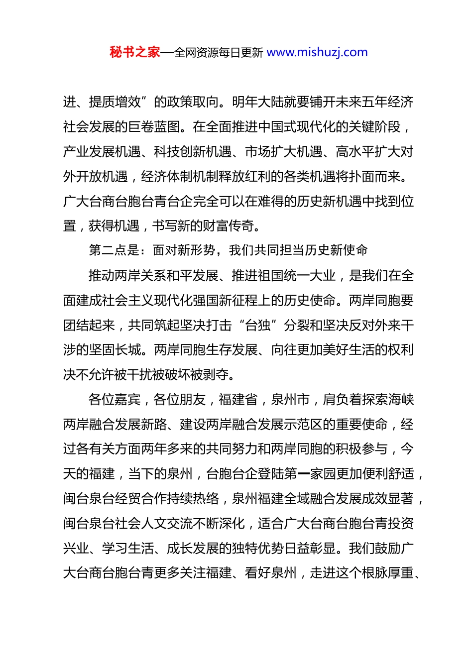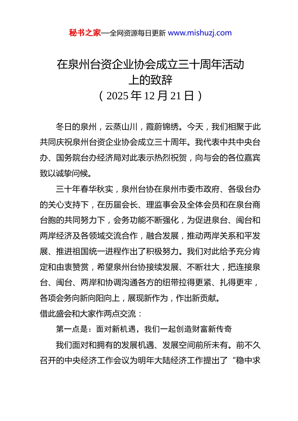 秘书之家—全网资源每日更新 www.mishuzj.com在泉州台资企业协会成立三十周年活动上的致辞(2025 年 12 月 21 日)冬日的泉州,云蒸山川,霞蔚锦绣。今天,我们相聚于此共同庆祝泉州台资企业协会成立三十周年。我代表中共中央台办、国务院台办经济局对此表示热烈祝贺,向与会的各位嘉宾致以诚挚问候。三十年春华秋实,泉州台协在泉州市委市政府、各级台办的关心支持下,在历届会长、理监事会及全体会员和在泉台商台胞的共同努力下,会务功能不断强化,为促进泉台、闽台和两岸经济及各领域交流合作,融合发展,推动两岸关系和平发展、推进祖国统一进程作出了积极努力。我们对此给予充分肯定和由衷赞赏,希望泉州台协接续发展、不断壮大,把连接泉台、闽台、两岸和协调沟通各方的纽带拉得更紧、扎得更牢,各项会务向新向阳向上,展现新作为,作出新贡献。借此盛会和大家作两点交流:第一点是:面对新机遇,我们一起创造财富新传奇我们面对和拥有的发展机遇、发展空间前所未有。前不久召开的中央经济工作会议为明年大陆经济工作提出了“稳中求秘书之家—全网资源每日更新 www.mishuzj.com进、提质增效”的政策取向。明年大陆就要铺开未来五年经济社会发展的巨卷蓝图。在全面推进中国式现代化的关键阶段,产业发展机遇、科技创新机遇、市场扩大机遇、高水平扩大对外开放机遇,经济体制机制释放红利的各类机遇将扑面而来。广大台商台胞台青台企完全可以在难得的历史新机遇中找到位置,获得机遇,书写新的财富传奇。第二点是:面对新形势,我们共同担当历史新使命推动两岸关系和平发展、推进祖国统一大业,是我们在全面建成社会主义现代化强国新征程上的历史使命。两岸同胞要团结起来,共同筑起坚决打击“台独”分裂和坚决反对外来干涉的坚固长城。两岸同胞生存发展、向往更加美好生活的权利决不允许被干扰被破坏被剥夺。各位嘉宾,各位朋友,福建省,泉州市,肩负着探索海峡两岸融合发展新路、建设两岸融合发展示范区的重要使命,经过各有关方面两年多来的共同努力和两岸同胞的积极参与,今天的福建,当下的泉州,台胞台企登陆第一家园更加便利舒适,闽台泉台经贸合作持续热络,泉州福建全域融合发展成效显著,闽台泉台社会人文交流不断深化,适合广大台商台胞台青投资兴业、学习生活、成长发展的独特优势日益彰显。我们鼓励广大台商台胞台青更多关注福建、看好泉州,走进这个根脉厚重、秘书之家—全网资源每日更新 www.mishuzj.com充满希望、无限美好的精神家园和生活家园,一起共建共享我们的共同家园。各位嘉宾,各位朋友,历史潮流浩浩荡荡、中华民族伟大复兴的进程滚滚向前,两岸同胞同心同向、携手前行、共创共享我们中国人更加美好的未来。祝本次活动圆满成功。祝福大家新年吉祥如意,马年马到成功。谢谢各位!