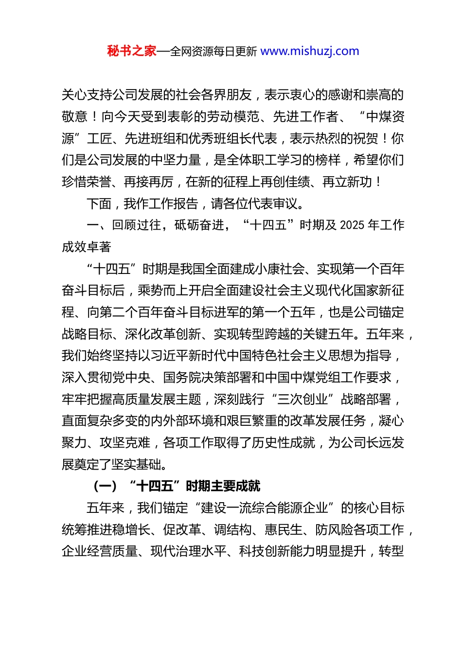 秘书之家—全网资源每日更新 www.mishuzj.com锚定战略目标 勇担时代使命 奋力谱写集团“十五五”高质量发展新篇章——XX 资源发展集团公司党委书记、董事长在资源发展集团 2026 年工作会议暨职工代表大会上的工作报告尊敬的各位领导、各位代表,同志们:大家上午好!春潮涌动处,奋进正当时。今天,我们怀着无比振奋的心情,在 XX 隆重召开 XX 资源发展集团 2026 年工作会议暨职工代表大会、安全环保工作会议。这次会议是在公司“十四五”圆满收官、“十五五”扬帆起航的关键节点召开的一次重要会议。会议的主要任务是:深入学习贯彻党的二十大及二十届历次全会精神,全面落实中央经济工作会议、中央企业负责人会议和中国中煤 2026 年工作会议暨职工代表大会、安全工作会议部署要求,系统总结公司“十四五”时期及 2025 年工作成效,科学分析当前面临的形势任务,全面部署“十五五”发展规划及 2026 年重点工作,进一步统一思想、凝聚共识、鼓足干劲,动员全体干部职工以更加坚定的信心、更加务实的作风、更加有力的举措,奋力开创集团高质量发展新局面。首先,我代表公司党委和领导班子,向长期以来关心支持公司发展的中国中煤党组及各级领导,向为公司改革发展付出辛勤汗水的全体干部职工、离退休老同志、职工家属,向所有秘书之家—全网资源每日更新 www.mishuzj.com关心支持公司发展的社会各界朋友,表示衷心的感谢和崇高的敬意!向今天受到表彰的劳动模范、先进工作者、“中煤资源”工匠、先进班组和优秀班组长代表,表示热烈的祝贺!你们是公司发展的中坚力量,是全体职工学习的榜样,希望你们珍惜荣誉、再接再厉,在新的征程上再创佳绩、再立新功!下面,我作工作报告,请各位代表审议。一、回顾过往,砥砺奋进,“十四五”时期及 2025 年工作成效卓著“十四五”时期是我国全面建成小康社会、实现第一个百年奋斗目标后,乘势而上开启全面建设社会主义现代化国家新征程、向第二个百年奋斗目标进军的第一个五年,也是公司锚定战略目标、深化改革创新、实现转型跨越的关键五年。五年来,我们始终坚持以习近平新时代中国特色社会主义思想为指导,深入贯彻党中央、国务院决策部署和中国中煤党组工作要求,牢牢把握高质量发展主题,深刻践行“三次创业”战略部署,直面复杂多变的内外部环境和艰巨繁重的改革发展任务,凝心聚力、攻坚克难,各项工作取得了历史性成就,为公司长远发展奠定了坚实基础。(一)“十四五”时期主要成就五年来,我们锚定“建设一流综合能源企业”的核心目标统筹推进稳增长、促改革、调结构、惠民生、防风险各项工作,企业经营质量、现代治理水平、科技创新能力明显提升,转型秘书之家—全网资源每日更新 www.mishuzj.com发展迈出新步伐,企业核心功能、核心竞争力显著增强,在中国中煤经营业绩、改革考评、科技创新、党建责任制等各项考核中均获“A”级或优秀评价,交出了一份厚重提气的“十四五”答卷。1.经营发展质效稳步提升,综合实力显著增强五年来,我们始终坚持以效益为中心,优化经营策略,强化精益管理,克服疫情冲击、能源市场波动等多重不利影响,实现了规模与效益同步增长。截至 2025 年底,公司资产总额较“十三五”末增长 XX%,达到 XX 亿元;累计实现营业收入XX 亿元,年均增长 XX%;累计实现利润总额 XX 亿元,年均增长 XX%;上缴税费 XX 亿元,为国家能源安全和经济社会发展作出了重要贡献。在产能规模方面,我们持续优化煤炭生产布局,稳步提升优质产能比重,煤炭产能达到 XX 万吨/年,较“十三五”末增长 XX%;电力板块稳步拓展,控股及参股电厂装机容量达到 XX 万千瓦,形成了煤电协同发展的良好格局。同时,我们积极拓展非煤产业,新能源、新材料等新兴业务初具规模,产业结构更趋合理,抗风险能力显著增强。2.改革创新纵深推进,发展活力充分释放五年来,我们始终将改革创新作为推动发展的根本动力,全面落实国企改革三年行动方案及深化提升行动要求,以刀刃向内的勇气破除体制机制障碍。在公司治理方面,我们完善“三重一大”决策制度,健全董事会、监事会、经理层各司其秘书之家—全网...