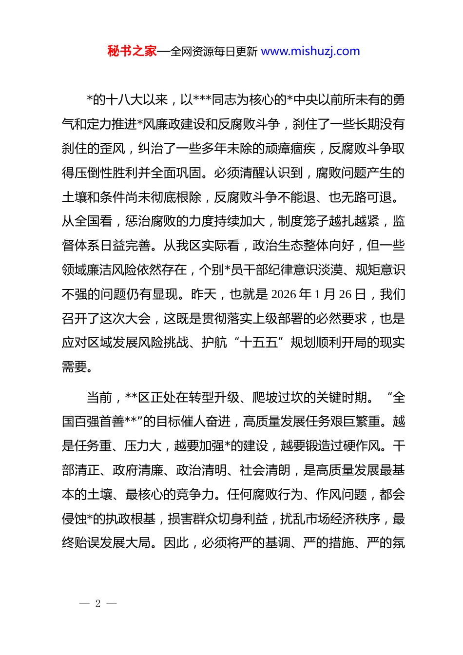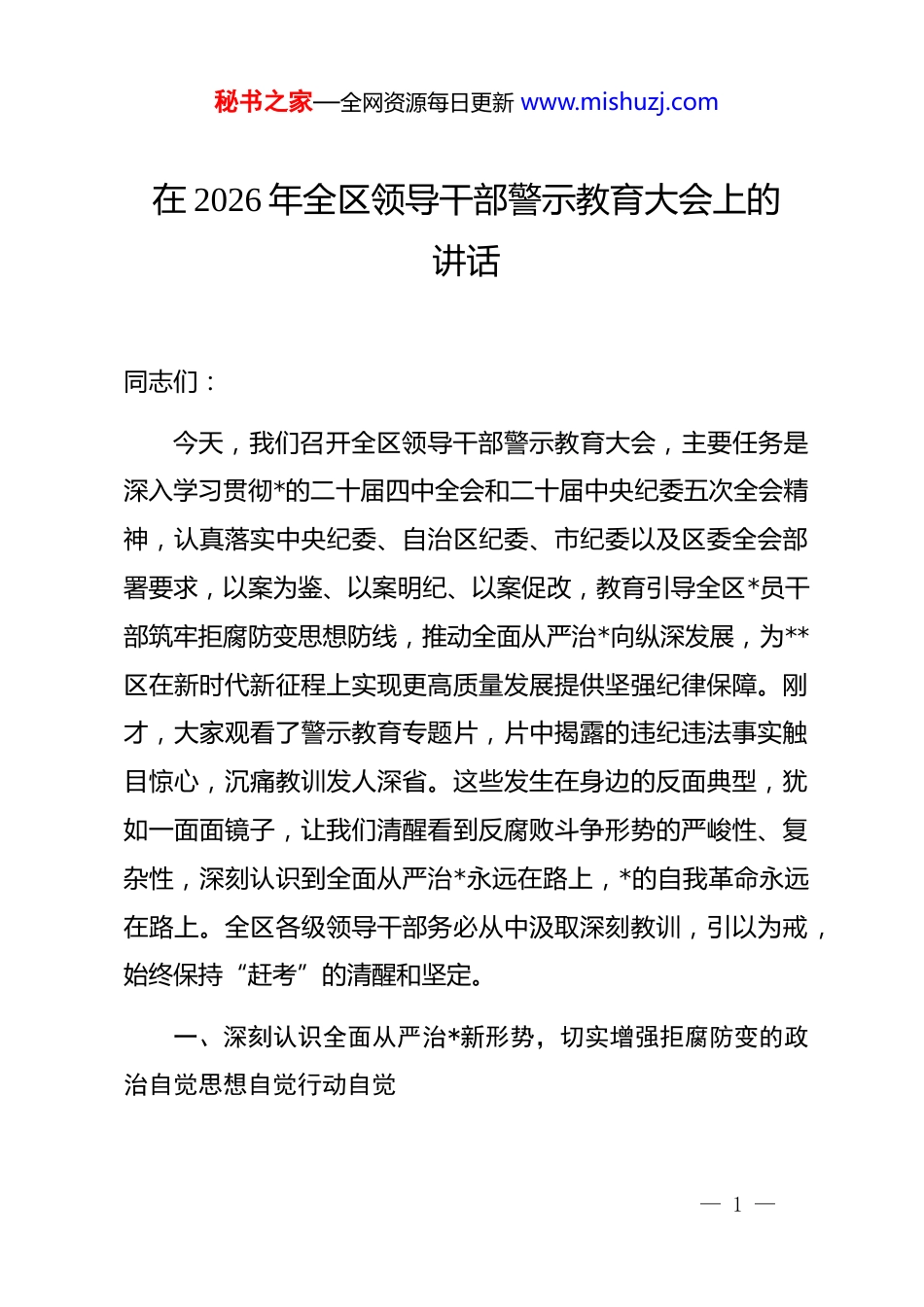 秘书之家—全网资源每日更新 www.mishuzj.com在 2026 年全区领导干部警示教育大会上的讲话同志们:今天,我们召开全区领导干部警示教育大会,主要任务是深入学习贯彻*的二十届四中全会和二十届中央纪委五次全会精神,认真落实中央纪委、自治区纪委、市纪委以及区委全会部署要求,以案为鉴、以案明纪、以案促改,教育引导全区*员干部筑牢拒腐防变思想防线,推动全面从严治*向纵深发展,为**区在新时代新征程上实现更高质量发展提供坚强纪律保障。刚才,大家观看了警示教育专题片,片中揭露的违纪违法事实触目惊心,沉痛教训发人深省。这些发生在身边的反面典型,犹如一面面镜子,让我们清醒看到反腐败斗争形势的严峻性、复杂性,深刻认识到全面从严治*永远在路上,*的自我革命永远在路上。全区各级领导干部务必从中汲取深刻教训,引以为戒,始终保持“赶考”的清醒和坚定。一、深刻认识全面从严治*新形势,切实增强拒腐防变的政治自觉思想自觉行动自觉— 1 —秘书之家—全网资源每日更新 www.mishuzj.com*的十八大以来,以***同志为核心的*中央以前所未有的勇气和定力推进*风廉政建设和反腐败斗争,刹住了一些长期没有刹住的歪风,纠治了一些多年未除的顽瘴痼疾,反腐败斗争取得压倒性胜利并全面巩固。必须清醒认识到,腐败问题产生的土壤和条件尚未彻底根除,反腐败斗争不能退、也无路可退。从全国看,惩治腐败的力度持续加大,制度笼子越扎越紧,监督体系日益完善。从我区实际看,政治生态整体向好,但一些领域廉洁风险依然存在,个别*员干部纪律意识淡漠、规矩意识不强的问题仍有显现。昨天,也就是 2026 年 1 月 26 日,我们召开了这次大会,这既是贯彻落实上级部署的必然要求,也是应对区域发展风险挑战、护航“十五五”规划顺利开局的现实需要。当前,**区正处在转型升级、爬坡过坎的关键时期。“全国百强首善**”的目标催人奋进,高质量发展任务艰巨繁重。越是任务重、压力大,越要加强*的建设,越要锻造过硬作风。干部清正、政府清廉、政治清明、社会清朗,是高质量发展最基本的土壤、最核心的竞争力。任何腐败行为、作风问题,都会侵蚀*的执政根基,损害群众切身利益,扰乱市场经济秩序,最终贻误发展大局。因此,必须将严的基调、严的措施、严的氛— 2 —秘书之家—全网资源每日更新 www.mishuzj.com围长期坚持下去,把警示教育作为一体推进“三不腐”的重要环节抓实抓细。南宁市青秀区纪委监委持续深化警示教育,坚持边查案、边剖析、边警示,将违纪违法案例转化为鲜活教材,这种做法值得借鉴。我们要通过常态化的警示教育,让“写在纸上的教训”变为“记在心间的敬畏”,推动广大*员干部真正把遵规守纪刻印在心,内化为言行准则。二、深入剖析违纪违法问题根源,以案为鉴筑牢信仰之基补足精神之钙警示教育专题片和近年来查处的案例表明,腐败行为的发生,根本在于理想信念滑坡、初心使命迷失。剖析其深层原因,主要有以下几个方面:一是政治“总开关”拧得不紧。一些*员干部忽视政治理论学习,对*中央的大政方针和决策部署理解不深、把握不准,政治判断力、政治领悟力、政治执行力存在差距。在大是大非面前态度暧昧,在利益诱惑面前防线失守,根本原因是政治上不清醒、不坚定。坚定拥护“两个确立”、坚决做到“两个维护”,不能停留在口头上,必须融入血脉、见诸行动。要时刻关注*中央在关心什么、强调什么,自觉同*的基本理论、基本路线、基本方略对标对表,确保执行不偏向、不变通、不走样。— 3 —秘书之家—全网资源每日更新 www.mishuzj.com二是权力观政绩观事业观扭曲错位。有的干部将人民赋予的权力视为私器,大搞权力寻租、利益输送;有的为了个人所谓“政绩”,不顾客观实际蛮干硬干,甚至弄虚作假;有的忘记“为了谁、依靠谁、我是谁”,脱离群众,漠视民生。权力姓公不姓私,必须坚持公正用权、依法用权、为民用权、廉洁用权。政绩必须经得起实践、人民、历史检验,要牢固树立和践行正确政绩观,多做打基础、利长远、惠民生的事。三是纪律规矩意识淡薄红线失守。对*章*规 dj 学习不深、敬畏不足,认为一些“小问题”无伤大雅,从接受一...
