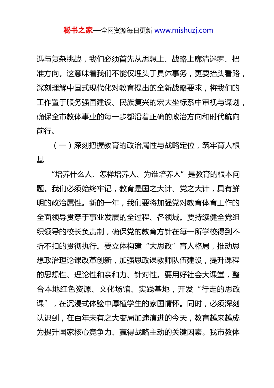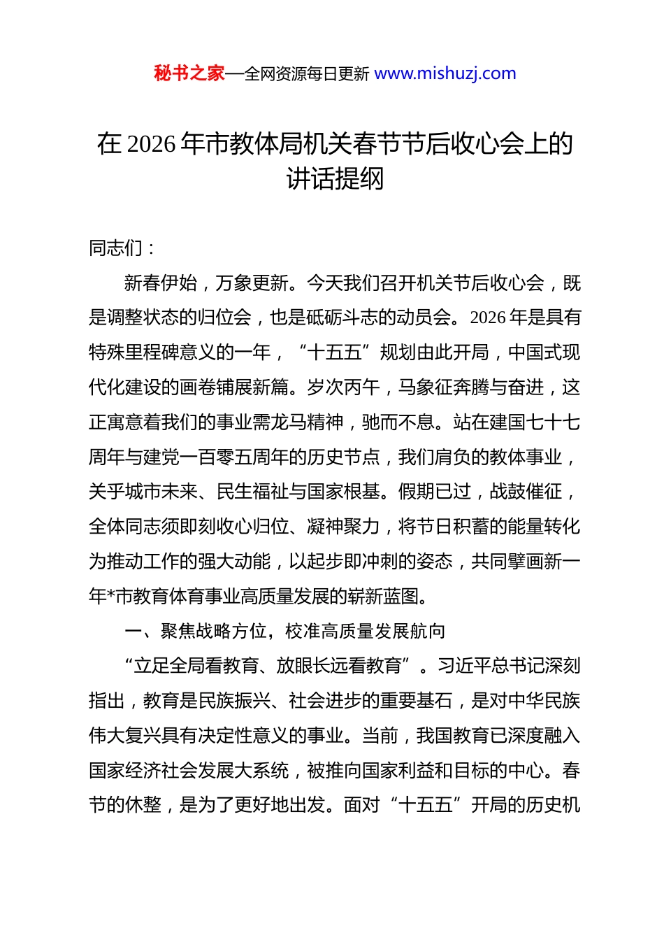 秘书之家—全网资源每日更新 www.mishuzj.com在 2026 年市教体局机关春节节后收心会上的讲话提纲 同志们:新春伊始,万象更新。今天我们召开机关节后收心会,既是调整状态的归位会,也是砥砺斗志的动员会。2026 年是具有特殊里程碑意义的一年,“十五五”规划由此开局,中国式现代化建设的画卷铺展新篇。岁次丙午,马象征奔腾与奋进,这正寓意着我们的事业需龙马精神,驰而不息。站在建国七十七周年与建党一百零五周年的历史节点,我们肩负的教体事业,关乎城市未来、民生福祉与国家根基。假期已过,战鼓催征,全体同志须即刻收心归位、凝神聚力,将节日积蓄的能量转化为推动工作的强大动能,以起步即冲刺的姿态,共同擘画新一年*市教育体育事业高质量发展的崭新蓝图。一、聚焦战略方位,校准高质量发展航向“立足全局看教育、放眼长远看教育”。习近平总书记深刻指出,教育是民族振兴、社会进步的重要基石,是对中华民族伟大复兴具有决定性意义的事业。当前,我国教育已深度融入国家经济社会发展大系统,被推向国家利益和目标的中心。春节的休整,是为了更好地出发。面对“十五五”开局的历史机秘书之家—全网资源每日更新 www.mishuzj.com遇与复杂挑战,我们必须首先从思想上、战略上廓清迷雾、把准方向。这意味着我们不能仅埋头于具体事务,更要抬头看路,深刻理解中国式现代化对教育提出的全新战略要求,将我们的工作置于服务强国建设、民族复兴的宏大坐标系中审视与谋划,确保全市教体事业的每一步都沿着正确的政治方向和时代航向前行。(一)深刻把握教育的政治属性与战略定位,筑牢育人根基“培养什么人、怎样培养人、为谁培养人”是教育的根本问题。我们必须始终牢记,教育是国之大计、党之大计,具有鲜明的政治属性。新的一年,我们要将加强党对教育体育工作的全面领导贯穿于事业发展的全过程、各领域。要持续健全党组织领导的校长负责制,确保党的教育方针在每一所学校得到不折不扣的贯彻执行。要立体构建“大思政”育人格局,推动思想政治理论课改革创新,加强思政课教师队伍建设,提升课程的思想性、理论性和亲和力、针对性。要用好社会大课堂,整合本地红色资源、文化场馆、实践基地,开发“行走的思政课”,在沉浸式体验中厚植学生的家国情怀。同时,必须深刻认识到,在百年未有之大变局加速演进的今天,教育越来越成为提升国家核心竞争力、赢得战略主动的关键因素。我市教体秘书之家—全网资源每日更新 www.mishuzj.com工作必须自觉融入全市、全省乃至国家的发展战略,思考如何为培育新质生产力、推动产业创新提供人才支撑和智力支持。这就要求我们的政策制定、资源分配、改革设计,都必须服务于“为党育人、为国育才”这一崇高使命,确保我们培养的社会主义建设者和接班人,不仅学识扎实,更理想信念坚定,能够担当起民族复兴的时代重任。(二)精准服务经济社会发展与民生需求,彰显教体价值习近平总书记强调,建设教育强国,最终是办好人民满意的教育,要以教育之力厚植人民幸福之本。我市教育体育工作必须坚持以人民为中心的发展思想,积极回应人民群众对“上好学”“健好身”的迫切期盼。随着我市经济社会发展和人口结构变化,学龄人口呈现新的波动趋势,人民群众对教育公平、优质、多样的需求日益增长。我们要科学预测学位需求,优化学校布局规划,持续加大教育投入,通过新建、改扩建一批学校,有效增加学位供给,切实缓解区域性入学压力。在体育方面,要加快健全覆盖城乡、公平可及的全民健身公共服务体系,增加全民健身场地设施供给,让体育更好融入生活,惠及全体市民。此外,要直面“双减”后时代的教育生态重塑课题,在深化校外培训治理、规范招生入学秩序的同时,将主要精力集中到强化学校教育主阵地作用上来。要着力提升课后服务质量,秘书之家—全网资源每日更新 www.mishuzj.com构建涵盖德智体美劳的多元化课程体系,满足学生个性化发展需求。通过这一系列务实举措,将教育体育改革发展成果更多更公平地惠及全体人民,不断提升公共服务普惠性、可及性与便捷性,切实增强人民群众的获得感、幸福感与安全感。(三)勇于迎接时代变革与外部挑...