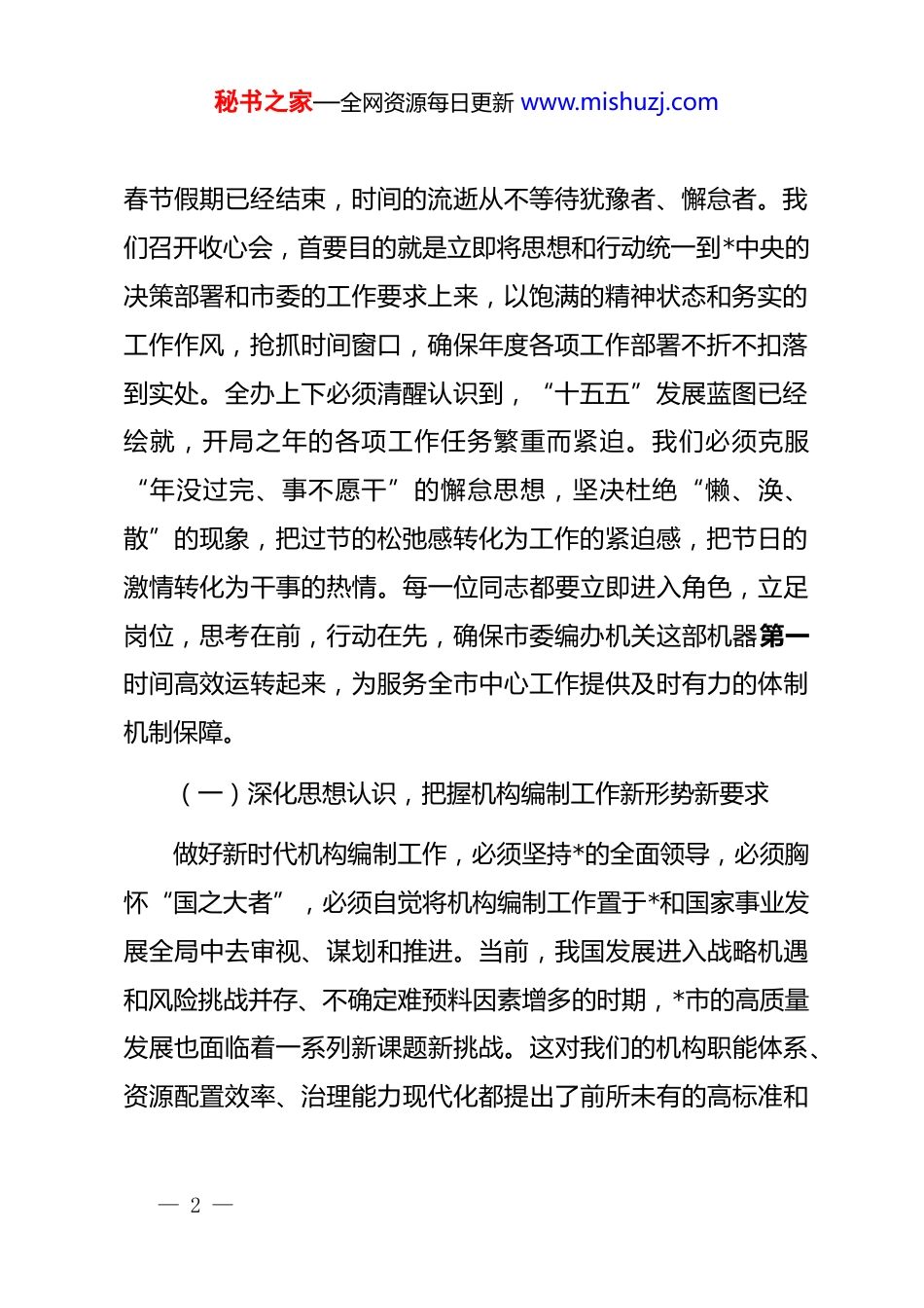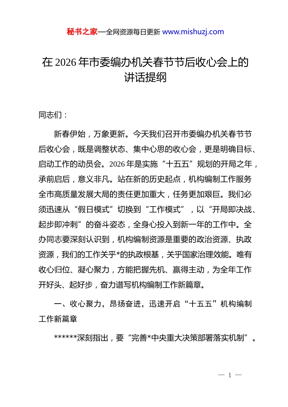 秘书之家—全网资源每日更新 www.mishuzj.com在 2026 年市委编办机关春节节后收心会上的讲话提纲同志们:新春伊始,万象更新。今天我们召开市委编办机关春节节后收心会,既是调整状态、集中心思的收心会,更是明确目标、启动工作的动员会。2026 年是实施“十五五”规划的开局之年,承前启后,意义非凡。站在新的历史起点,机构编制工作服务全市高质量发展大局的责任更加重大,任务更加艰巨。我们必须迅速从“假日模式”切换到“工作模式”,以“开局即决战、起步即冲刺”的奋斗姿态,全身心投入到新一年的工作中。全办同志要深刻认识到,机构编制资源是重要的政治资源、执政资源,我们的工作关乎*的执政根基,关乎国家治理效能。唯有收心归位、凝心聚力,方能把握先机、赢得主动,为全年工作开好头、起好步,奋力谱写机构编制工作新篇章。一、收心聚力,昂扬奋进,迅速开启“十五五”机构编制工作新篇章******深刻指出,要“完善*中央重大决策部署落实机制”。— 1 —秘书之家—全网资源每日更新 www.mishuzj.com春节假期已经结束,时间的流逝从不等待犹豫者、懈怠者。我们召开收心会,首要目的就是立即将思想和行动统一到*中央的决策部署和市委的工作要求上来,以饱满的精神状态和务实的工作作风,抢抓时间窗口,确保年度各项工作部署不折不扣落到实处。全办上下必须清醒认识到,“十五五”发展蓝图已经绘就,开局之年的各项工作任务繁重而紧迫。我们必须克服“年没过完、事不愿干”的懈怠思想,坚决杜绝“懒、涣、散”的现象,把过节的松弛感转化为工作的紧迫感,把节日的激情转化为干事的热情。每一位同志都要立即进入角色,立足岗位,思考在前,行动在先,确保市委编办机关这部机器第一时间高效运转起来,为服务全市中心工作提供及时有力的体制机制保障。(一)深化思想认识,把握机构编制工作新形势新要求做好新时代机构编制工作,必须坚持*的全面领导,必须胸怀“国之大者”,必须自觉将机构编制工作置于*和国家事业发展全局中去审视、谋划和推进。当前,我国发展进入战略机遇和风险挑战并存、不确定难预料因素增多的时期,*市的高质量发展也面临着一系列新课题新挑战。这对我们的机构职能体系、资源配置效率、治理能力现代化都提出了前所未有的高标准和— 2 —秘书之家—全网资源每日更新 www.mishuzj.com严要求。我们绝不能有任何喘口气、歇歇脚的念头,必须深刻认识到,机构编制工作的政治性、政策性强,任何一项微小的调整都可能牵一发而动全身。因此,全办同志务必要提高政治站位,强化理论武装,持续深入学习领会******关于机构编制工作的重要论述和****批示精神。要紧密联系*市改革发展实际,深入理解*中央关于深化*和国家机构改革、优化政府职责体系和组织结构、健全充分发挥中央和地方两个积极性体制机制等一系列战略部署的核心要义和实践要求。要通过学习,不断深化对机构编制工作规律的认识,增强工作的系统性、预见性、创造性,确保我们的所有改革举措和资源配置都符合中央精神、切合*实际、顺应人民期盼,始终沿着正确的政治方向前进。(二)聚焦主责主业,明确年度机构编制工作重点任务“凡事预则立,不预则废。”收心归位的最终落脚点在于扎实有效地开展工作。春节前,中央编办召开了全国编办主任会议,对 2026 年工作进行了全面部署;市委也就全年经济工作和重点任务作出了系统安排。我们要第一时间抓好这些重要会议精神的传达学习和贯彻落实,将其作为谋划和推动全年工作的根本遵循和行动指南。全办各科(局、中心)要立即行动起来,对照上级部署和市委要求,对本领域、本条线的年度工作进行— 3 —秘书之家—全网资源每日更新 www.mishuzj.com再梳理、再细化、再部署。要结合“十五五”规划的开局任务,紧紧围绕服务构建新发展格局、推动城乡融合发展、促进共同富裕、统筹发展和安全等重大战略在*市的落地实施,深入研究与之相适应的体制机制保障需求。要将年度重点任务分解为可操作、可量化、可考核的具体项目,明确时间表、路线图和责任人,形成清晰的任务清单和责任链条。要摒弃“等、靠、要”思想,主动对接发展一线和民生领域,开展前...