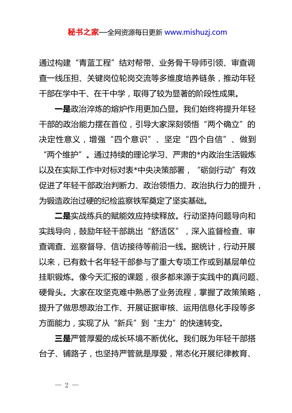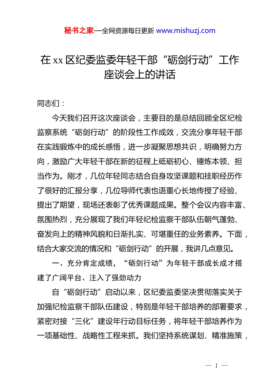 秘书之家—全网资源每日更新 www.mishuzj.com在 xx 区纪委监委年轻干部“砺剑行动”工作座谈会上的讲话同志们:今天我们召开这次座谈会,主要目的是总结回顾全区纪检监察系统“砺剑行动”的阶段性工作成效,交流分享年轻干部在实践锻炼中的成长感悟,进一步凝聚思想共识,明确努力方向,激励广大年轻干部在新的征程上砥砺初心、锤炼本领、担当作为。刚才,几位年轻同志结合自身攻坚课题和挂职经历作了很好的汇报分享,几位导师代表也语重心长地传授了经验、提出了期望,现场还表彰了优秀课题成果。整个会议内容丰富、氛围热烈,充分展现了我们年轻纪检监察干部队伍朝气蓬勃、奋发向上的精神风貌和日渐扎实、可堪重任的业务素养。下面,结合大家交流的情况和“砺剑行动”的开展,我讲几点意见。一、充分肯定成绩,“砺剑行动”为年轻干部成长成才搭建了广阔平台、注入了强劲动力自“砺剑行动”启动以来,区纪委监委坚决贯彻落实关于加强纪检监察干部队伍建设,特别是年轻干部培养的部署要求,紧密对接“三化”建设年行动目标任务,将年轻干部培养作为一项基础性、战略性工程来抓。我们坚持系统谋划、精准施策,— 1 —秘书之家—全网资源每日更新 www.mishuzj.com通过构建“青蓝工程”结对帮带、业务骨干导师引领、审查调查一线压担、关键岗位轮岗交流等多维度培养链条,推动年轻干部在学中干、在干中学,取得了较为显著的阶段性成果。一是政治淬炼的熔炉作用更加凸显。我们始终将提升年轻干部的政治能力摆在首位,引导大家深刻领悟“两个确立”的决定性意义,增强“四个意识”、坚定“四个自信”、做到“两个维护”。通过持续的理论学习、严肃的*内政治生活锻炼以及在实际工作中对标对表*中央决策部署,“砺剑行动”有效促进了年轻干部政治判断力、政治领悟力、政治执行力的提升,为锻造政治过硬的纪检监察铁军奠定了坚实基础。二是实战练兵的赋能效应持续释放。行动坚持问题导向和实践导向,鼓励年轻干部跳出“舒适区”,深入监督检查、审查调查、巡察督导、信访接待等前沿一线。据统计,行动开展以来,已有数十名年轻干部参与了重大专项工作或到基层单位挂职锻炼。像今天汇报的课题,很多都来源于实践中的真问题、硬骨头。大家在攻坚克难中熟悉了业务流程,掌握了政策策略,提升了做思想政治工作、开展证据审核、运用信息化手段等多方面能力,实现了从“新兵”到“主力”的快速转变。三是严管厚爱的成长环境不断优化。我们既为年轻干部搭台子、铺路子,也坚持严管就是厚爱,常态化开展纪律教育、— 2 —秘书之家—全网资源每日更新 www.mishuzj.com廉政谈话,引导大家系好廉洁从政的“第一粒扣子”。通过健全日常管理监督机制,关注年轻干部的思想动态和工作表现,及时提醒纠偏,帮助大家筑牢拒腐防变的思想防线。同时,在生活上给予关心关爱,积极帮助解决实际困难,让年轻干部感受到组织的温暖,能够心无旁骛地投入工作。四是比学赶超的奋进姿态充分彰显。今天的座谈会,既是一次成果检验,也是一次风采展示。我们看到,有的同志在课题研究中展现了严谨细致的作风和扎实的理论功底;有的同志在分享挂职体会时,流露出对基层的深厚感情和解决复杂问题的思考深度;受表彰的课题,更是创新思路和务实举措的集中体现。这种相互学习、相互激励的氛围,正是“砺剑行动”所要营造的,它激活了干部队伍“一池春水”,为全区纪检监察工作高质量发展注入了源源不断的“新动能”二、深刻把握启示,将“砺剑行动”中探索形成的有效做法转化为干部队伍建设的常态长效“砺剑行动”的初步实践,为我们加强新时代纪检监察年轻干部培养工作积累了宝贵经验,也带来了一些深刻启示。第一,必须坚持政治引领与业务提升相统一。纪检监察机关是政治机关,年轻干部的培养首要在于政治素质的培养。只有在思想上政治上过硬,业务能力才有正确的方向和持久的动— 3 —秘书之家—全网资源每日更新 www.mishuzj.com力。“砺剑行动”将政治训练贯穿业务练兵全过程,确保了年轻干部成长的正确航向。这启示我们,任何时候都不能忽视政治建设这个根本,必须把讲政治的要求内化于心、外化于行。第二...