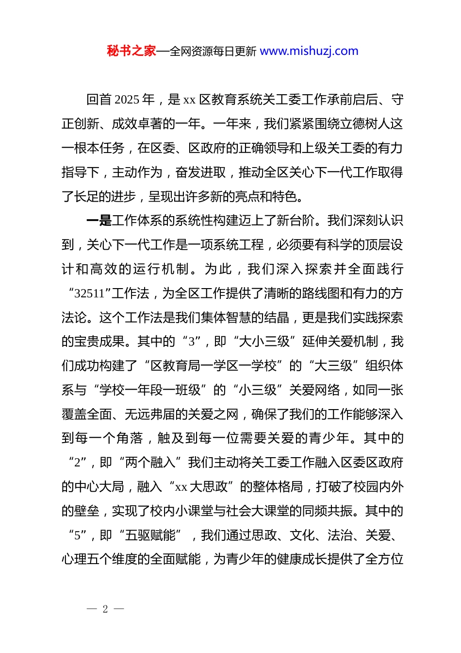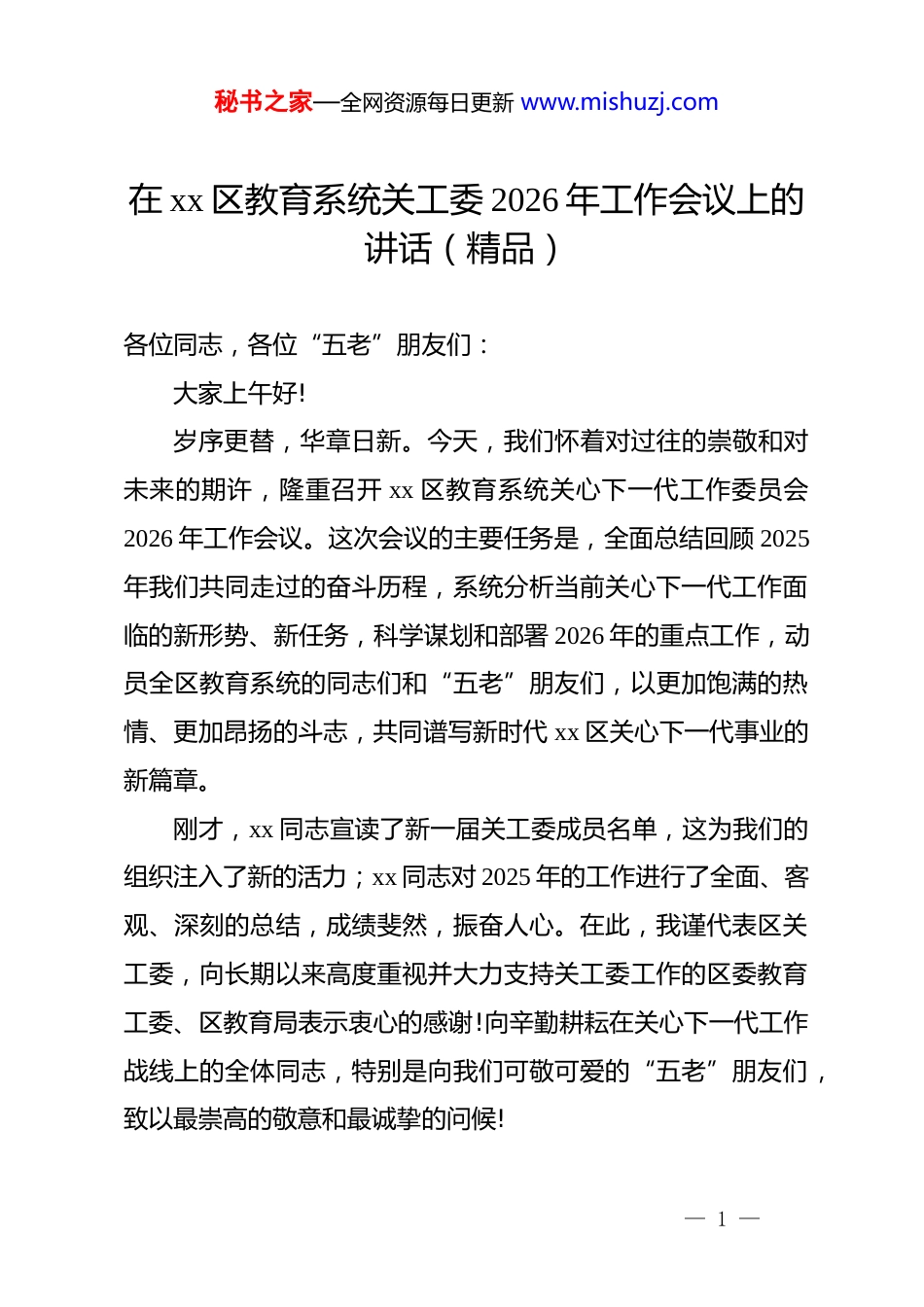 秘书之家—全网资源每日更新 www.mishuzj.com在 xx 区教育系统关工委 2026 年工作会议上的讲话(精品)各位同志,各位“五老”朋友们:大家上午好!岁序更替,华章日新。今天,我们怀着对过往的崇敬和对未来的期许,隆重召开 xx 区教育系统关心下一代工作委员会2026 年工作会议。这次会议的主要任务是,全面总结回顾 2025年我们共同走过的奋斗历程,系统分析当前关心下一代工作面临的新形势、新任务,科学谋划和部署 2026 年的重点工作,动员全区教育系统的同志们和“五老”朋友们,以更加饱满的热情、更加昂扬的斗志,共同谱写新时代 xx 区关心下一代事业的新篇章。刚才,xx 同志宣读了新一届关工委成员名单,这为我们的组织注入了新的活力;xx 同志对 2025 年的工作进行了全面、客观、深刻的总结,成绩斐然,振奋人心。在此,我谨代表区关工委,向长期以来高度重视并大力支持关工委工作的区委教育工委、区教育局表示衷心的感谢!向辛勤耕耘在关心下一代工作战线上的全体同志,特别是向我们可敬可爱的“五老”朋友们,致以最崇高的敬意和最诚挚的问候!— 1 —秘书之家—全网资源每日更新 www.mishuzj.com回首 2025 年,是 xx 区教育系统关工委工作承前启后、守正创新、成效卓著的一年。一年来,我们紧紧围绕立德树人这一根本任务,在区委、区政府的正确领导和上级关工委的有力指导下,主动作为,奋发进取,推动全区关心下一代工作取得了长足的进步,呈现出许多新的亮点和特色。一是工作体系的系统性构建迈上了新台阶。我们深刻认识到,关心下一代工作是一项系统工程,必须要有科学的顶层设计 和 高 效 的 运 行 机 制 。 为 此 , 我 们 深 入 探 索 并 全 面 践 行“32511”工作法,为全区工作提供了清晰的路线图和有力的方法论。这个工作法是我们集体智慧的结晶,更是我们实践探索的宝贵成果。其中的“3”,即“大小三级”延伸关爱机制,我们成功构建了“区教育局一学区一学校”的“大三级”组织体系与“学校一年段一班级”的“小三级”关爱网络,如同一张覆盖全面、无远弗届的关爱之网,确保了我们的工作能够深入到每一个角落,触及到每一位需要关爱的青少年。其中的“2”,即“两个融入”我们主动将关工委工作融入区委区政府的中心大局,融入“xx 大思政”的整体格局,打破了校园内外的壁垒,实现了校内小课堂与社会大课堂的同频共振。其中的“5”,即“五驱赋能”,我们通过思政、文化、法治、关爱、心理五个维度的全面赋能,为青少年的健康成长提供了全方位— 2 —秘书之家—全网资源每日更新 www.mishuzj.com的精神滋养和成长支持。两个“1”,即创新“一个载体”和打造“一个同心圆”,我们通过建设“五老”关爱工作室等平台,充分激发了老同志的智慧和热情;通过强化“dj 带关建”的联动机制,有效整合了社会各方资源,形成了强大的育人合力。这一整套工作法的全面实施,使我们的组织体系更加健全,工作脉络更加清晰,战斗堡垒更加坚固。二是特色品牌的引领性作用实现了新突破。品牌是旗帜,是方向,是影响力和感召力的集中体现。2025 年,我们倾力打造的“xx 路大思政课”特色品牌,已经成为我区青少年思想政治教育的一张亮丽名片。我们不再将思政课局限于教室和课本,而是创造性地将其延伸到我们脚下这片充满红色记忆和时代印记的土地上。我们组织青少年用脚步丈量城市发展的脉络,在行走中感悟历史变迁,在实践中触摸时代脉搏。据不完全统计,去年一年,“xx 路大思政课”覆盖全区 xx 所中小学,开展了包括走访红色地标、探寻城市发展、对话时代楷模等主题的实践活动超过 xx 余场,参与师生累计超过 x 万人次。这种“行走的思政课”,让红色基因和家国情怀在孩子们心中生根发芽,取得了课堂教育无法替代的良好效果。同时,我们深耕家校社协同育人,着力构建“教联体”,推动教育资源共享、育人责任共担。xx 小学的相关实践探索,更是脱颖而出,成功入选“xx 省家校社协同育人‘教— 3 —秘书之家—全网资源每日更新 www.mishuzj.com联体’建设典型案例”,这不仅是 xx 小学的荣誉,更是我们全区上...