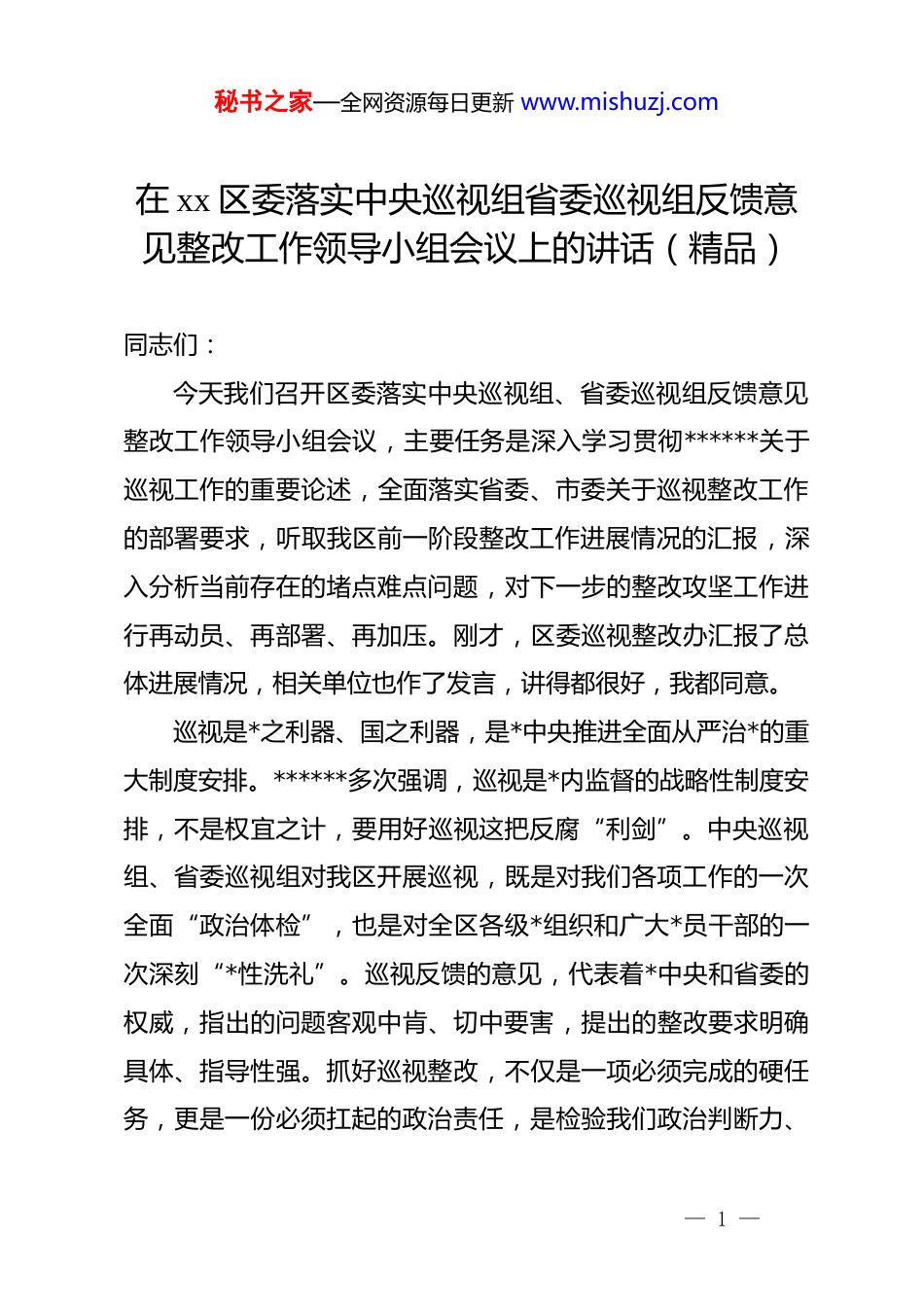 秘书之家—全网资源每日更新 www.mishuzj.com在 xx 区委落实中央巡视组省委巡视组反馈意见整改工作领导小组会议上的讲话(精品)同志们:今天我们召开区委落实中央巡视组、省委巡视组反馈意见整改工作领导小组会议,主要任务是深入学习贯彻******关于巡视工作的重要论述,全面落实省委、市委关于巡视整改工作的部署要求,听取我区前一阶段整改工作进展情况的汇报,深入分析当前存在的堵点难点问题,对下一步的整改攻坚工作进行再动员、再部署、再加压。刚才,区委巡视整改办汇报了总体进展情况,相关单位也作了发言,讲得都很好,我都同意。巡视是*之利器、国之利器,是*中央推进全面从严治*的重大制度安排。******多次强调,巡视是*内监督的战略性制度安排,不是权宜之计,要用好巡视这把反腐“利剑”。中央巡视组、省委巡视组对我区开展巡视,既是对我们各项工作的一次全面“政治体检”,也是对全区各级*组织和广大*员干部的一次深刻“*性洗礼”。巡视反馈的意见,代表着*中央和省委的权威,指出的问题客观中肯、切中要害,提出的整改要求明确具体、指导性强。抓好巡视整改,不仅是一项必须完成的硬任务,更是一份必须扛起的政治责任,是检验我们政治判断力、— 1 —秘书之家—全网资源每日更新 www.mishuzj.com政治领悟力、政治执行力的“试金石”。自反馈意见以来,区委高度重视,第一时间成立领导小组,迅速制定整改方案,建立工作台账,全区上下闻令而动、积极作为,整改工作取得了阶段性成效。根据整改办的统计,巡视反馈指出的四大方面共 47 个具体问题中,截至今天,我们已经完成整改 41 个,基本完成 6 个,一批群众反映强烈的突出问题得到有效解决,一批长期存在的制度性漏洞得到及时修补,风清气正的政治生态得到进一步巩固。这些成绩的取得,是全区各级*组织和广大*员干部共同努力的结果。在此,我代表区委,向大家付出的辛勤努力表示衷心的感谢!在肯定成绩的同时,我们必须清醒地认识到,巡视整改工作依然任重道远,绝不能有丝毫的松懈和麻痹。从刚才的汇报和日常掌握的情况看,一些深层次、根源性的问题仍需持续用力攻坚,一些领域的整改尚未完全触及根本,个别单位和干部还存在“过关思想”“侥幸心理”,认为集中整改期即将结束,可以“松口气、歇歇脚”。有的单位在整改措施上还不够精准,存在“上下一般粗”的现象;有的对跨部门、跨领域的复杂问题,协同联动机制还不够顺畅,存在推诿扯皮的风险;有的在建立长效机制上思考不深、谋划不远,存在问题反弹回潮的隐患。这些问题,都警示我们,巡视整改越到后期,越是考验我— 2 —秘书之家—全网资源每日更新 www.mishuzj.com们政治定力和责任担当的关键时刻。全区上下必须把思想和行动统一到*中央和省委、市委的决策部署上来,以“钉钉子”的精神一抓到底,坚决夺取巡视整改工作的全面胜利。下面,我再强调三点意见。一、提高政治站位,深化思想认识,以绝对忠诚的政治自觉扛起整改责任******指出,“巡视发现问题的目的是解决问题,发现问题不解决,比不巡视的效果还坏,巡视成果要善加运用”。抓好巡视整改,是践行“两个维护”最直接、最现实的体现。全区各级*组织和领导干部必须站在讲政治、讲大局、讲核心的高度,深刻认识巡视整改的极端重要性和紧迫性。第一,必须深刻认识到,抓好巡视整改是淬炼政治忠诚的“磨刀石”。巡视整改不是简单的业务工作,而是严肃的政治任务。整改的成效,直接反映了我们对*中央决策部署的态度和执行力。我们必须坚决摒弃“与己无关”的看客心态,主动把自己摆进去、把职责摆进去、把工作摆进去。巡视指出的每一个问题,无论大小,无论涉及哪个单位、哪个人,根子都在于政治站位不高、政治责任不强。全区各级领导干部特别是“一把手”,要带头从政治上认领问题、剖析问题、整改问题,以身作则、以上率下,带动全区形成“一级抓一级、层层抓落— 3 —秘书之家—全网资源每日更新 www.mishuzj.com实”的良好局面。要通过扎扎实实的整改,教育引导广大*员干部深刻领悟“两个确立”的决定性意义,增强“四个意识”、坚定“四个自信”、做到“两个维护”,始终在...