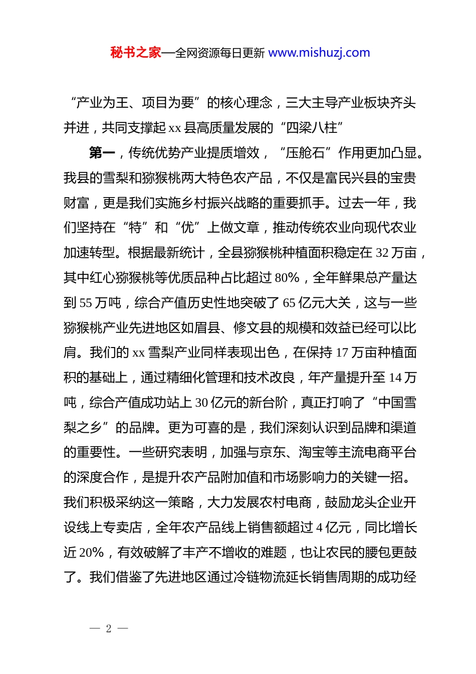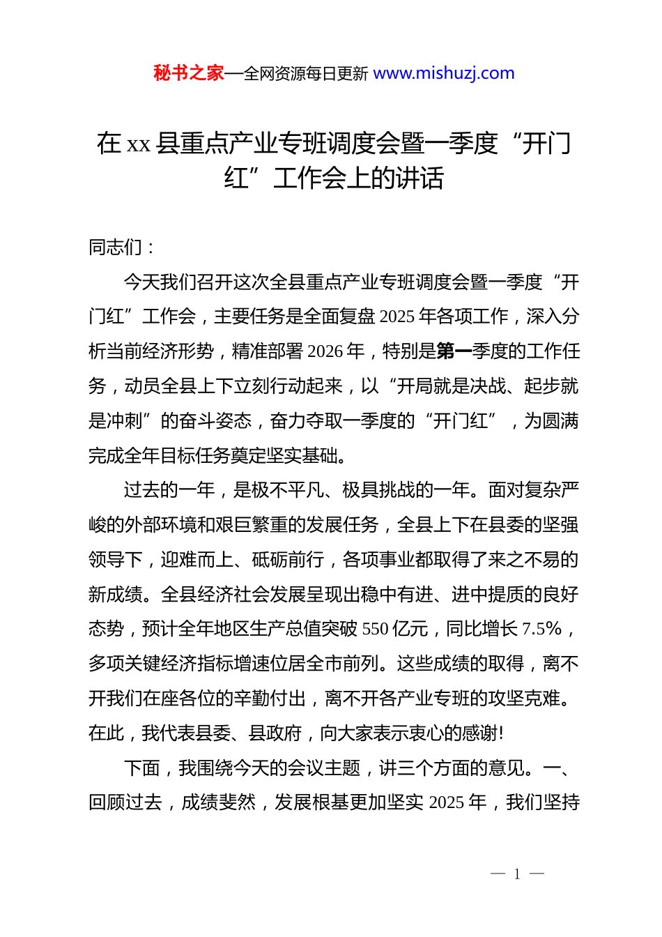 秘书之家—全网资源每日更新 www.mishuzj.com在 xx 县重点产业专班调度会暨一季度“开门红”工作会上的讲话同志们:今天我们召开这次全县重点产业专班调度会暨一季度“开门红”工作会,主要任务是全面复盘 2025 年各项工作,深入分析当前经济形势,精准部署 2026 年,特别是第一季度的工作任务,动员全县上下立刻行动起来,以“开局就是决战、起步就是冲刺”的奋斗姿态,奋力夺取一季度的“开门红”,为圆满完成全年目标任务奠定坚实基础。过去的一年,是极不平凡、极具挑战的一年。面对复杂严峻的外部环境和艰巨繁重的发展任务,全县上下在县委的坚强领导下,迎难而上、砥砺前行,各项事业都取得了来之不易的新成绩。全县经济社会发展呈现出稳中有进、进中提质的良好态势,预计全年地区生产总值突破 550 亿元,同比增长 7.5%,多项关键经济指标增速位居全市前列。这些成绩的取得,离不开我们在座各位的辛勤付出,离不开各产业专班的攻坚克难。在此,我代表县委、县政府,向大家表示衷心的感谢!下面,我围绕今天的会议主题,讲三个方面的意见。一、回顾过去,成绩斐然,发展根基更加坚实 2025 年,我们坚持— 1 —秘书之家—全网资源每日更新 www.mishuzj.com“产业为王、项目为要”的核心理念,三大主导产业板块齐头并进,共同支撑起 xx 县高质量发展的“四梁八柱”第一,传统优势产业提质增效,“压舱石”作用更加凸显。我县的雪梨和猕猴桃两大特色农产品,不仅是富民兴县的宝贵财富,更是我们实施乡村振兴战略的重要抓手。过去一年,我们坚持在“特”和“优”上做文章,推动传统农业向现代农业加速转型。根据最新统计,全县猕猴桃种植面积稳定在 32 万亩,其中红心猕猴桃等优质品种占比超过 80%,全年鲜果总产量达到 55 万吨,综合产值历史性地突破了 65 亿元大关,这与一些猕猴桃产业先进地区如眉县、修文县的规模和效益已经可以比肩。我们的 xx 雪梨产业同样表现出色,在保持 17 万亩种植面积的基础上,通过精细化管理和技术改良,年产量提升至 14 万吨,综合产值成功站上 30 亿元的新台阶,真正打响了“中国雪梨之乡”的品牌。更为可喜的是,我们深刻认识到品牌和渠道的重要性。一些研究表明,加强与京东、淘宝等主流电商平台的深度合作,是提升农产品附加值和市场影响力的关键一招。我们积极采纳这一策略,大力发展农村电商,鼓励龙头企业开设线上专卖店,全年农产品线上销售额超过 4 亿元,同比增长近 20%,有效破解了丰产不增收的难题,也让农民的腰包更鼓了。我们借鉴了先进地区通过冷链物流延长销售周期的成功经— 2 —秘书之家—全网资源每日更新 www.mishuzj.com验,目前我县的农产品产地预冷、冷链运输体系已初步建成,为“xx 优品”走向全国乃至更广阔的市场提供了坚实保障。第二,新兴工业项目多点开花,“主引擎”动能更加强劲。我们始终把工业作为立县之本、强县之基,坚定不移地推进新型工业化。2025 年,全县完成固定资产投资超过 150 亿元,同比增长 12%,其中工业投资占比超过 60%,为长远发展积蓄了强大后劲。一批投资规模大、科技含量高、带动能力强的重大项目取得了突破性进展。总投资 50 亿元的 xx 新材料产业园一期工程已全面封顶,部分设备正在进场调试,预计今年二季度即可试生产,这将填补我县在新能源电池材料领域的产业空白。总投资 35 亿元的 xx 智能制造及高端装备产业项目,自去年下半年开工以来,进展迅速,目前正在进行主厂房的钢结构吊装,展现了项目建设的“xx 速度”。我们清醒地认识到,产业的竟争力最终体现在产业链的完整性和韧性上。为此,我们围绕龙头企业,积极开展“延链、补链、强链”行动。在新材料产业园周边,我们已经成功引进了 3 家上游原材料供应企业和 2 家下游应用企业,一个集研发、生产、应用于一体的新材料产业集群正在加速形成。在招商引资方面,我们全年新签约亿元以上项目 22 个,总投资额超过 200 亿元,这些项目的落地将为我县的产业升级和经济转型注入源源不断的新动能。— 3 —秘书之家—全网资源每日更新 www.mishuzj.com第三,文旅融合发展...