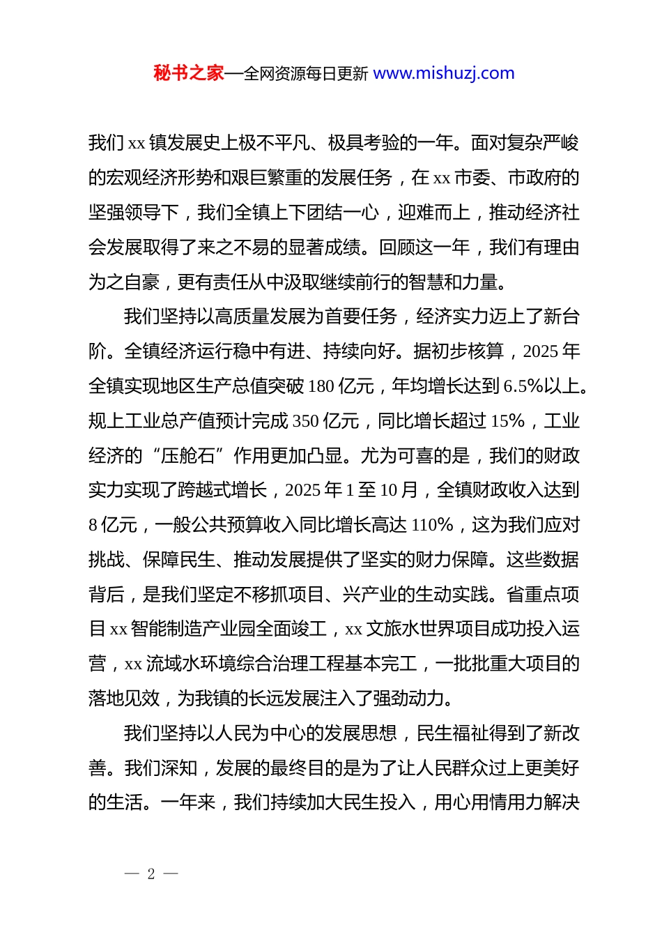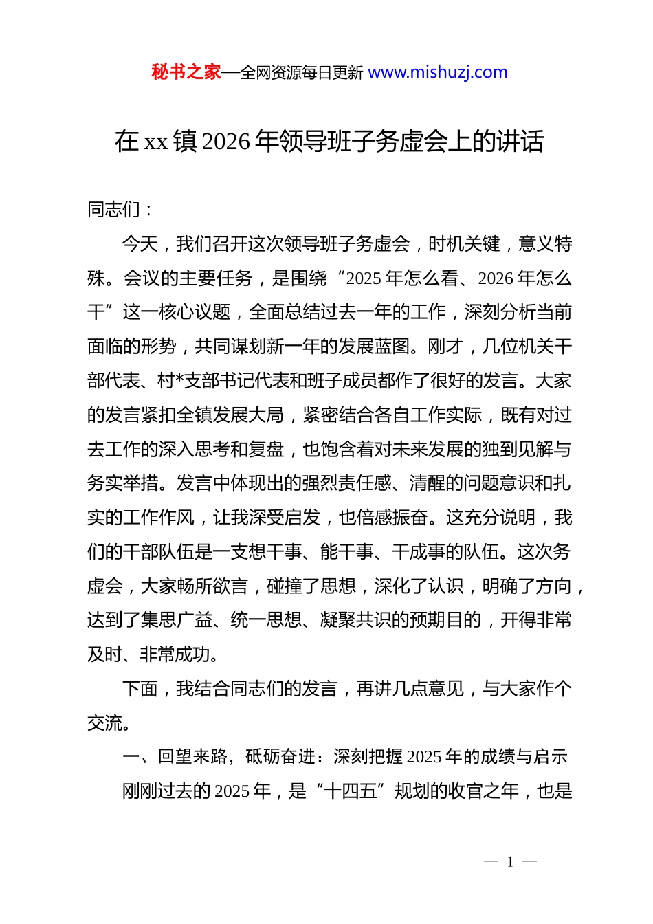 秘书之家—全网资源每日更新 www.mishuzj.com在 xx 镇 2026 年领导班子务虚会上的讲话同志们:今天,我们召开这次领导班子务虚会,时机关键,意义特殊。会议的主要任务,是围绕“2025 年怎么看、2026 年怎么干”这一核心议题,全面总结过去一年的工作,深刻分析当前面临的形势,共同谋划新一年的发展蓝图。刚才,几位机关干部代表、村*支部书记代表和班子成员都作了很好的发言。大家的发言紧扣全镇发展大局,紧密结合各自工作实际,既有对过去工作的深入思考和复盘,也饱含着对未来发展的独到见解与务实举措。发言中体现出的强烈责任感、清醒的问题意识和扎实的工作作风,让我深受启发,也倍感振奋。这充分说明,我们的干部队伍是一支想干事、能干事、干成事的队伍。这次务虚会,大家畅所欲言,碰撞了思想,深化了认识,明确了方向,达到了集思广益、统一思想、凝聚共识的预期目的,开得非常及时、非常成功。下面,我结合同志们的发言,再讲几点意见,与大家作个交流。一、回望来路,砥砺奋进:深刻把握 2025 年的成绩与启示刚刚过去的 2025 年,是“十四五”规划的收官之年,也是— 1 —秘书之家—全网资源每日更新 www.mishuzj.com我们 xx 镇发展史上极不平凡、极具考验的一年。面对复杂严峻的宏观经济形势和艰巨繁重的发展任务,在 xx 市委、市政府的坚强领导下,我们全镇上下团结一心,迎难而上,推动经济社会发展取得了来之不易的显著成绩。回顾这一年,我们有理由为之自豪,更有责任从中汲取继续前行的智慧和力量。我们坚持以高质量发展为首要任务,经济实力迈上了新台阶。全镇经济运行稳中有进、持续向好。据初步核算,2025 年全镇实现地区生产总值突破 180 亿元,年均增长达到 6.5%以上。规上工业总产值预计完成 350 亿元,同比增长超过 15%,工业经济的“压舱石”作用更加凸显。尤为可喜的是,我们的财政实力实现了跨越式增长,2025 年 1 至 10 月,全镇财政收入达到8 亿元,一般公共预算收入同比增长高达 110%,这为我们应对挑战、保障民生、推动发展提供了坚实的财力保障。这些数据背后,是我们坚定不移抓项目、兴产业的生动实践。省重点项目 xx 智能制造产业园全面竣工,xx 文旅水世界项目成功投入运营,xx 流域水环境综合治理工程基本完工,一批批重大项目的落地见效,为我镇的长远发展注入了强劲动力。我们坚持以人民为中心的发展思想,民生福祉得到了新改善。我们深知,发展的最终目的是为了让人民群众过上更美好的生活。一年来,我们持续加大民生投入,用心用情用力解决— 2 —秘书之家—全网资源每日更新 www.mishuzj.com群众的“急难愁盼”问题。在就业方面,我们通过开发公益性岗位等多种渠道,全力保障脱贫户等重点群体的稳定就业,全镇城镇登记失业人数始终控制在 xx 区下达的目标以内。在社会保障方面,城乡低保、医疗救助等政策全面落实,社会保障体系更加健全。我们还大力推进基础设施建设,一批群众期盼已久的道路交通、饮水安全、环境整治等工程顺利完工,城乡面貌焕然一新,人民群众的获得感、幸福感、安全感更加充实、更有保障、更可持续。我们坚持以 dj 引领为根本保证,治理效能实现了新提升。我们始终把抓好 dj 作为最大政绩,以高质量 dj 引领高质量发展。通过扎实开展 zt 教育,全镇*员干部的政治判断力、政治领悟力、政治执行力不断增强。基层*组织标准化、规范化建设水平持续提升,村级*组织的战斗堡垒作用和*员的先锋模范作用在乡村振兴、基层治理的一线得到了充分彰显。我们坚持和发展新时代“xx 经验”,深入开展矛盾纠纷排查化解,一批信访积案得到妥善处理,社会大局保持和谐稳定。平安建设、移风易俗等工作深入推进,文明乡风、良好家风、淳朴民风正在 xx 大地蔚然成风。同志们,成绩的取得,是 xx 市委、市政府正确领导的结果,是全镇人民共同奋斗的结果,更凝聚着在座各位以及全镇广大— 3 —秘书之家—全网资源每日更新 www.mishuzj.com干部职工的心血和汗水。在此,我代表镇*委,向大家表示衷心的感谢和崇高的敬意!在肯定成绩的同时,我们更要清醒地看到前进道路上的困难...