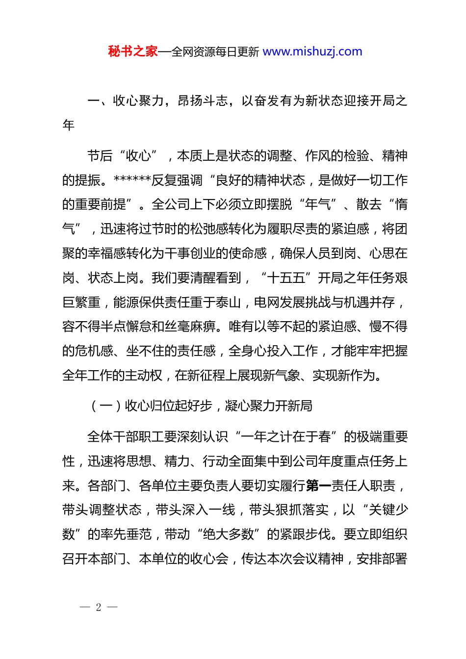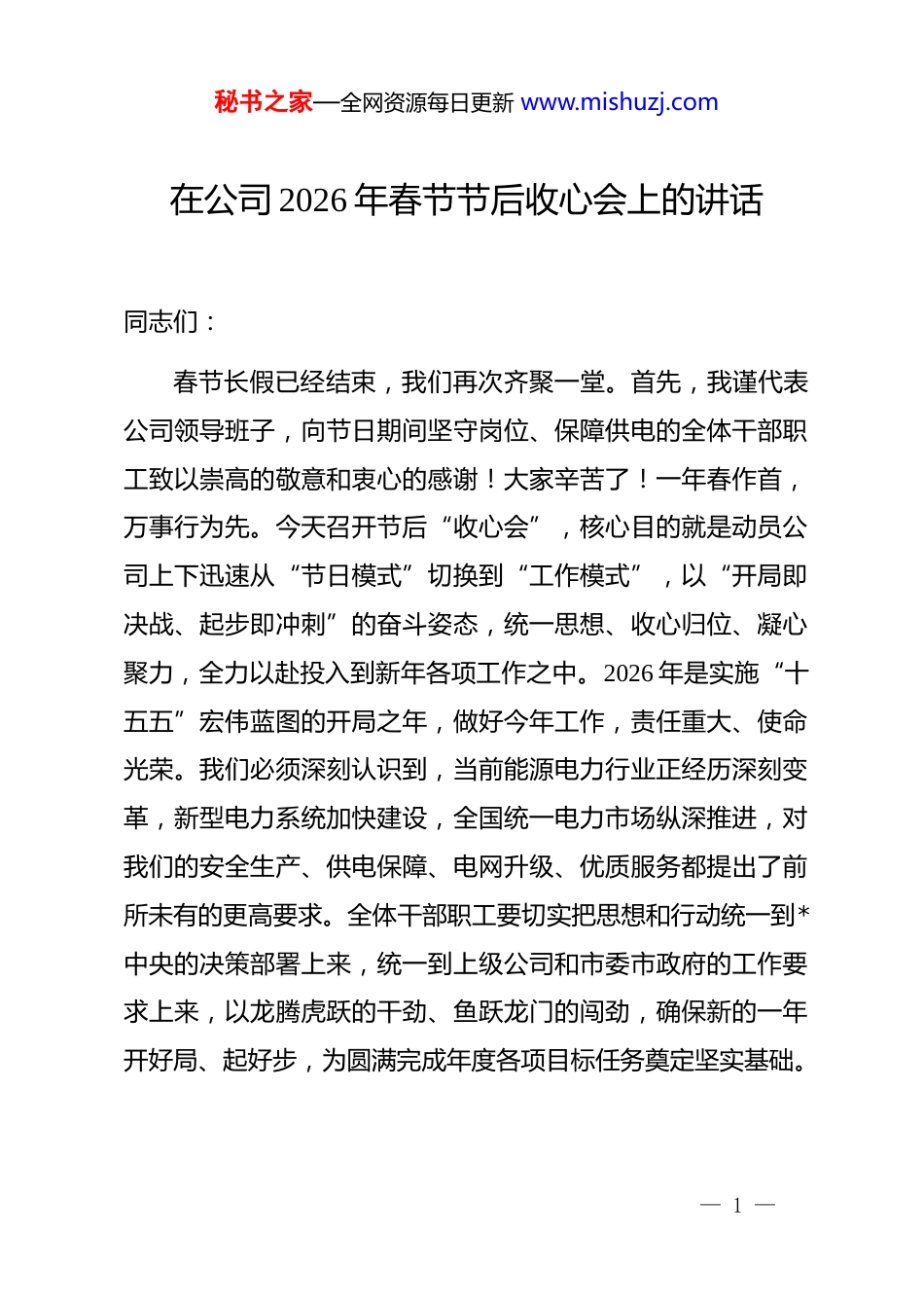 秘书之家—全网资源每日更新 www.mishuzj.com在公司 2026 年春节节后收心会上的讲话同志们:春节长假已经结束,我们再次齐聚一堂。首先,我谨代表公司领导班子,向节日期间坚守岗位、保障供电的全体干部职工致以崇高的敬意和衷心的感谢!大家辛苦了!一年春作首,万事行为先。今天召开节后“收心会”,核心目的就是动员公司上下迅速从“节日模式”切换到“工作模式”,以“开局即决战、起步即冲刺”的奋斗姿态,统一思想、收心归位、凝心聚力,全力以赴投入到新年各项工作之中。2026 年是实施“十五五”宏伟蓝图的开局之年,做好今年工作,责任重大、使命光荣。我们必须深刻认识到,当前能源电力行业正经历深刻变革,新型电力系统加快建设,全国统一电力市场纵深推进,对我们的安全生产、供电保障、电网升级、优质服务都提出了前所未有的更高要求。全体干部职工要切实把思想和行动统一到*中央的决策部署上来,统一到上级公司和市委市政府的工作要求上来,以龙腾虎跃的干劲、鱼跃龙门的闯劲,确保新的一年开好局、起好步,为圆满完成年度各项目标任务奠定坚实基础。— 1 —秘书之家—全网资源每日更新 www.mishuzj.com一、收心聚力,昂扬斗志,以奋发有为新状态迎接开局之年节后“收心”,本质上是状态的调整、作风的检验、精神的提振。******反复强调“良好的精神状态,是做好一切工作的重要前提”。全公司上下必须立即摆脱“年气”、散去“惰气”,迅速将过节时的松弛感转化为履职尽责的紧迫感,将团聚的幸福感转化为干事创业的使命感,确保人员到岗、心思在岗、状态上岗。我们要清醒看到,“十五五”开局之年任务艰巨繁重,能源保供责任重于泰山,电网发展挑战与机遇并存,容不得半点懈怠和丝毫麻痹。唯有以等不起的紧迫感、慢不得的危机感、坐不住的责任感,全身心投入工作,才能牢牢把握全年工作的主动权,在新征程上展现新气象、实现新作为。(一)收心归位起好步,凝心聚力开新局全体干部职工要深刻认识“一年之计在于春”的极端重要性,迅速将思想、精力、行动全面集中到公司年度重点任务上来。各部门、各单位主要负责人要切实履行第一责任人职责,带头调整状态,带头深入一线,带头狠抓落实,以“关键少数”的率先垂范,带动“绝大多数”的紧跟步伐。要立即组织召开本部门、本单位的收心会,传达本次会议精神,安排部署— 2 —秘书之家—全网资源每日更新 www.mishuzj.com具体工作,确保公司各项决策部署第一时间传达至基层班组、落实到每个岗位。要严明工作纪律,加强监督检查,坚决杜绝节后“懒、涣、散”现象,确保各项工作纪律、规章制度执行到位。各级管理人员要深入基层、深入现场,了解实情、解决问题,推动各项工作迅速步入正轨、高效运转。要通过有效的思想动员和组织保障,在公司上下营造出紧张有序、奋发向上、务实高效的工作氛围,为全年工作赢得“开门红”提供坚强的思想和作风保障。(二)筑牢安全压舱石,坚守保供生命线安全生产是电力企业的生命线,是不可逾越的红线、必须守牢的底线。******指出:“发展决不能以牺牲人的生命为代价,这必须作为一条不可逾越的红线。”我们必须将这一****精神内化于心、外化于行,以“时时放心不下”的责任感,持之以恒抓好安全生产。要深刻汲取行业内外事故教训,牢固树立“人民至上、生命至上”和“安全是硬道理”的理念,将安全发展贯穿于公司生产经营全过程。要高质量推进安全生产治本攻坚三年行动,聚焦重点领域和关键环节,深入排查整治重大事故隐患,坚决打好隐患治理攻坚战。要压紧压实各级安全生产责任链条,严格落实“三管三必须”要求,将责任细化分— 3 —秘书之家—全网资源每日更新 www.mishuzj.com解到每个环节、每个岗位、每个员工,确保安全压力传导到位。要强化设备精益管理,运用无人机巡检、智能监控等科技手段,提升设备健康水平和运维效率。要突出抓好电网安全稳定运行,科学安排电网运行方式,强化风险预警预控,提升应急处置能力,坚决守住不发生大面积停电事故的底线。当前,迎峰度冬保供仍处于关键时期,叠加全国两会即将召开,保电责任重大。我们必须完善保供协同机制,密切跟踪...
