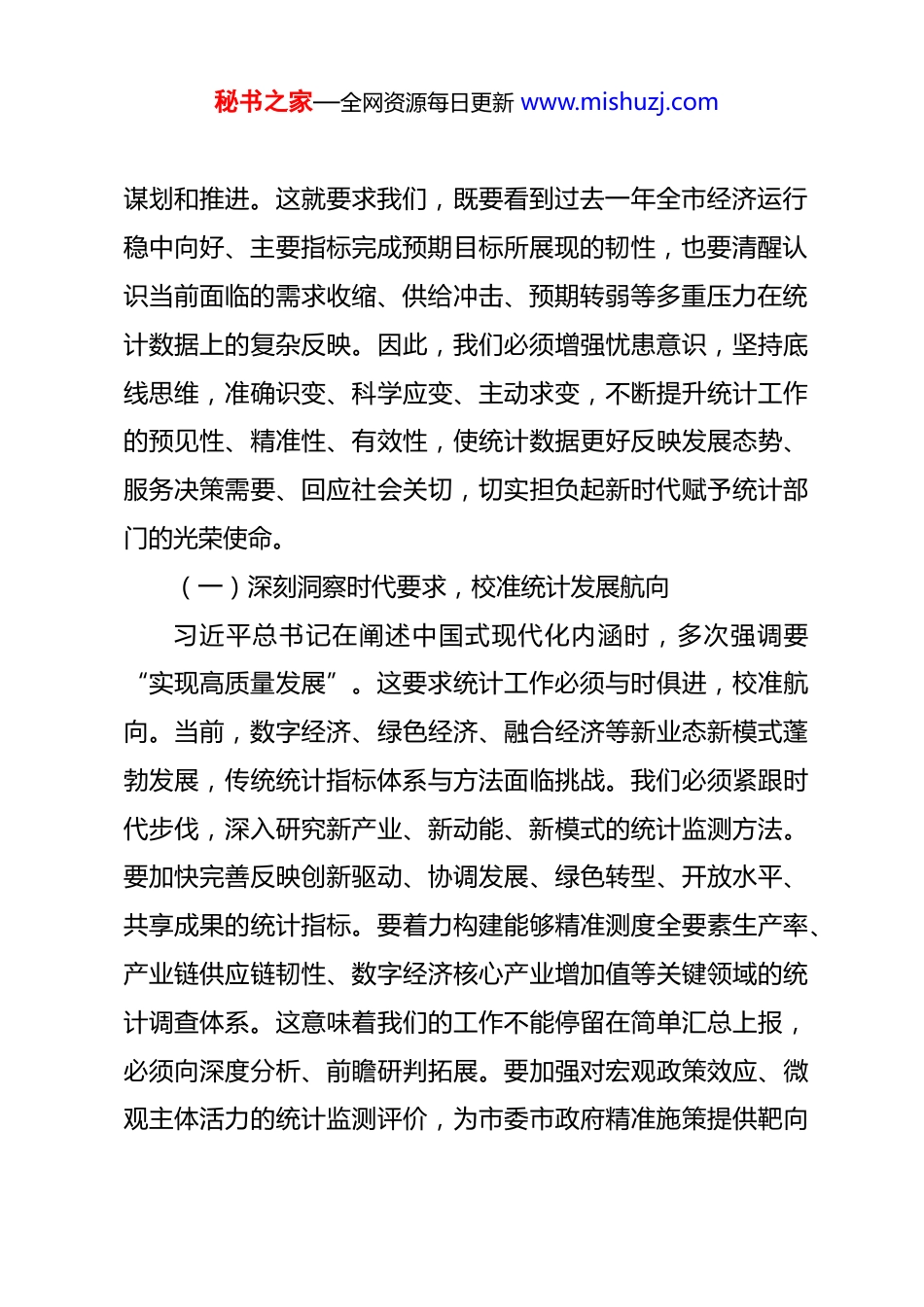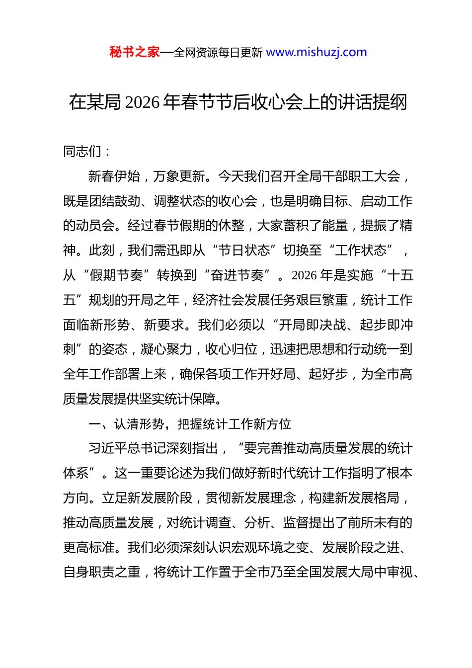 秘书之家—全网资源每日更新 www.mishuzj.com在某局 2026 年春节节后收心会上的讲话提纲 同志们:新春伊始,万象更新。今天我们召开全局干部职工大会,既是团结鼓劲、调整状态的收心会,也是明确目标、启动工作的动员会。经过春节假期的休整,大家蓄积了能量,提振了精神。此刻,我们需迅即从“节日状态”切换至“工作状态”,从“假期节奏”转换到“奋进节奏”。2026 年是实施“十五五”规划的开局之年,经济社会发展任务艰巨繁重,统计工作面临新形势、新要求。我们必须以“开局即决战、起步即冲刺”的姿态,凝心聚力,收心归位,迅速把思想和行动统一到全年工作部署上来,确保各项工作开好局、起好步,为全市高质量发展提供坚实统计保障。一、认清形势,把握统计工作新方位习近平总书记深刻指出,“要完善推动高质量发展的统计体系”。这一重要论述为我们做好新时代统计工作指明了根本方向。立足新发展阶段,贯彻新发展理念,构建新发展格局,推动高质量发展,对统计调查、分析、监督提出了前所未有的更高标准。我们必须深刻认识宏观环境之变、发展阶段之进、自身职责之重,将统计工作置于全市乃至全国发展大局中审视、秘书之家—全网资源每日更新 www.mishuzj.com谋划和推进。这就要求我们,既要看到过去一年全市经济运行稳中向好、主要指标完成预期目标所展现的韧性,也要清醒认识当前面临的需求收缩、供给冲击、预期转弱等多重压力在统计数据上的复杂反映。因此,我们必须增强忧患意识,坚持底线思维,准确识变、科学应变、主动求变,不断提升统计工作的预见性、精准性、有效性,使统计数据更好反映发展态势、服务决策需要、回应社会关切,切实担负起新时代赋予统计部门的光荣使命。(一)深刻洞察时代要求,校准统计发展航向习近平总书记在阐述中国式现代化内涵时,多次强调要“实现高质量发展”。这要求统计工作必须与时俱进,校准航向。当前,数字经济、绿色经济、融合经济等新业态新模式蓬勃发展,传统统计指标体系与方法面临挑战。我们必须紧跟时代步伐,深入研究新产业、新动能、新模式的统计监测方法。要加快完善反映创新驱动、协调发展、绿色转型、开放水平、共享成果的统计指标。要着力构建能够精准测度全要素生产率、产业链供应链韧性、数字经济核心产业增加值等关键领域的统计调查体系。这意味着我们的工作不能停留在简单汇总上报,必须向深度分析、前瞻研判拓展。要加强对宏观政策效应、微观主体活力的统计监测评价,为市委市政府精准施策提供靶向秘书之家—全网资源每日更新 www.mishuzj.com数据支持。统计工作者要成为经济社会发展的“晴雨表”、“测量仪”和“诊断器”,通过数据揭示规律、研判趋势、预警风险。我们必须打破思维定势和路径依赖,主动学习新知识、掌握新技能、应用新技术,使统计能力与现代经济发展同频共振。要持续推进统计制度方法改革,探索运用大数据、人工智能等现代信息技术改造数据生产流程,提升统计生产力。要将数据质量作为统计工作的生命线贯穿始终,不断完善覆盖全员、全流程、全领域的统计数据质量控制体系,确保每一个数据都经得起历史和实践的检验。(二)清醒认识风险挑战,筑牢统计数据防线习近平总书记要求,“防范化解重大风险”,“维护国家数据安全”。统计数据安全是国家安全的重要组成部分,数据质量是统计工作的根基。当前,统计环境日趋复杂,源头数据采集难度加大,个别领域可能存在的数据失真风险不容忽视。同时,数据发布、解读、应用过程中面临的舆论压力和误读风险也在增加。我们必须时刻绷紧数据质量这根弦,将防范和惩治统计造假、弄虚作假作为重要的政治纪律和政治规矩来执行。要压实各级统计机构的主体责任、监督责任,严格落实数据质量分级管控和问责机制。要加强对调查对象的法律法规宣传和统计业务指导,提升其配合度和填报能力,保障源头数据真实秘书之家—全网资源每日更新 www.mishuzj.com准确。要健全统计执法检查机制,加大“双随机”抽查和重点核查力度,对统计违法行为保持零容忍的高压态势。在数据发布和解读环节,要完善舆情监测和应对预案,主动设置议题,精准解读数据,及时澄清谬误...