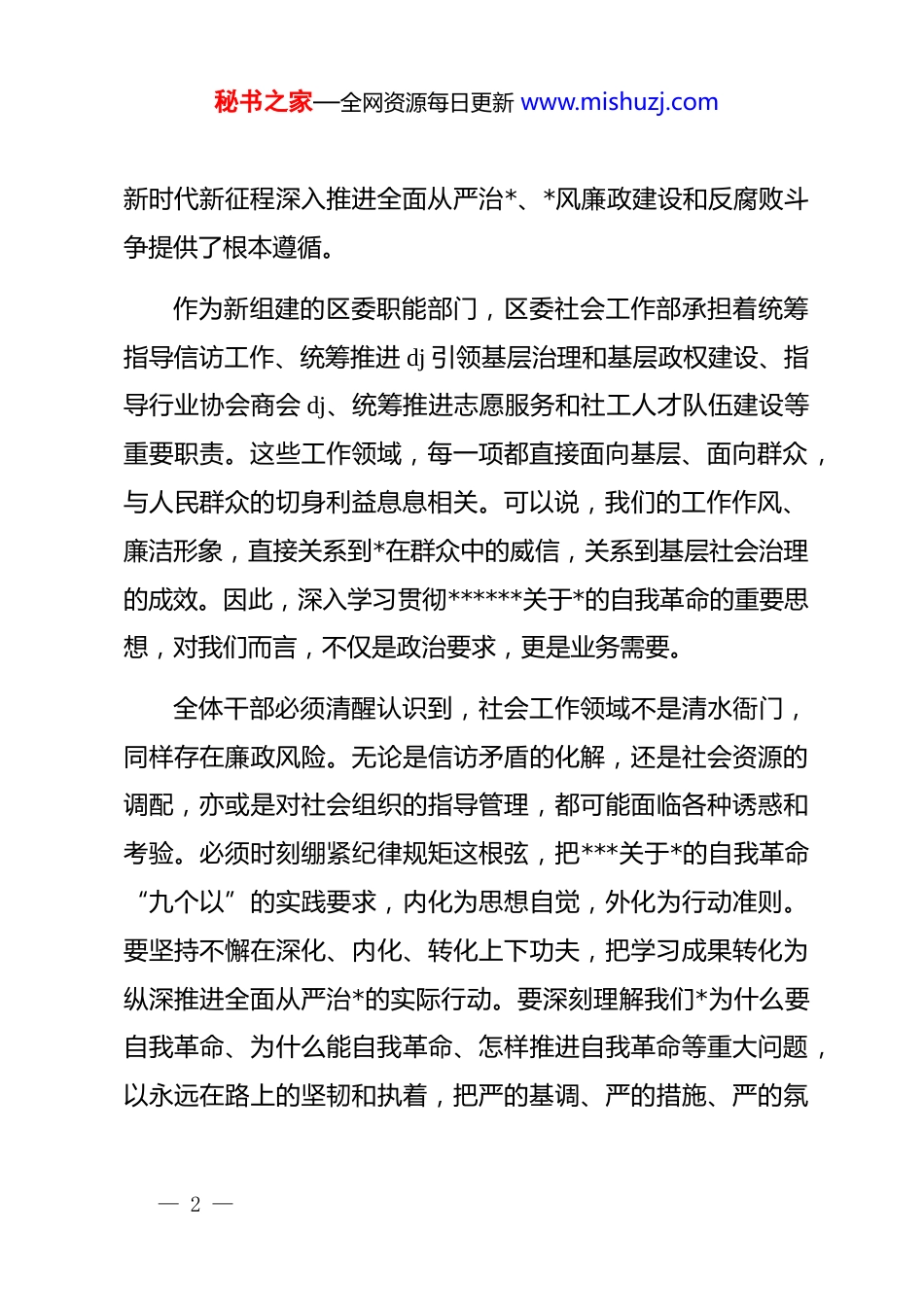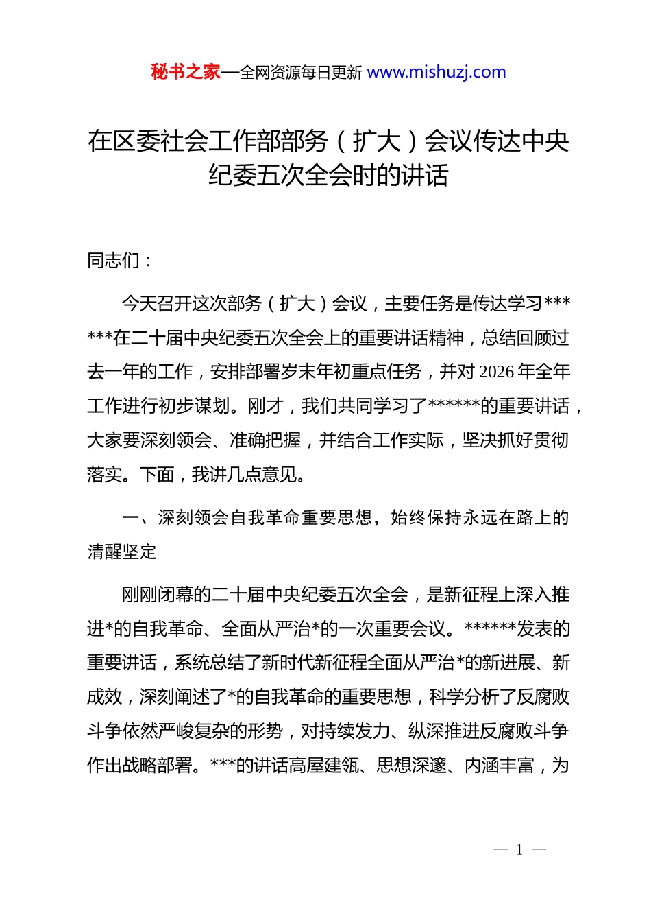 秘书之家—全网资源每日更新 www.mishuzj.com在区委社会工作部部务(扩大)会议传达中央纪委五次全会时的讲话同志们:今天召开这次部务(扩大)会议,主要任务是传达学习******在二十届中央纪委五次全会上的重要讲话精神,总结回顾过去一年的工作,安排部署岁末年初重点任务,并对 2026 年全年工作进行初步谋划。刚才,我们共同学习了******的重要讲话,大家要深刻领会、准确把握,并结合工作实际,坚决抓好贯彻落实。下面,我讲几点意见。一、深刻领会自我革命重要思想,始终保持永远在路上的清醒坚定刚刚闭幕的二十届中央纪委五次全会,是新征程上深入推进*的自我革命、全面从严治*的一次重要会议。******发表的重要讲话,系统总结了新时代新征程全面从严治*的新进展、新成效,深刻阐述了*的自我革命的重要思想,科学分析了反腐败斗争依然严峻复杂的形势,对持续发力、纵深推进反腐败斗争作出战略部署。***的讲话高屋建瓴、思想深邃、内涵丰富,为— 1 —秘书之家—全网资源每日更新 www.mishuzj.com新时代新征程深入推进全面从严治*、*风廉政建设和反腐败斗争提供了根本遵循。作为新组建的区委职能部门,区委社会工作部承担着统筹指导信访工作、统筹推进 dj 引领基层治理和基层政权建设、指导行业协会商会 dj、统筹推进志愿服务和社工人才队伍建设等重要职责。这些工作领域,每一项都直接面向基层、面向群众,与人民群众的切身利益息息相关。可以说,我们的工作作风、廉洁形象,直接关系到*在群众中的威信,关系到基层社会治理的成效。因此,深入学习贯彻******关于*的自我革命的重要思想,对我们而言,不仅是政治要求,更是业务需要。全体干部必须清醒认识到,社会工作领域不是清水衙门,同样存在廉政风险。无论是信访矛盾的化解,还是社会资源的调配,亦或是对社会组织的指导管理,都可能面临各种诱惑和考验。必须时刻绷紧纪律规矩这根弦,把***关于*的自我革命“九个以”的实践要求,内化为思想自觉,外化为行动准则。要坚持不懈在深化、内化、转化上下功夫,把学习成果转化为纵深推进全面从严治*的实际行动。要深刻理解我们*为什么要自我革命、为什么能自我革命、怎样推进自我革命等重大问题,以永远在路上的坚韧和执着,把严的基调、严的措施、严的氛— 2 —秘书之家—全网资源每日更新 www.mishuzj.com围长期坚持下去,确保*和人民赋予的权力始终用来为人民服务。二、回顾开局之年,奠定坚实基础,社会工作新格局初步显现2025 年是**区委社会工作部组建运行的开局之年。一年来,在区委的坚强领导下,我们坚持边组建、边履职、边谋划,紧紧围绕加强*对社会工作的全面领导这一主线,各项工作实现了良好开局,为全区社会工作事业的发展奠定了坚实基础。一是组织体系架构实现新重塑。我们平稳有序完成了机构组建、职能划转和人员转隶,厘清了与相关部门的职责边界,初步解决了职能分散、交叉等问题,建立健全了内部运行机制。通过深入调研和系统谋划,明确了新时代我区社会工作的定位、目标和路径,*对社会工作的全面领导得到有效加强,“大社会”工作格局初步形成。二是 dj 引领基层治理开创新局面。我们坚持和发展新时代“枫桥经验”,以 dj 引领基层治理为主线,深入推进网格化管理服务,推动资源、管理、服务向基层下沉。全年指导化解基层各类矛盾纠纷超过 1200 件,一批群众急难愁盼的信访积案得到有效化解,基层治理效能显著提升。我们大力推进“两企三— 3 —秘书之家—全网资源每日更新 www.mishuzj.com新”dj 工作,特别是在新兴领域 dj 方面取得了突破,新兴业态群体的组织覆盖和工作覆盖不断扩大,*的政治优势和组织优势正转化为基层治理的强大动能。三是社会力量协同共治焕发新活力。我们统筹推进全区志愿服务事业发展,着力构建制度化、常态化、品牌化的志愿服务体系。截至 2025 年底,全区注册志愿者人数突破 15 万人,涌现出“**暖流”“银发守护”等一批有影响力的志愿服务品牌,群众的获得感和幸福感在参与和奉献中得到提升。同时,我们加强了对社会工作人才的培养和使用,2025 年全区新增持证社工 600 余名,专业化社工队...