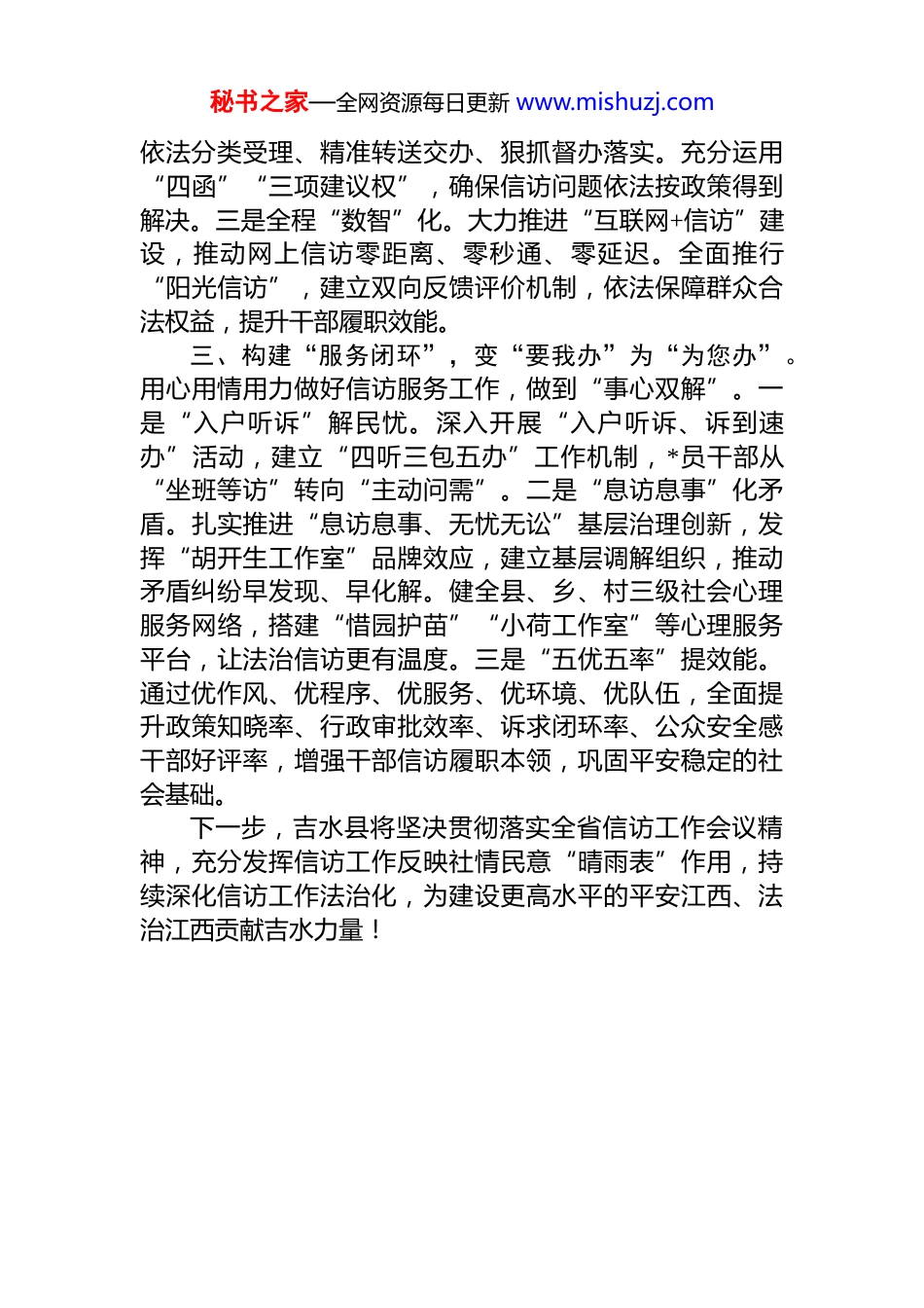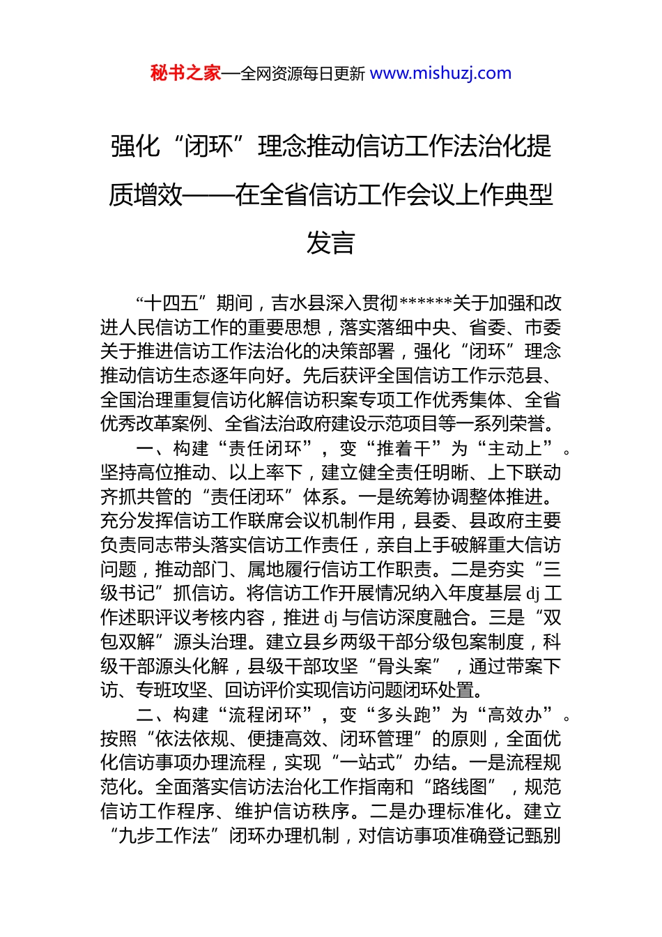 秘书之家—全网资源每日更新 www.mishuzj.com强化“闭环”理念推动信访工作法治化提质增效——在全省信访工作会议上作典型发言“十四五”期间,吉水县深入贯彻******关于加强和改进人民信访工作的重要思想,落实落细中央、省委、市委关于推进信访工作法治化的决策部署,强化“闭环”理念推动信访生态逐年向好。先后获评全国信访工作示范县、全国治理重复信访化解信访积案专项工作优秀集体、全省优秀改革案例、全省法治政府建设示范项目等一系列荣誉。一、构建“责任闭环”,变“推着干”为“主动上”。坚持高位推动、以上率下,建立健全责任明晰、上下联动齐抓共管的“责任闭环”体系。一是统筹协调整体推进。充分发挥信访工作联席会议机制作用,县委、县政府主要负责同志带头落实信访工作责任,亲自上手破解重大信访问题,推动部门、属地履行信访工作职责。二是夯实“三级书记”抓信访。将信访工作开展情况纳入年度基层 dj 工作述职评议考核内容,推进 dj 与信访深度融合。三是“双包双解”源头治理。建立县乡两级干部分级包案制度,科级干部源头化解,县级干部攻坚“骨头案”,通过带案下访、专班攻坚、回访评价实现信访问题闭环处置。二、构建“流程闭环”,变“多头跑”为“高效办”。按照“依法依规、便捷高效、闭环管理”的原则,全面优化信访事项办理流程,实现“一站式”办结。一是流程规范化。全面落实信访法治化工作指南和“路线图”,规范信访工作程序、维护信访秩序。二是办理标准化。建立“九步工作法”闭环办理机制,对信访事项准确登记甄别秘书之家—全网资源每日更新 www.mishuzj.com依法分类受理、精准转送交办、狠抓督办落实。充分运用“四函”“三项建议权”,确保信访问题依法按政策得到解决。三是全程“数智”化。大力推进“互联网+信访”建设,推动网上信访零距离、零秒通、零延迟。全面推行“阳光信访”,建立双向反馈评价机制,依法保障群众合法权益,提升干部履职效能。三、构建“服务闭环”,变“要我办”为“为您办”。用心用情用力做好信访服务工作,做到“事心双解”。一是“入户听诉”解民忧。深入开展“入户听诉、诉到速办”活动,建立“四听三包五办”工作机制,*员干部从“坐班等访”转向“主动问需”。二是“息访息事”化矛盾。扎实推进“息访息事、无忧无讼”基层治理创新,发挥“胡开生工作室”品牌效应,建立基层调解组织,推动矛盾纠纷早发现、早化解。健全县、乡、村三级社会心理服务网络,搭建“惜园护苗”“小荷工作室”等心理服务平台,让法治信访更有温度。三是“五优五率”提效能。通过优作风、优程序、优服务、优环境、优队伍,全面提升政策知晓率、行政审批效率、诉求闭环率、公众安全感干部好评率,增强干部信访履职本领,巩固平安稳定的社会基础。下一步,吉水县将坚决贯彻落实全省信访工作会议精神,充分发挥信访工作反映社情民意“晴雨表”作用,持续深化信访工作法治化,为建设更高水平的平安江西、法治江西贡献吉水力量!