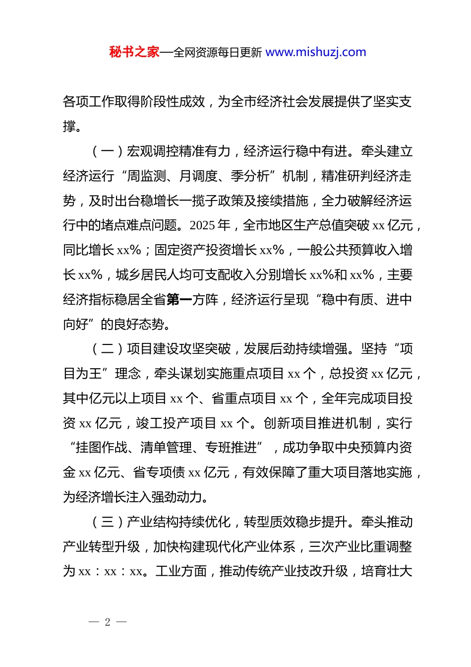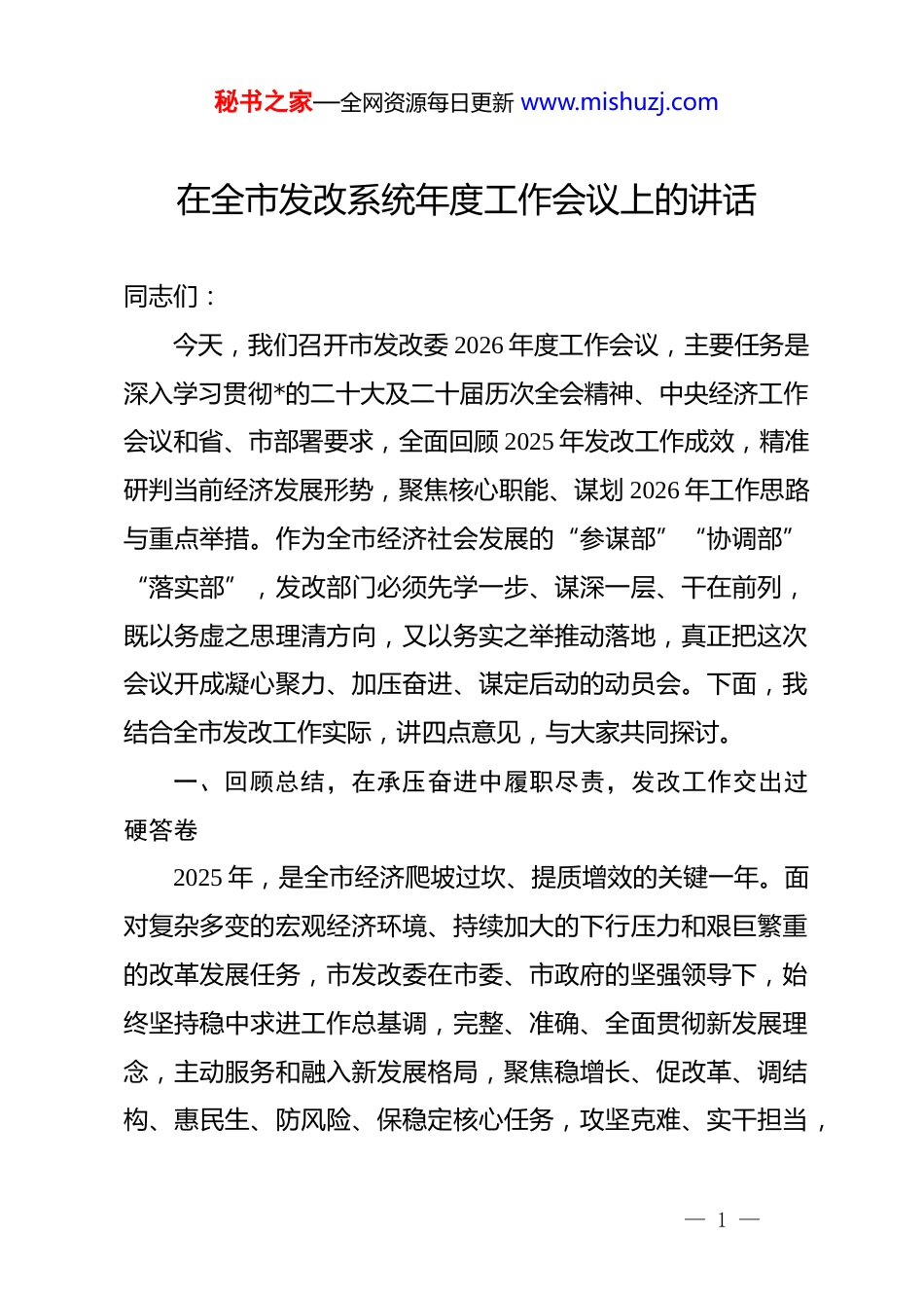 秘书之家—全网资源每日更新 www.mishuzj.com在全市发改系统年度工作会议上的讲话同志们:今天,我们召开市发改委 2026 年度工作会议,主要任务是深入学习贯彻*的二十大及二十届历次全会精神、中央经济工作会议和省、市部署要求,全面回顾 2025 年发改工作成效,精准研判当前经济发展形势,聚焦核心职能、谋划 2026 年工作思路与重点举措。作为全市经济社会发展的“参谋部”“协调部”“落实部”,发改部门必须先学一步、谋深一层、干在前列,既以务虚之思理清方向,又以务实之举推动落地,真正把这次会议开成凝心聚力、加压奋进、谋定后动的动员会。下面,我结合全市发改工作实际,讲四点意见,与大家共同探讨。一、回顾总结,在承压奋进中履职尽责,发改工作交出过硬答卷2025 年,是全市经济爬坡过坎、提质增效的关键一年。面对复杂多变的宏观经济环境、持续加大的下行压力和艰巨繁重的改革发展任务,市发改委在市委、市政府的坚强领导下,始终坚持稳中求进工作总基调,完整、准确、全面贯彻新发展理念,主动服务和融入新发展格局,聚焦稳增长、促改革、调结构、惠民生、防风险、保稳定核心任务,攻坚克难、实干担当,— 1 —秘书之家—全网资源每日更新 www.mishuzj.com各项工作取得阶段性成效,为全市经济社会发展提供了坚实支撑。(一)宏观调控精准有力,经济运行稳中有进。牵头建立经济运行“周监测、月调度、季分析”机制,精准研判经济走势,及时出台稳增长一揽子政策及接续措施,全力破解经济运行中的堵点难点问题。2025 年,全市地区生产总值突破 xx 亿元,同比增长 xx%;固定资产投资增长 xx%,一般公共预算收入增长 xx%,城乡居民人均可支配收入分别增长 xx%和 xx%,主要经济指标稳居全省第一方阵,经济运行呈现“稳中有质、进中向好”的良好态势。(二)项目建设攻坚突破,发展后劲持续增强。坚持“项目为王”理念,牵头谋划实施重点项目 xx 个,总投资 xx 亿元,其中亿元以上项目 xx 个、省重点项目 xx 个,全年完成项目投资 xx 亿元,竣工投产项目 xx 个。创新项目推进机制,实行“挂图作战、清单管理、专班推进”,成功争取中央预算内资金 xx 亿元、省专项债 xx 亿元,有效保障了重大项目落地实施,为经济增长注入强劲动力。(三)产业结构持续优化,转型质效稳步提升。牵头推动产业转型升级,加快构建现代化产业体系,三次产业比重调整为 xx:xx:xx。工业方面,推动传统产业技改升级,培育壮大— 2 —秘书之家—全网资源每日更新 www.mishuzj.com新能源、新材料、高端装备制造等新兴产业集群,全市规上工业增加值增长 xx%,高新技术产业产值占比提升至 xx%;服务业方面,加快发展现代物流、电子商务、数字经济等新业态,服务业增加值增长 xx%;农业方面,大力推进农业产业化经营,培育省级以上农业龙头企业 xx 家,特色农业集群效应凸显。(四)改革创新纵深推进,发展活力不断释放。深化“放管服”改革,推进投资项目审批制度改革,实现一般投资项目审批时限压缩至 xx 个工作日以内。积极推进要素市场化配置改革,深化财税金融体制改革,扎实做好优化营商环境相关工作,全市营商环境评价稳居全省前列。(五)民生福祉持续厚植,发展底色更加鲜明。牵头谋划实施 xx 项民生实事,推动教育、医疗、养老等公共服务设施建设,全年民生领域投资占比达 xx%。扎实推进乡村振兴战略,巩固拓展脱贫攻坚成果,推动城乡融合发展,统筹做好粮食安全、能源保供、物价稳定等工作,切实筑牢民生保障底线,群众获得感、幸福感、安全感持续提升。在肯定成绩的同时,我们更要清醒认识到,发改工作还面临诸多短板和挑战:一是宏观调控的精准性、前瞻性有待提升,应对复杂经济形势的政策储备和工具箱不够丰富;二是项目谋划的质量和层次不高,产业链招商、精准招商力度不足,部分— 3 —秘书之家—全网资源每日更新 www.mishuzj.com项目推进缓慢,要素保障瓶颈尚未完全破解;三是产业转型升级步伐不够快,传统产业占比偏高,新兴产业规模偏小,产业链条不够完善,核心竞争力不强;四是改革创新的深度和广度不足,部分改革举措...
