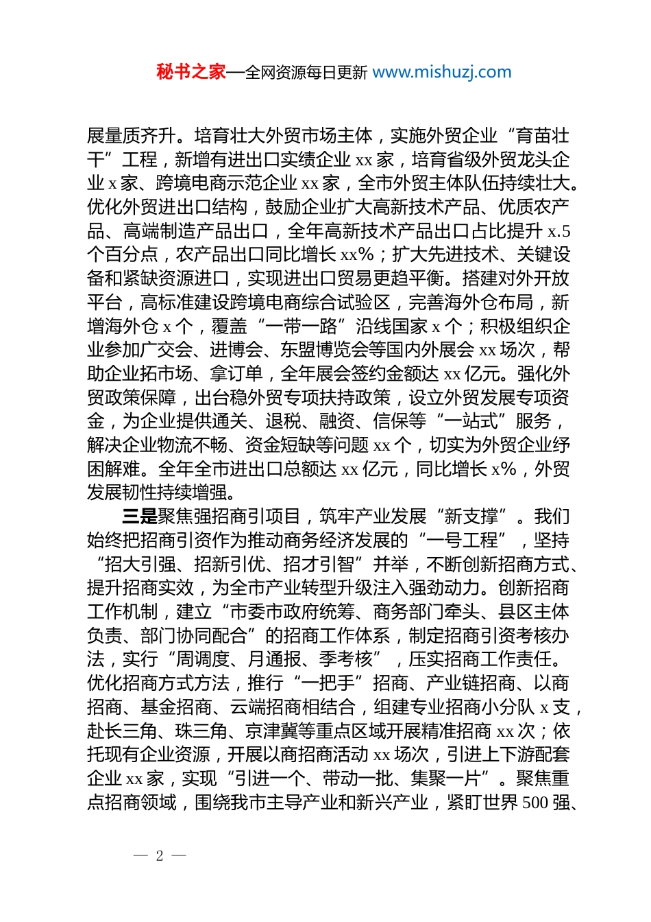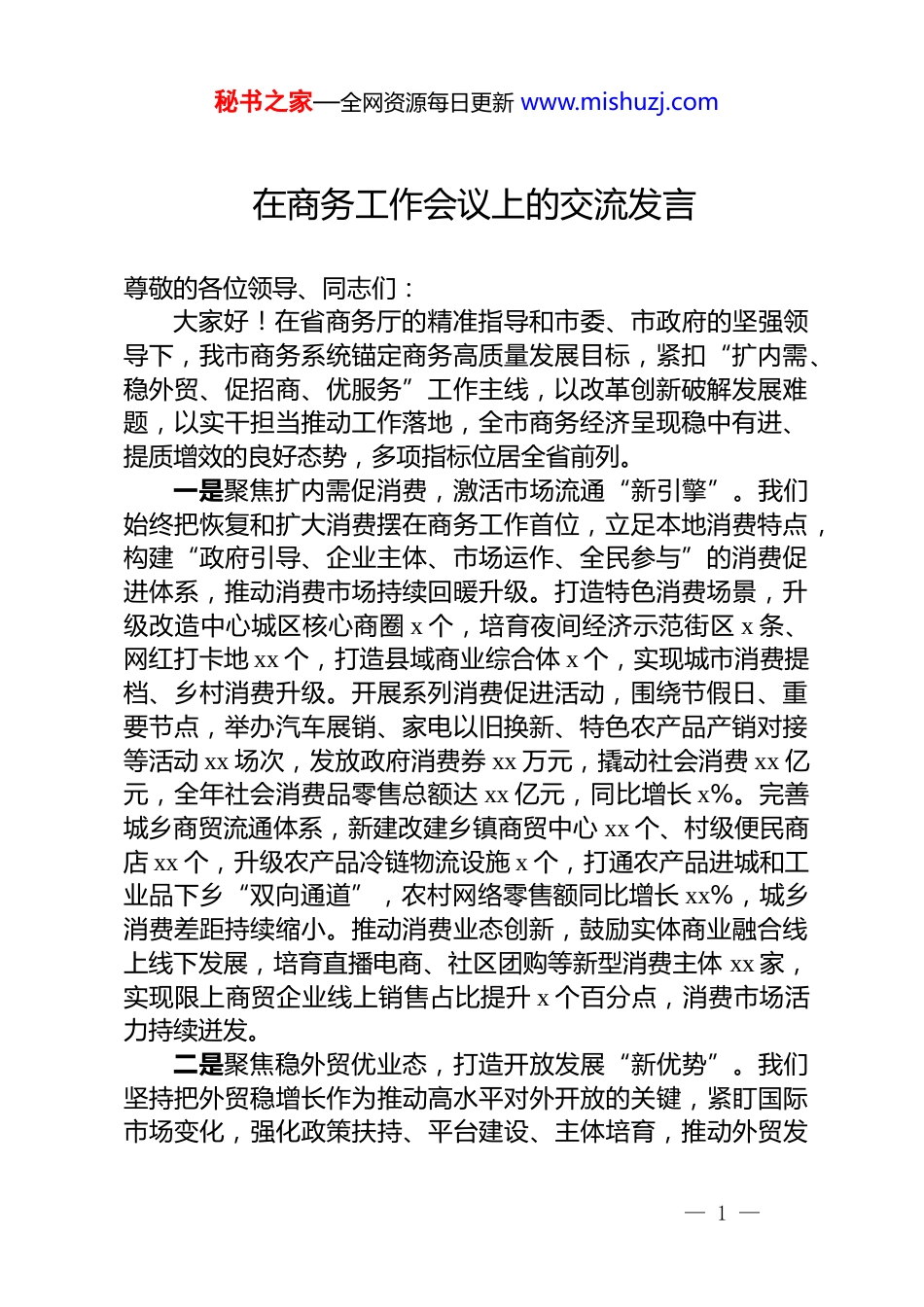 秘书之家—全网资源每日更新 www.mishuzj.com在商务工作会议上的交流发言尊敬的各位领导、同志们:大家好!在省商务厅的精准指导和市委、市政府的坚强领导下,我市商务系统锚定商务高质量发展目标,紧扣“扩内需、稳外贸、促招商、优服务”工作主线,以改革创新破解发展难题,以实干担当推动工作落地,全市商务经济呈现稳中有进、提质增效的良好态势,多项指标位居全省前列。一是聚焦扩内需促消费,激活市场流通“新引擎”。我们始终把恢复和扩大消费摆在商务工作首位,立足本地消费特点,构建“政府引导、企业主体、市场运作、全民参与”的消费促进体系,推动消费市场持续回暖升级。打造特色消费场景,升级改造中心城区核心商圈 x 个,培育夜间经济示范街区 x 条、网红打卡地 xx 个,打造县域商业综合体 x 个,实现城市消费提档、乡村消费升级。开展系列消费促进活动,围绕节假日、重要节点,举办汽车展销、家电以旧换新、特色农产品产销对接等活动 xx 场次,发放政府消费券 xx 万元,撬动社会消费 xx 亿元,全年社会消费品零售总额达 xx 亿元,同比增长 x%。完善城乡商贸流通体系,新建改建乡镇商贸中心 xx 个、村级便民商店 xx 个,升级农产品冷链物流设施 x 个,打通农产品进城和工业品下乡“双向通道”,农村网络零售额同比增长 xx%,城乡消费差距持续缩小。推动消费业态创新,鼓励实体商业融合线上线下发展,培育直播电商、社区团购等新型消费主体 xx 家,实现限上商贸企业线上销售占比提升 x 个百分点,消费市场活力持续迸发。二是聚焦稳外贸优业态,打造开放发展“新优势”。我们坚持把外贸稳增长作为推动高水平对外开放的关键,紧盯国际市场变化,强化政策扶持、平台建设、主体培育,推动外贸发— 1 —秘书之家—全网资源每日更新 www.mishuzj.com展量质齐升。培育壮大外贸市场主体,实施外贸企业“育苗壮干”工程,新增有进出口实绩企业 xx 家,培育省级外贸龙头企业 x 家、跨境电商示范企业 xx 家,全市外贸主体队伍持续壮大。优化外贸进出口结构,鼓励企业扩大高新技术产品、优质农产品、高端制造产品出口,全年高新技术产品出口占比提升 x.5个百分点,农产品出口同比增长 xx%;扩大先进技术、关键设备和紧缺资源进口,实现进出口贸易更趋平衡。搭建对外开放平台,高标准建设跨境电商综合试验区,完善海外仓布局,新增海外仓 x 个,覆盖“一带一路”沿线国家 x 个;积极组织企业参加广交会、进博会、东盟博览会等国内外展会 xx 场次,帮助企业拓市场、拿订单,全年展会签约金额达 xx 亿元。强化外贸政策保障,出台稳外贸专项扶持政策,设立外贸发展专项资金,为企业提供通关、退税、融资、信保等“一站式”服务,解决企业物流不畅、资金短缺等问题 xx 个,切实为外贸企业纾困解难。全年全市进出口总额达 xx 亿元,同比增长 x%,外贸发展韧性持续增强。三是聚焦强招商引项目,筑牢产业发展“新支撑”。我们始终把招商引资作为推动商务经济发展的“一号工程”,坚持“招大引强、招新引优、招才引智”并举,不断创新招商方式、提升招商实效,为全市产业转型升级注入强劲动力。创新招商工作机制,建立“市委市政府统筹、商务部门牵头、县区主体负责、部门协同配合”的招商工作体系,制定招商引资考核办法,实行“周调度、月通报、季考核”,压实招商工作责任。优化招商方式方法,推行“一把手”招商、产业链招商、以商招商、基金招商、云端招商相结合,组建专业招商小分队 x 支,赴长三角、珠三角、京津冀等重点区域开展精准招商 xx 次;依托现有企业资源,开展以商招商活动 xx 场次,引进上下游配套企业 xx 家,实现“引进一个、带动一批、集聚一片”。聚焦重点招商领域,围绕我市主导产业和新兴产业,紧盯世界 500 强、— 2 —秘书之家—全网资源每日更新 www.mishuzj.com中国 500 强、行业领军企业,重点引进产业链核心企业、龙头项目和高端配套项目,全年引进亿元以上项目 xx 个,其中 10亿元以上项目 x 个、百亿元以上项目 x 个,引进外资 xx 亿美元,同比增长 x%。优化营商环境抓招...