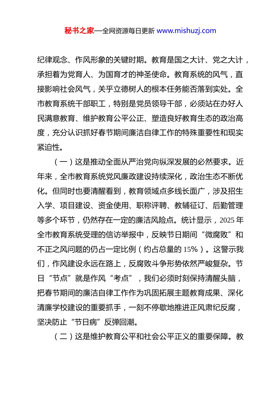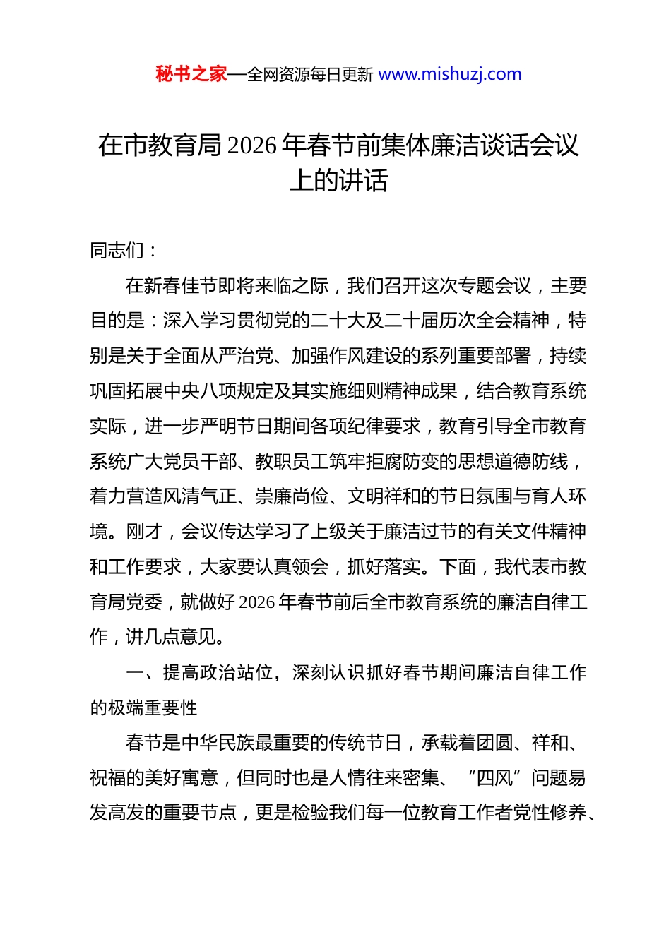 秘书之家—全网资源每日更新 www.mishuzj.com在市教育局 2026 年春节前集体廉洁谈话会议上的讲话 同志们:在新春佳节即将来临之际,我们召开这次专题会议,主要目的是:深入学习贯彻党的二十大及二十届历次全会精神,特别是关于全面从严治党、加强作风建设的系列重要部署,持续巩固拓展中央八项规定及其实施细则精神成果,结合教育系统实际,进一步严明节日期间各项纪律要求,教育引导全市教育系统广大党员干部、教职员工筑牢拒腐防变的思想道德防线,着力营造风清气正、崇廉尚俭、文明祥和的节日氛围与育人环境。刚才,会议传达学习了上级关于廉洁过节的有关文件精神和工作要求,大家要认真领会,抓好落实。下面,我代表市教育局党委,就做好 2026 年春节前后全市教育系统的廉洁自律工作,讲几点意见。一、提高政治站位,深刻认识抓好春节期间廉洁自律工作的极端重要性春节是中华民族最重要的传统节日,承载着团圆、祥和、祝福的美好寓意,但同时也是人情往来密集、“四风”问题易发高发的重要节点,更是检验我们每一位教育工作者党性修养、秘书之家—全网资源每日更新 www.mishuzj.com纪律观念、作风形象的关键时期。教育是国之大计、党之大计,承担着为党育人、为国育才的神圣使命。教育系统的风气,直接影响社会风气,关乎立德树人的根本任务能否落到实处。全市教育系统干部职工,特别是党员领导干部,必须站在办好人民满意教育、维护教育公平公正、塑造良好教育生态的政治高度,充分认识抓好春节期间廉洁自律工作的特殊重要性和现实紧迫性。(一)这是推动全面从严治党向纵深发展的必然要求。近年来,全市教育系统党风廉政建设持续深化,政治生态不断优化。但同时也要清醒看到,教育领域点多线长面广,涉及招生入学、项目建设、资金使用、职称评聘、教辅征订、后勤管理等多个环节,仍然存在一定的廉洁风险点。统计显示,2025 年全市教育系统受理的信访举报中,反映节日期间“微腐败”和不正之风问题的仍占一定比例(约占总量的 15%)。这警示我们,作风建设永远在路上,反腐败斗争形势依然严峻复杂。节日“节点”就是作风“考点”,我们必须时刻保持清醒头脑,把春节期间的廉洁自律工作作为巩固拓展主题教育成果、深化清廉学校建设的重要抓手,一刻不停歇地推进正风肃纪反腐,坚决防止“节日病”反弹回潮。(二)这是维护教育公平和社会公平正义的重要保障。教秘书之家—全网资源每日更新 www.mishuzj.com育公平是社会公平的基石。人民群众对教育的期盼,最核心的就是公平优质。任何可能影响教育公平的“人情风”“送礼风”“宴请风”,都是对教育公信力的损害,是对人民群众切身利益的侵害。我们必须深刻认识到,廉洁过节不仅是个人修养问题,更是关系教育形象、社会风气的政治问题。要坚守教育初心,把廉洁要求内化于心、外化于行,确保教育这块净土不受污染,努力让每一个孩子都能享有公平而有质量的教育,不断增强人民群众的教育获得感和满意度。(三)这是加强师德师风建设、塑造新时代教师队伍形象的迫切需要。教师是立教之本、兴教之源。高尚的师德是教育工作者最核心的职业素养。节日期间,社会上一些不良风气可能会以各种形式侵蚀校园、影响教师。开展节前廉洁谈话,就是一次集中的党性教育和师德提醒,是组织对干部教师的关心爱护。全体教育工作者要自觉把廉洁从教作为职业操守的底线,不仅要传道授业解惑,更要以身作则、为人师表,在遵守廉洁纪律上走在前、作表率,以清廉务实的作风展现新时代人民教师的良好风貌,赢得学生、家长和社会的广泛尊重。二、聚焦关键环节,精准把握春节期间廉洁自律的纪律要求“廉不廉,看过年;洁不洁,看过节”。全市教育系统广大秘书之家—全网资源每日更新 www.mishuzj.com干部职工要时刻绷紧纪律规矩这根弦,自觉对照党章党规党纪和各项廉洁规定,明确行为边界,做到令行禁止。这里,结合教育系统实际,再次强调和重申“十个严禁”:(一)严禁违规收送礼品礼金。不得收受管理服务对象(包括学生及家长、合作单位、下属等)的礼品、礼金、消费卡、电子红包、有价证券、名贵特产等财物,特别是与招生、入学、分班、评...