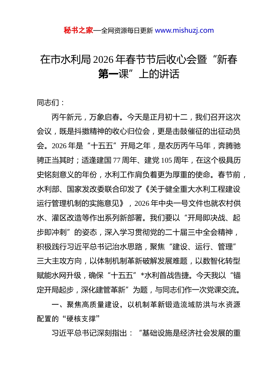 秘书之家—全网资源每日更新 www.mishuzj.com在市水利局 2026 年春节节后收心会暨“新春第一课”上的讲话 同志们:丙午新元,万象启春。今天是正月初十二,我们召开这次会议,既是抖擞精神的收心归位会,更是击鼓催征的出征动员会。2026 年是“十五五”开局之年,是农历丙午马年,奔腾驰骋正当其时;适逢建国 77 周年、建党 105 周年,在这个极具历史铭刻意义的年份,水利工作肩负着更为厚重的使命。春节前,水利部、国家发改委联合印发了《关于健全重大水利工程建设运行管理机制的实施意见》,2026 年中央一号文件也就农村供水、灌区改造等作出系列新部署。我们要以“开局即决战、起步即冲刺”的姿态,深入学习贯彻党的二十届三中全会精神,积极践行习近平总书记治水思路,聚焦“建设、运行、管理”三大主攻方向,以体制机制革新破解发展难题,以数智化转型赋能水网升级,确保“十五五”*水利首战告捷。今天我以“锚定开局起步,深化建管革新”为题,与同志们作一次党课交流。一、聚焦高质量建设,以机制革新锻造流域防洪与水资源配置的“硬核支撑”习近平总书记深刻指出:“基础设施是经济社会发展的重秘书之家—全网资源每日更新 www.mishuzj.com要支撑,要统筹发展和安全,优化基础设施布局、结构、功能和发展模式,构建现代化基础设施体系。”这一重要论述为重大水利工程建设提供了根本遵循。正因如此,我们市水利局必须深刻认识到,重大水利工程不是一般的基建项目,而是保障防洪安全、供水安全、粮食安全、生态安全的战略重器。当前,我市水利建设正处于“十五五”规划项目集中落地的窗口期,但也面临前期工作深度不足、投融资渠道单一、建设市场行为不规范等深层次矛盾。所以,我们要以水利部、国家发改委《实施意见》为行动纲领,紧紧扭住“高质量建设”这个牛鼻子,从投资模式、推进机制、监管体系三个维度协同发力,彻底扭转“重立项轻前期、重进度轻质效”的倾向,真正把每一项水利工程都打造成经得起历史检验、人民评判的百年精品。(一)革新投融资与建管模式,构建多元共担、运建协同的投资建设新格局。坚持政府引导与市场参与双轮驱动,是破解我市水利建设资金瓶颈的必由之路。我们必须在保持政府投入主导地位的同时,以更大力度开放竞争性环节,以制度创新激发社会资本活力。一是纵深推进投建运营一体化改革。针对我市*河流域综合治理、*水库扩容等投资规模大、综合效益明显的骨干工程,改变传统“建管分离”碎片化管理模式。依托市水投集团及具备秘书之家—全网资源每日更新 www.mishuzj.com专业优势的区县级供水公司,整合设计、施工、运营核心资源,组建权责对等的投建运营一体化项目法人。推动项目法人由单纯的建设组织者向全生命周期价值管理者转变,在可研阶段即同步测算运行成本、水价承受能力及附属产业开发收益,实现“以丰补歉、以副养主”。2026 年,全市新开工重大水利工程一体化模式占比力争突破 60%。同时,对公益性较强、直接经济效益不明显的河道治理、蓄滞洪区建设工程,全面推行“代建制+全过程咨询”,通过市场竞争选取专业化管理团队,降低行政协调成本,确保工程质量与投资控制“双优”。二是系统构建水价前置协商与水权交易预联动机制。严格遵循“确有需要、生态安全、可以持续”原则,坚决杜绝“形象工程”“超标准工程”。对所有新建骨干水源及城乡供水一体化工程,在项目建议书阶段即启动水价形成机制协商程序。由市发改委价格处、市水利局财务审计科指导项目法人,与用水主体单位或受水区代表签订框架性供水协议,明确初始水价区间、调价规则及政府补贴责任,将“未来收益可预期”作为吸引社会资本的核心卖点。同步探索将用水权指标预配置纳入前期工作要件,对通过节水改造置换出的用水权,允许投资方按比例获得优先交易资格,以此提升项目财务内部收益率。三是全面强化前期工作质量终身负责与穿透式追责。针对当前部分项目勘察秘书之家—全网资源每日更新 www.mishuzj.com不明、设计不准、频繁变更等顽疾,严格落实项目法人首要责任和勘察设计单位主体责任。建立全市水利勘察设计单位信用档案与“红黑榜”,对前期工作...