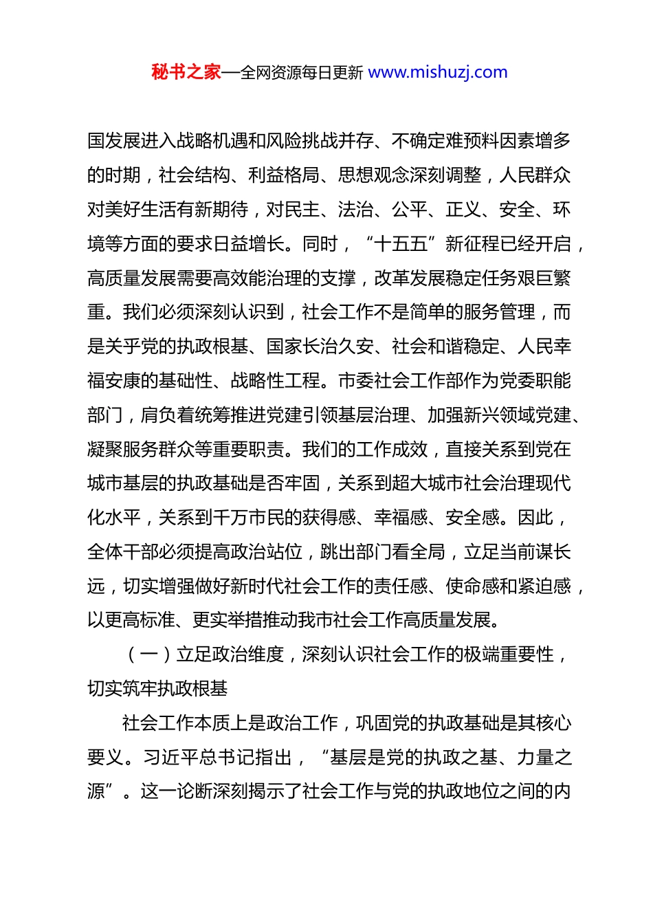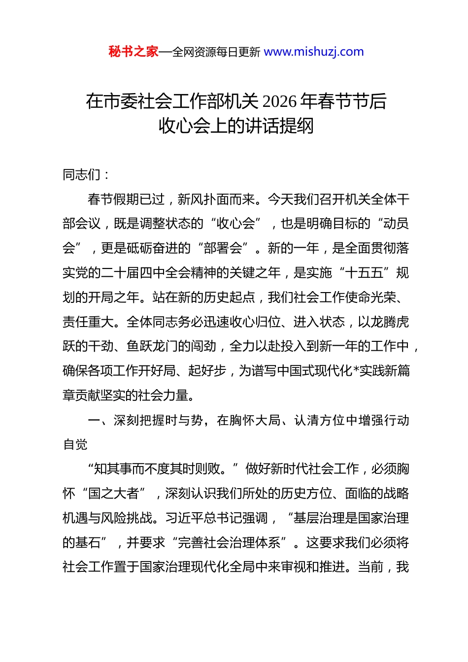 秘书之家—全网资源每日更新 www.mishuzj.com在市委社会工作部机关 2026 年春节节后收心会上的讲话提纲 同志们:春节假期已过,新风扑面而来。今天我们召开机关全体干部会议,既是调整状态的“收心会”,也是明确目标的“动员会”,更是砥砺奋进的“部署会”。新的一年,是全面贯彻落实党的二十届四中全会精神的关键之年,是实施“十五五”规划的开局之年。站在新的历史起点,我们社会工作使命光荣、责任重大。全体同志务必迅速收心归位、进入状态,以龙腾虎跃的干劲、鱼跃龙门的闯劲,全力以赴投入到新一年的工作中,确保各项工作开好局、起好步,为谱写中国式现代化*实践新篇章贡献坚实的社会力量。一、深刻把握时与势,在胸怀大局、认清方位中增强行动自觉“知其事而不度其时则败。”做好新时代社会工作,必须胸怀“国之大者”,深刻认识我们所处的历史方位、面临的战略机遇与风险挑战。习近平总书记强调,“基层治理是国家治理的基石”,并要求“完善社会治理体系”。这要求我们必须将社会工作置于国家治理现代化全局中来审视和推进。当前,我秘书之家—全网资源每日更新 www.mishuzj.com国发展进入战略机遇和风险挑战并存、不确定难预料因素增多的时期,社会结构、利益格局、思想观念深刻调整,人民群众对美好生活有新期待,对民主、法治、公平、正义、安全、环境等方面的要求日益增长。同时,“十五五”新征程已经开启,高质量发展需要高效能治理的支撑,改革发展稳定任务艰巨繁重。我们必须深刻认识到,社会工作不是简单的服务管理,而是关乎党的执政根基、国家长治久安、社会和谐稳定、人民幸福安康的基础性、战略性工程。市委社会工作部作为党委职能部门,肩负着统筹推进党建引领基层治理、加强新兴领域党建、凝聚服务群众等重要职责。我们的工作成效,直接关系到党在城市基层的执政基础是否牢固,关系到超大城市社会治理现代化水平,关系到千万市民的获得感、幸福感、安全感。因此,全体干部必须提高政治站位,跳出部门看全局,立足当前谋长远,切实增强做好新时代社会工作的责任感、使命感和紧迫感,以更高标准、更实举措推动我市社会工作高质量发展。(一)立足政治维度,深刻认识社会工作的极端重要性,切实筑牢执政根基社会工作本质上是政治工作,巩固党的执政基础是其核心要义。习近平总书记指出,“基层是党的执政之基、力量之源”。这一论断深刻揭示了社会工作与党的执政地位之间的内秘书之家—全网资源每日更新 www.mishuzj.com在联系。我们推进的每一项工作,无论是扩大党的组织覆盖,还是服务凝聚群众,根本目的都是为了把广大人民群众紧紧团结在党的周围,不断巩固党长期执政的阶级基础、群众基础、社会基础。当前,社会思想意识多元多样多变,经济社会转型带来的矛盾风险交织叠加,新兴领域蓬勃发展但党建和治理相对滞后。这些都对巩固党的执政基础提出了新的课题。我们必须从政治上看待社会工作,将坚持和加强党的全面领导贯穿于社会工作的全过程、各方面。要充分发挥党的政治优势和组织优势,把基层各类组织、各类群体有效联结起来,把党的路线方针政策不折不扣地落实到基层。要着力解决基层党组织弱化、虚化、边缘化问题,持续增强政治功能和组织功能,使其真正成为宣传党的主张、贯彻党的决定、领导基层治理、团结动员群众、推动改革发展的坚强战斗堡垒。要通过扎实有效的社会工作,把党的温暖传递到千家万户,把群众诉求解决在基层一线,不断增强党在社会领域的号召力、凝聚力、影响力,确保红色江山永不变色。(二)把握时代维度,精准研判社会发展的深刻变革,主动适应治理要求社会工作是一门科学,必须因时而进、因势而新。习近平总书记要求我们“深化对社会运行规律和治理规律的认识”。秘书之家—全网资源每日更新 www.mishuzj.com进入“十五五”时期,我国社会正在经历广泛而深刻的变革,这些变革对社会工作提出了全新的时代课题。从社会结构看,人口流动性加剧,家庭小型化、居住离散化特征明显,传统的以单位、街居为基础的社会管理和服务模式面临挑战。从社会形态看,新经济组织、新社会组织、新就业群体大量涌现,成为经济社会发展的...