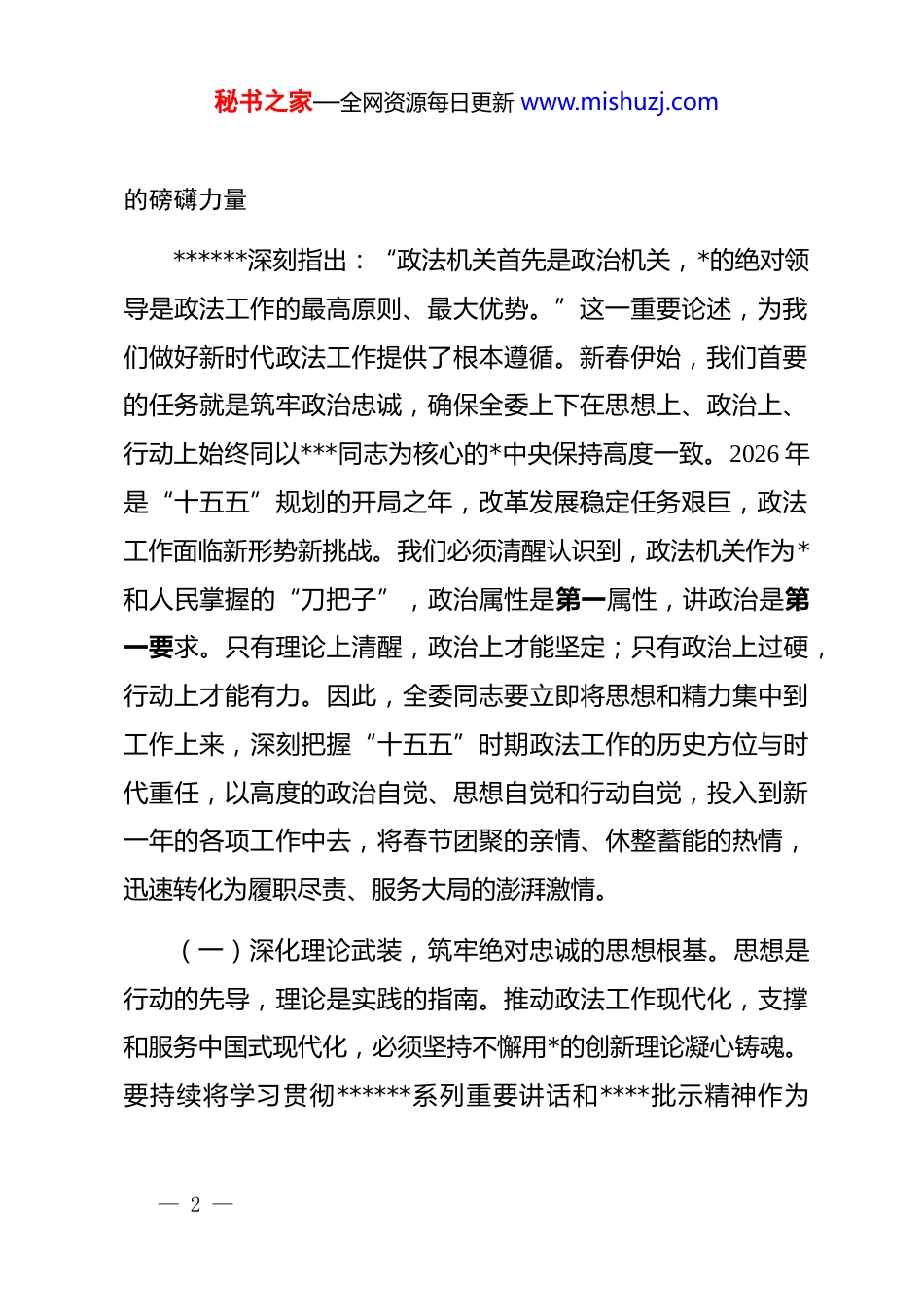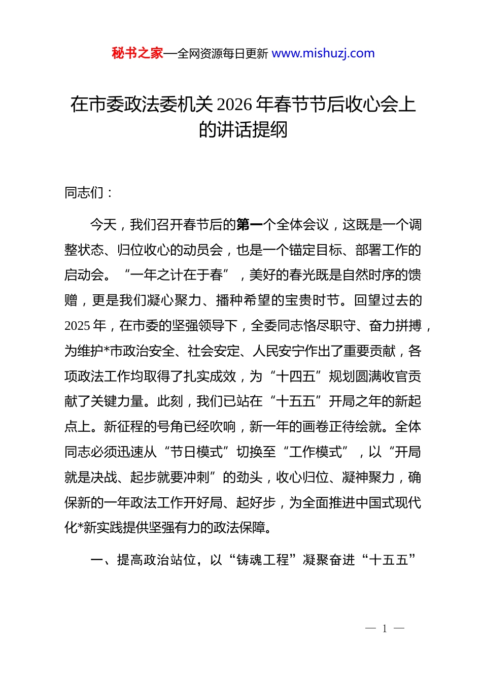 秘书之家—全网资源每日更新 www.mishuzj.com在市委政法委机关 2026 年春节节后收心会上的讲话提纲同志们:今天,我们召开春节后的第一个全体会议,这既是一个调整状态、归位收心的动员会,也是一个锚定目标、部署工作的启动会。“一年之计在于春”,美好的春光既是自然时序的馈赠,更是我们凝心聚力、播种希望的宝贵时节。回望过去的2025 年,在市委的坚强领导下,全委同志恪尽职守、奋力拼搏,为维护*市政治安全、社会安定、人民安宁作出了重要贡献,各项政法工作均取得了扎实成效,为“十四五”规划圆满收官贡献了关键力量。此刻,我们已站在“十五五”开局之年的新起点上。新征程的号角已经吹响,新一年的画卷正待绘就。全体同志必须迅速从“节日模式”切换至“工作模式”,以“开局就是决战、起步就要冲刺”的劲头,收心归位、凝神聚力,确保新的一年政法工作开好局、起好步,为全面推进中国式现代化*新实践提供坚强有力的政法保障。一、提高政治站位,以“铸魂工程”凝聚奋进“十五五”— 1 —秘书之家—全网资源每日更新 www.mishuzj.com的磅礴力量******深刻指出:“政法机关首先是政治机关,*的绝对领导是政法工作的最高原则、最大优势。”这一重要论述,为我们做好新时代政法工作提供了根本遵循。新春伊始,我们首要的任务就是筑牢政治忠诚,确保全委上下在思想上、政治上、行动上始终同以***同志为核心的*中央保持高度一致。2026 年是“十五五”规划的开局之年,改革发展稳定任务艰巨,政法工作面临新形势新挑战。我们必须清醒认识到,政法机关作为*和人民掌握的“刀把子”,政治属性是第一属性,讲政治是第一要求。只有理论上清醒,政治上才能坚定;只有政治上过硬,行动上才能有力。因此,全委同志要立即将思想和精力集中到工作上来,深刻把握“十五五”时期政法工作的历史方位与时代重任,以高度的政治自觉、思想自觉和行动自觉,投入到新一年的各项工作中去,将春节团聚的亲情、休整蓄能的热情,迅速转化为履职尽责、服务大局的澎湃激情。(一)深化理论武装,筑牢绝对忠诚的思想根基。思想是行动的先导,理论是实践的指南。推动政法工作现代化,支撑和服务中国式现代化,必须坚持不懈用*的创新理论凝心铸魂。要持续将学习贯彻******系列重要讲话和****批示精神作为— 2 —秘书之家—全网资源每日更新 www.mishuzj.com“第一议题”,建立健全并严格执行理论学习中心组学习、专题研讨、政治轮训等制度。学习的目的在于运用,必须大力弘扬理论联系实际的优良学风,引导全委干部紧密联系“十五五”时期*市经济社会发展大局,紧密联系政法领域面临的风险挑战,紧密联系自身思想和工作实际,深入思考新时代新征程政法工作“怎么看、怎么办、怎么干”的重大课题。要通过系统深入的学习,不断增进对*的创新理论的政治认同、思想认同、理论认同、情感认同,深刻领悟“两个确立”的决定性意义,坚决做到“两个维护”。要教育引导全体干部善于从政治上观察、分析和处理问题,不断提高政治判断力、政治领悟力、政治执行力,确保在纷繁复杂的形势面前始终保持清醒头脑,在大是大非问题上始终做到立场坚定、旗帜鲜明。要将学习成果切实转化为谋划工作的思路、破解难题的办法、推动发展的举措,确保*中央、省委及市委的各项决策部署在市委政法委机关不折不扣落地生根,确保政法工作始终沿着正确政治方向前进。(二)严守政治纪律,锻造绝对纯洁的模范机关。纪律严明是*的光荣传统和独特优势,更是政法机关履行好职责使命的内在要求和根本保证。政法机关的特殊性质决定了必须在纪律作风建设上有更高标准、更严要求。春节假期已过,全委上下— 3 —秘书之家—全网资源每日更新 www.mishuzj.com要立即严肃工作纪律,严格规范工作秩序,坚决克服可能存在的“节后综合征”,杜绝任何形式的“懒、涣、散”现象。要严格执行考勤、请销假、请示报告等各项机关管理制度,确保人员在岗、心思在岗、状态在岗。要进一步强化*章*规 dj 教育,引导*员干部知敬畏、存戒惧、守底线,自觉用纪律这把尺子衡量自身言行。要严格落实全面从严治*主体责任,将严的要求贯穿到机关管理和队...