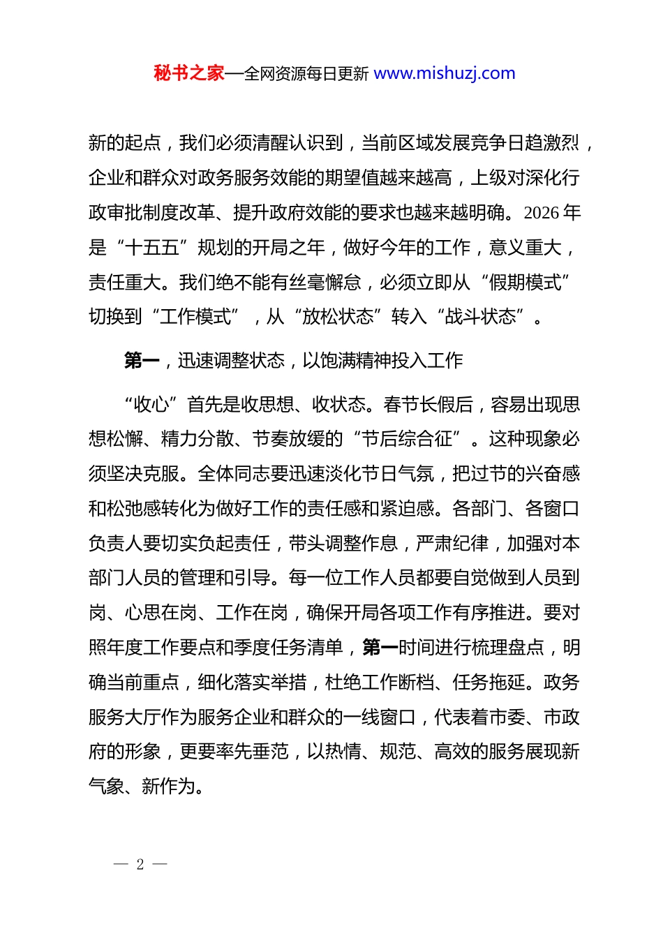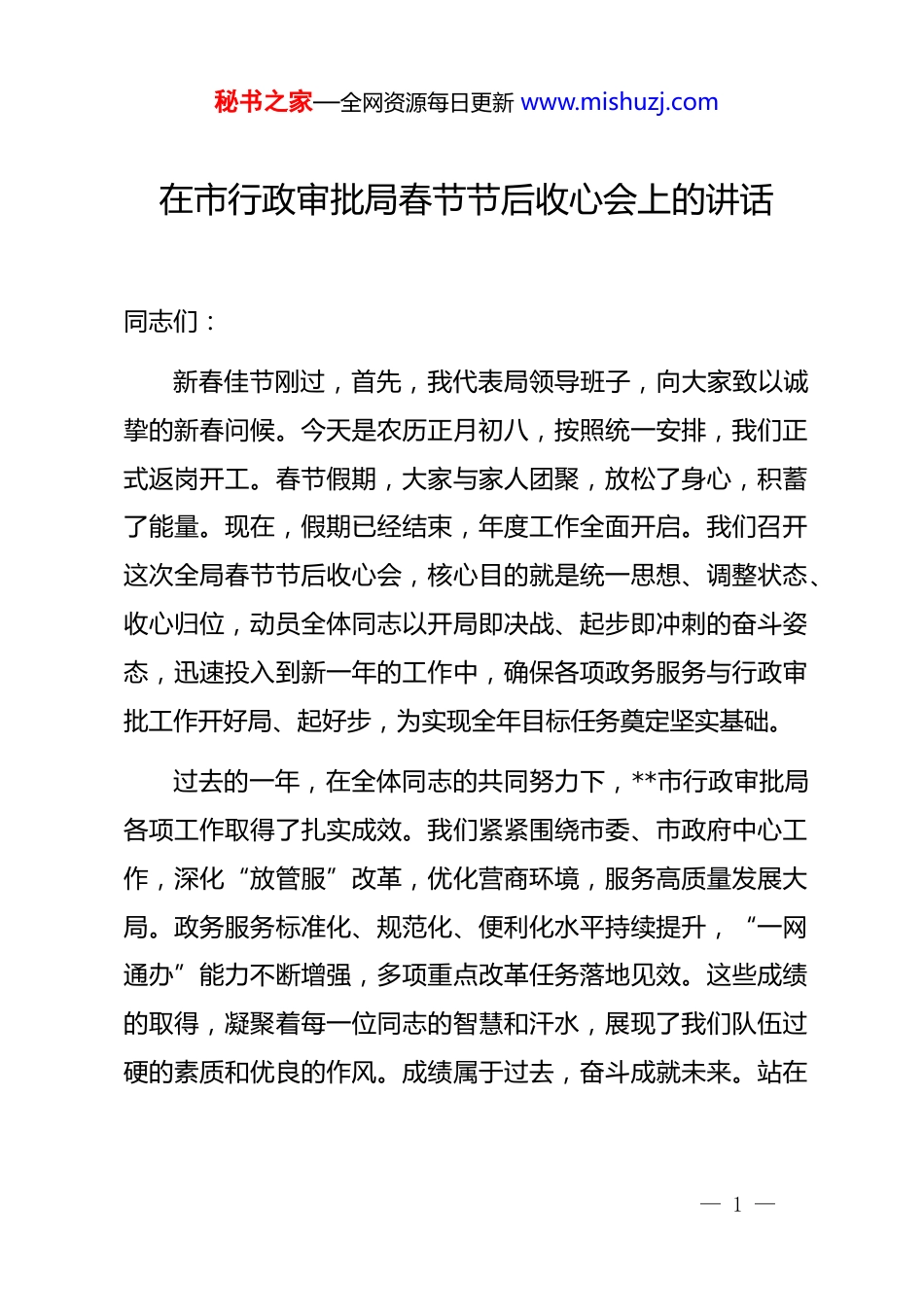 秘书之家—全网资源每日更新 www.mishuzj.com在市行政审批局春节节后收心会上的讲话同志们:新春佳节刚过,首先,我代表局领导班子,向大家致以诚挚的新春问候。今天是农历正月初八,按照统一安排,我们正式返岗开工。春节假期,大家与家人团聚,放松了身心,积蓄了能量。现在,假期已经结束,年度工作全面开启。我们召开这次全局春节节后收心会,核心目的就是统一思想、调整状态、收心归位,动员全体同志以开局即决战、起步即冲刺的奋斗姿态,迅速投入到新一年的工作中,确保各项政务服务与行政审批工作开好局、起好步,为实现全年目标任务奠定坚实基础。过去的一年,在全体同志的共同努力下,**市行政审批局各项工作取得了扎实成效。我们紧紧围绕市委、市政府中心工作,深化“放管服”改革,优化营商环境,服务高质量发展大局。政务服务标准化、规范化、便利化水平持续提升,“一网通办”能力不断增强,多项重点改革任务落地见效。这些成绩的取得,凝聚着每一位同志的智慧和汗水,展现了我们队伍过硬的素质和优良的作风。成绩属于过去,奋斗成就未来。站在— 1 —秘书之家—全网资源每日更新 www.mishuzj.com新的起点,我们必须清醒认识到,当前区域发展竞争日趋激烈,企业和群众对政务服务效能的期望值越来越高,上级对深化行政审批制度改革、提升政府效能的要求也越来越明确。2026 年是“十五五”规划的开局之年,做好今年的工作,意义重大,责任重大。我们绝不能有丝毫懈怠,必须立即从“假期模式”切换到“工作模式”,从“放松状态”转入“战斗状态”。第一,迅速调整状态,以饱满精神投入工作“收心”首先是收思想、收状态。春节长假后,容易出现思想松懈、精力分散、节奏放缓的“节后综合征”。这种现象必须坚决克服。全体同志要迅速淡化节日气氛,把过节的兴奋感和松弛感转化为做好工作的责任感和紧迫感。各部门、各窗口负责人要切实负起责任,带头调整作息,严肃纪律,加强对本部门人员的管理和引导。每一位工作人员都要自觉做到人员到岗、心思在岗、工作在岗,确保开局各项工作有序推进。要对照年度工作要点和季度任务清单,第一时间进行梳理盘点,明确当前重点,细化落实举措,杜绝工作断档、任务拖延。政务服务大厅作为服务企业和群众的一线窗口,代表着市委、市政府的形象,更要率先垂范,以热情、规范、高效的服务展现新气象、新作为。— 2 —秘书之家—全网资源每日更新 www.mishuzj.com第二,聚焦年度目标,以清晰思路谋划工作方向明则思路清。2026 年,我局工作的总抓手就是全面深化“高效办成一件事”改革,这是国务院部署的重点任务,也是优化营商环境、提升群众满意度的关键路径。近期,国务院办公厅已印发《“高效办成一件事”2026 年度第一批重点事项清单》省市也即将出台配套实施方案。这为我们全年工作指明了主攻方向。全局上下必须将思想和行动统一到这项核心改革任务上来。我们要紧密结合**市实际,提前研究、主动对接,尽快制定我局贯彻落实的本地化实施方案。这项改革不是简单的业务叠加,而是深刻的流程再造和系统重构。要聚焦企业从开办到注销、个人从出生到身后的全生命周期,围绕重点领域和高频事项,打破部门壁垒和数据孤岛,推动关联事项集成办、容缺事项承诺办、异地事项跨域办、政策服务免申办。要积极探索人工智能技术与政务服务的深度融合在智能审批、智能导办、智能预审等方面寻求突破,以技术赋能提升服务效率和体验。各业务科室要对照改革要求,全面梳理现有审批流程和服务事项,该整合的整合,该简化的简化,该优化的优化,形成清晰的任务书、时间表和责任链。— 3 —秘书之家—全网资源每日更新 www.mishuzj.com第三,严明纪律作风,以优良形象保障工作纪律是执行路线的保证,作风是干事创业的基础。政务服务窗口是*风政风的重要体现,纪律作风建设须臾不可放松。春节过后,尤其要拧紧纪律螺丝,上紧作风发条。一要严守工作纪律。必须严格执行作息时间,坚决杜绝迟到、早退、无故旷工以及工作时间从事与工作无关活动的现象。考勤管理要严格,监督检查要到位,对违纪行为要严肃处理。二要严守服务规范。始终坚持“以人民...