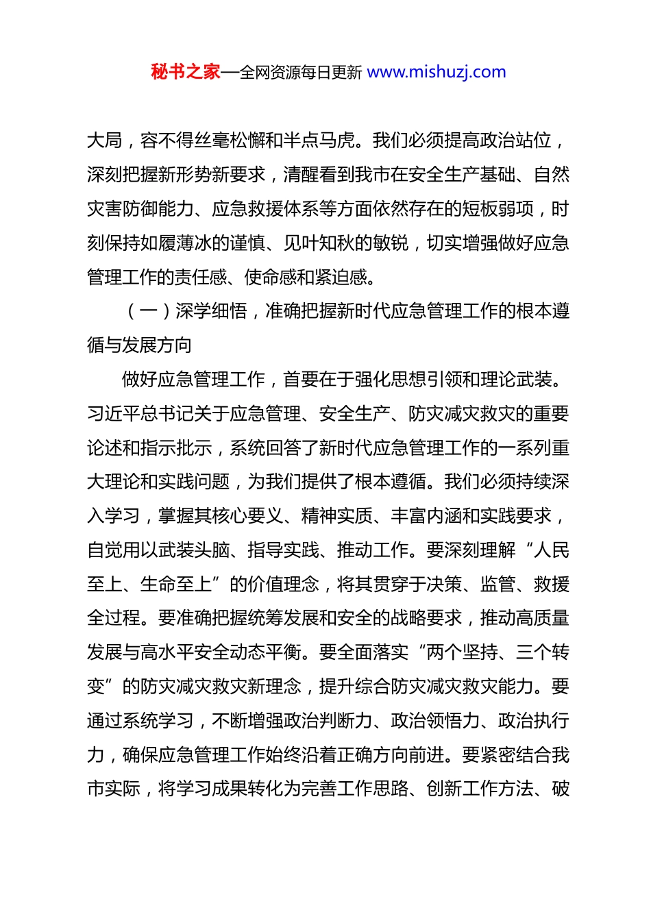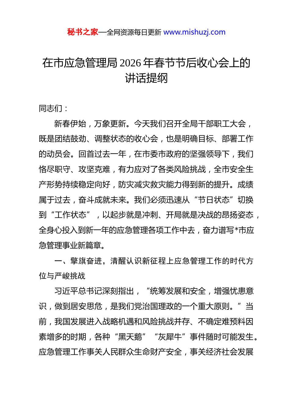 秘书之家—全网资源每日更新 www.mishuzj.com在市应急管理局 2026 年春节节后收心会上的讲话提纲 同志们:新春伊始,万象更新。今天我们召开全局干部职工大会,既是团结鼓劲、调整状态的收心会,也是明确目标、部署工作的动员会。回首过去一年,在市委市政府的坚强领导下,我们恪尽职守、攻坚克难,有力应对了各类风险挑战,全市安全生产形势持续稳定向好,防灾减灾救灾能力得到新的提升。成绩属于过去,奋斗成就未来。我们必须迅速从“节日状态”切换到“工作状态”,以起步就是冲刺、开局就是决战的昂扬姿态,全身心投入到新一年的应急管理各项工作中去,奋力谱写*市应急管理事业新篇章。一、擎旗奋进,清醒认识新征程上应急管理工作的时代方位与严峻挑战习近平总书记深刻指出,“统筹发展和安全,增强忧患意识,做到居安思危,是我们党治国理政的一个重大原则。”当前,我国发展进入战略机遇和风险挑战并存、不确定难预料因素增多的时期,各种“黑天鹅”“灰犀牛”事件随时可能发生。应急管理工作事关人民群众生命财产安全,事关经济社会发展秘书之家—全网资源每日更新 www.mishuzj.com大局,容不得丝毫松懈和半点马虎。我们必须提高政治站位,深刻把握新形势新要求,清醒看到我市在安全生产基础、自然灾害防御能力、应急救援体系等方面依然存在的短板弱项,时刻保持如履薄冰的谨慎、见叶知秋的敏锐,切实增强做好应急管理工作的责任感、使命感和紧迫感。(一)深学细悟,准确把握新时代应急管理工作的根本遵循与发展方向做好应急管理工作,首要在于强化思想引领和理论武装。习近平总书记关于应急管理、安全生产、防灾减灾救灾的重要论述和指示批示,系统回答了新时代应急管理工作的一系列重大理论和实践问题,为我们提供了根本遵循。我们必须持续深入学习,掌握其核心要义、精神实质、丰富内涵和实践要求,自觉用以武装头脑、指导实践、推动工作。要深刻理解“人民至上、生命至上”的价值理念,将其贯穿于决策、监管、救援全过程。要准确把握统筹发展和安全的战略要求,推动高质量发展与高水平安全动态平衡。要全面落实“两个坚持、三个转变”的防灾减灾救灾新理念,提升综合防灾减灾救灾能力。要通过系统学习,不断增强政治判断力、政治领悟力、政治执行力,确保应急管理工作始终沿着正确方向前进。要紧密结合我市实际,将学习成果转化为完善工作思路、创新工作方法、破秘书之家—全网资源每日更新 www.mishuzj.com解工作难题的具体举措,着力解决影响和制约我市应急管理事业长远发展的深层次矛盾和问题。要加强对新发展阶段应急管理规律的研究,前瞻性思考、全局性谋划、整体性推进各项工作,不断提升工作的科学性、预见性和主动性,牢牢把握工作主动权。(二)审时度势,科学研判当前我市应急管理工作面临的风险挑战与薄弱环节“安而不忘危,存而不忘亡,治而不忘乱。”这是我们必须始终坚守的清醒认识。当前,我市经济社会发展仍处于重要战略机遇期,但各类风险隐患交织叠加。安全生产方面,部分行业领域企业主体责任落实不到位,本质安全水平有待提升,传统高风险和新兴业态风险并存,安全生产基础仍需夯实。自然灾害方面,受全球气候变化影响,极端天气事件呈多发频发态势,洪涝、干旱、地质灾害等风险突出,城市防灾减灾基础设施存在短板。应急救援方面,大应急框架下的力量整合、资源统筹、机制磨合仍需加强,基层应急能力相对薄弱,应急装备和科技信息化支撑水平有待提高。此外,社会公众风险意识和自救互救能力有待进一步提升。我们必须坚持问题导向,全面梳理排查风险隐患,建立动态风险清单,做到底数清、情况明。要深入分析风险产生、演变、传导的规律,找准症结所在,实秘书之家—全网资源每日更新 www.mishuzj.com施精准治理。要树立底线思维和极限思维,做好应对最复杂最困难局面的充分准备,下好先手棋,打好主动仗。(三)勇担使命,深刻理解肩负维护安全稳定社会环境的重大政治责任与历史使命应急管理部门承担着防范化解重大安全风险、及时应对处置各类灾害事故的重要职责,肩负着保护人民群众生命财产安全和维护社会稳定的光荣使命。这既是党和人...