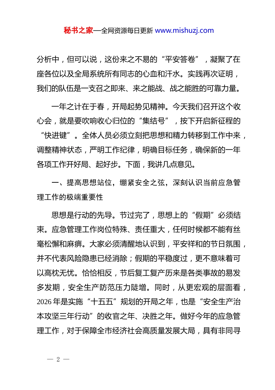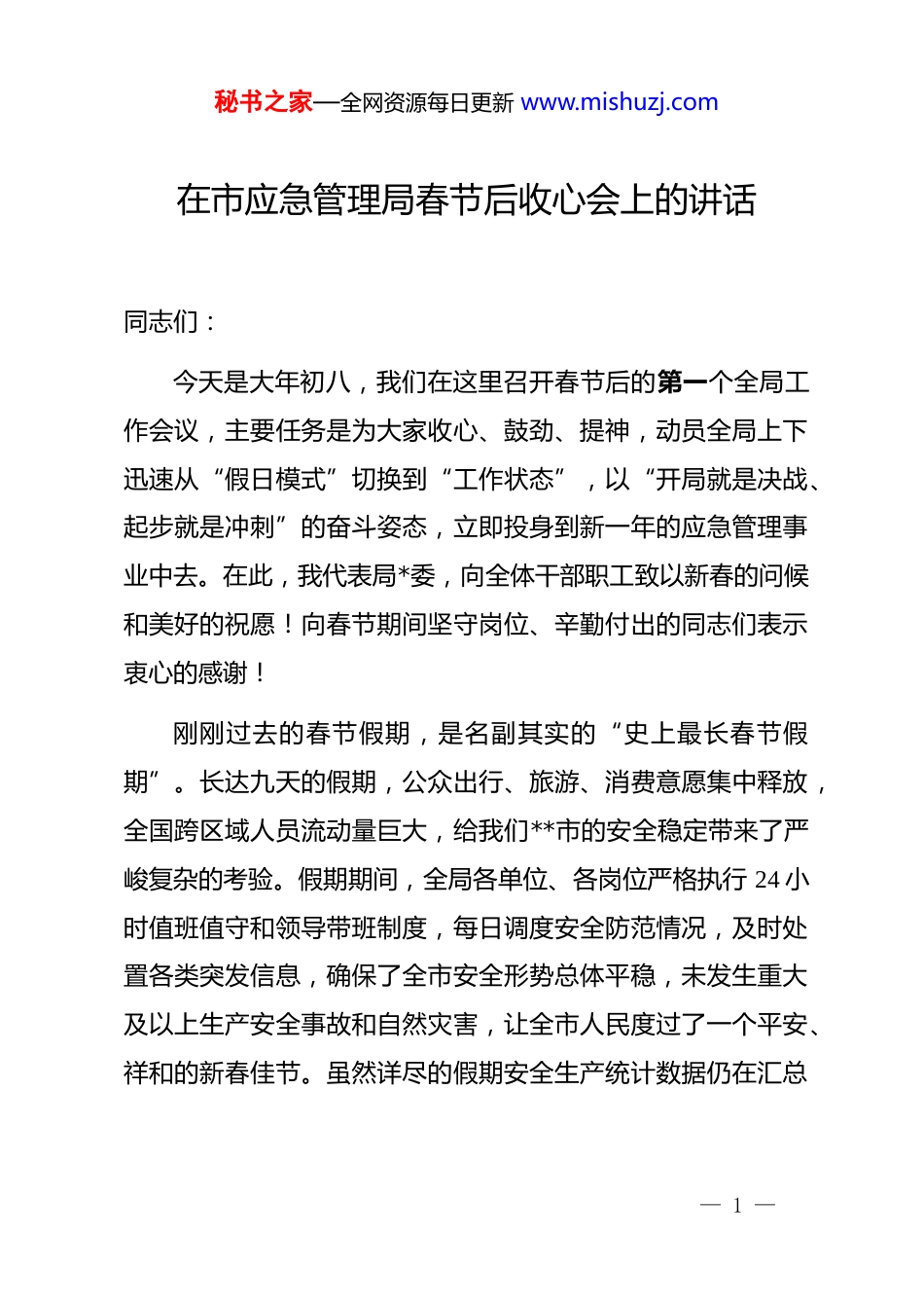 秘书之家—全网资源每日更新 www.mishuzj.com在市应急管理局春节后收心会上的讲话同志们:今天是大年初八,我们在这里召开春节后的第一个全局工作会议,主要任务是为大家收心、鼓劲、提神,动员全局上下迅速从“假日模式”切换到“工作状态”,以“开局就是决战、起步就是冲刺”的奋斗姿态,立即投身到新一年的应急管理事业中去。在此,我代表局*委,向全体干部职工致以新春的问候和美好的祝愿!向春节期间坚守岗位、辛勤付出的同志们表示衷心的感谢!刚刚过去的春节假期,是名副其实的“史上最长春节假期”。长达九天的假期,公众出行、旅游、消费意愿集中释放,全国跨区域人员流动量巨大,给我们**市的安全稳定带来了严峻复杂的考验。假期期间,全局各单位、各岗位严格执行 24 小时值班值守和领导带班制度,每日调度安全防范情况,及时处置各类突发信息,确保了全市安全形势总体平稳,未发生重大及以上生产安全事故和自然灾害,让全市人民度过了一个平安、祥和的新春佳节。虽然详尽的假期安全生产统计数据仍在汇总— 1 —秘书之家—全网资源每日更新 www.mishuzj.com分析中,但可以说,这份来之不易的“平安答卷”,凝聚了在座各位以及全局系统所有同志的心血和汗水。实践再次证明,我们的队伍是一支召之即来、来之能战、战之能胜的可靠力量。一年之计在于春,开局起势见精神。今天我们召开这个收心会,就是要吹响收心归位的“集结号”,按下开启新征程的“快进键”。全体人员必须立刻把思想和精力转移到工作中来,调整精神状态,严明工作纪律,明确目标任务,确保新的一年各项工作开好局、起好步。下面,我讲几点意见。一、提高思想站位,绷紧安全之弦,深刻认识当前应急管理工作的极端重要性思想是行动的先导。节过完了,思想上的“假期”必须结束。应急管理工作岗位特殊、责任重大,任何时候都不能有丝毫松懈和麻痹。大家必须清醒地认识到,平安祥和的节日氛围,并不代表风险隐患已经消除;假期的平稳度过,更不意味着可以高枕无忧。恰恰相反,节后复工复产历来是各类事故的易发多发期,安全生产防范压力陡增。同时,从更宏观的层面看,2026 年是实施“十五五”规划的开局之年,也是“安全生产治本攻坚三年行动”的收官之年、决胜之年。做好今年的应急管理工作,对于保障全市经济社会高质量发展大局,具有非同寻— 2 —秘书之家—全网资源每日更新 www.mishuzj.com常的意义。全局干部职工要切实把思想和行动统一到*中央、国务院关于安全生产和应急管理工作的决策部署上来,始终保持“时时放心不下”的责任感和“眼睛瞪得大大的”敏锐性。要深刻认识到,抓应急、保安全,本质上是践行“人民至上、生命至上”理念最直接、最现实的体现,是一项重大的政治任务和民生工程。不能把应急管理仅仅看作是业务工作,必须站在讲政治、顾大局、保稳定的高度来审视和推动。每一名同志都要迅速把过节的“兴奋点”转移到工作的“着力点”上,把对家人的祝福和关爱,升华为守护城市平安、保障人民安康的强大动力,以高度的政治自觉、思想自觉和行动自觉,坚决扛起防范化解重大安全风险的政治责任。二、聚焦关键环节,狠抓工作落实,全力打好节后安全防范主动仗节后复工复产阶段,企业赶工期、抢进度意愿强烈,加之部分员工节后思想松懈、设备停机后重启运行不稳定等因素叠加,安全风险急剧升高。必须采取超常举措,拿出过硬办法,精准发力,牢牢守住安全生产基本盘。— 3 —秘书之家—全网资源每日更新 www.mishuzj.com第一,必须毫不松懈抓好复工复产安全监管。这是当前安全防范工作的重中之重。各监管科室和执法队伍要立即行动起来,深入一线开展节后复工复产安全生产督导检查。要紧盯矿山、危险化学品、烟花爆竹、冶金工贸等直管行业领域督促企业严格落实复工复产方案,严把复工复产验收关。要大力组织开展“开工第一课讲安全”活动督促企业主要负责人亲自授课,强化全员特别是新上岗、转岗人员的安全培训教育,确保人人懂安全、个个会应急。检查中要突出重点,对企业的安全责任体系、设备设施维护保养、隐患排查整改、应急预案和物资准备等情况进行全面“体检”。对不具备安...
