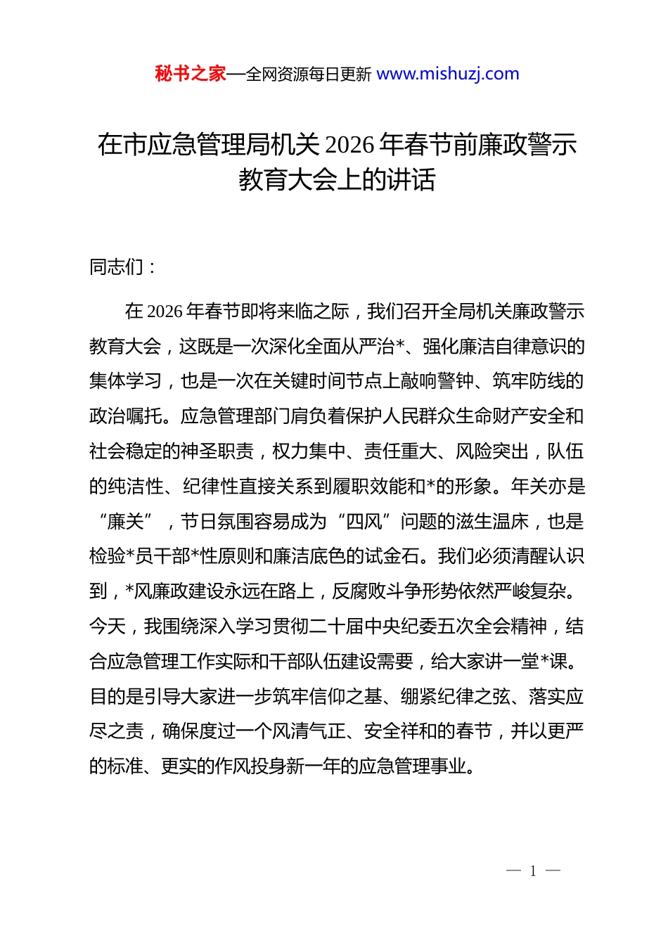 秘书之家—全网资源每日更新 www.mishuzj.com在市应急管理局机关 2026 年春节前廉政警示教育大会上的讲话同志们:在 2026 年春节即将来临之际,我们召开全局机关廉政警示教育大会,这既是一次深化全面从严治*、强化廉洁自律意识的集体学习,也是一次在关键时间节点上敲响警钟、筑牢防线的政治嘱托。应急管理部门肩负着保护人民群众生命财产安全和社会稳定的神圣职责,权力集中、责任重大、风险突出,队伍的纯洁性、纪律性直接关系到履职效能和*的形象。年关亦是“廉关”,节日氛围容易成为“四风”问题的滋生温床,也是检验*员干部*性原则和廉洁底色的试金石。我们必须清醒认识到,*风廉政建设永远在路上,反腐败斗争形势依然严峻复杂。今天,我围绕深入学习贯彻二十届中央纪委五次全会精神,结合应急管理工作实际和干部队伍建设需要,给大家讲一堂*课。目的是引导大家进一步筑牢信仰之基、绷紧纪律之弦、落实应尽之责,确保度过一个风清气正、安全祥和的春节,并以更严的标准、更实的作风投身新一年的应急管理事业。— 1 —秘书之家—全网资源每日更新 www.mishuzj.com一、以固本培元之举深化思想认识,永葆对*忠诚的政治本色******在二十届中央纪委五次全会上深刻指出,“要加强新时代廉洁文化建设,深入开展*性*风 dj 教育,传承*的光荣传统和优良作风,激发共产*员崇高理想追求,把以权谋私、贪污腐败看成极大的耻辱。”这为我们深化思想认识、筑牢拒腐防变的思想道德防线提供了根本遵循。对于应急管理战线的*员干部而言,政治上的坚定、思想上的清醒是履职尽责的首要前提和根本保证。我们必须深刻认识到,加强廉政建设不仅是纪律要求,更是确保应急管理事业始终沿着正确方向前进、有效履行*和人民赋予职责使命的内在需要。特别是在防范化解重大安全风险、应对处置各类灾害事故的关键时刻,队伍的凝聚力、战斗力、纯洁性至关重要。因此,首要任务是从思想根源上正本清源,确保理想信念不动摇、政治方向不偏离。(一)淬炼忠诚之魂,筑牢信仰根基。坚定的理想信念是共产*人的精神支柱和政治灵魂,是保持清正廉洁思想根基的源头活水。对于应急管理干部,忠诚首先体现在对*的应急管理事业的绝对忠诚上。我们要深刻理解应急管理工作的政治属性,它直接关系总体国家安全观,关系以人民为中心的发展思想的— 2 —秘书之家—全网资源每日更新 www.mishuzj.com落实。必须持续强化理论武装,深入学习领会******关于应急管理、安全生产、防灾减灾救灾的重要论述和指示批示精神,把握其核心要义、精神实质、丰富内涵、实践要求,将其转化为推动工作、指导实践、抵御风险的强大思想武器。要旗帜鲜明讲政治,不断提高政治判断力、政治领悟力、政治执行力,始终在思想上政治上行动上同*中央保持高度一致,确保应急管理各项决策部署不折不扣落到实处。要将忠诚融入血脉,体现在面对急难险重任务时的挺身而出,体现在日常监管执法中的公平公正,体现在服务群众、守护安全时的无私奉献。唯有筑牢信仰之基,才能在大是大非面前旗帜鲜明,在风浪考验面前无所畏惧,在各种诱惑面前立场坚定。(二)恪守为民之本,践行初心使命。我们*的根本宗旨是全心全意为人民服务。应急管理部门的所有工作,出发点和落脚点都是为了保护人民生命财产安全,这是我们一切工作的初心和使命。廉洁用权,本质上就是用人民赋予的权力为人民谋利益、保安全。要深刻认识到,手中的执法权、检查权、审批权、救援指挥权、物资分配权等,都是公器,姓“公”不姓“私”,必须用于履职尽责、服务人民,绝不能成为谋取私利的工具。要始终把人民放在心中最高位置,在安全生产监管中,— 3 —秘书之家—全网资源每日更新 www.mishuzj.com坚持生命至上、安全第一,铁面无私执法,坚决整治安全隐患;在防灾减灾救灾中,冲锋在前、担当作为,确保受灾群众得到及时救助;在服务企业中,既要严格标准,也要优化服务,营造法治化营商环境。要时刻警惕脱离群众的危险,坚决反对任何形式的特权思想和特权现象,保持同人民群众的血肉联系。只有时刻牢记权力来自人民、必须服务人民,才能从根本上抵制以权谋私的诱惑,做到权...