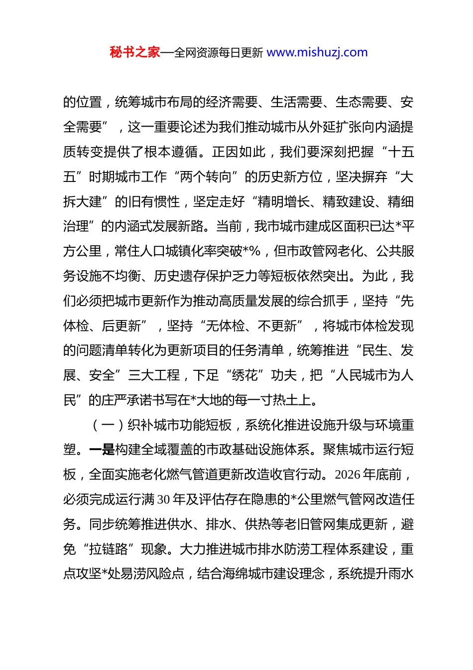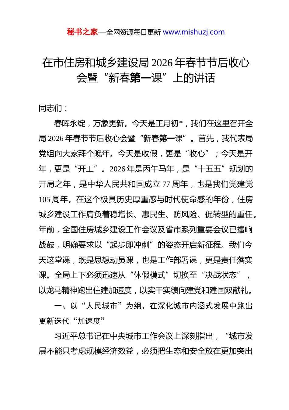 秘书之家—全网资源每日更新 www.mishuzj.com在市住房和城乡建设局 2026 年春节节后收心会暨“新春第一课”上的讲话 同志们:春晖永绽,万象更新。今天是正月初*,我们在这里召开全局 2026 年春节节后收心会暨“新春第一课”。首先,我代表局党组向大家拜个晚年。今天是收假,更是“收心”;今天是开年,更是“开工”。2026 年是丙午马年,是“十五五”规划的开局之年,是中华人民共和国成立 77 周年,也是我们党建党105 周年。在这个极具历史厚重感与时代使命感的年份,住房城乡建设工作肩负着稳增长、惠民生、防风险、促转型的重任。年前,全国住房城乡建设工作会议及省市系列重要会议已擂响战鼓,明确要求以“起步即冲刺”的姿态开启新征程。我们今天这堂课,既是思想动员课,也是工作部署课,更是责任落实课。全局上下必须迅速从“休假模式”切换至“决战状态”,以龙马精神跑出住建加速度,以实干实绩向建党和建国双献礼。一、以“人民城市”为纲,在深化城市内涵式发展中跑出更新迭代“加速度”习近平总书记在中央城市工作会议上深刻指出,“城市发展不能只考虑规模经济效益,必须把生态和安全放在更加突出秘书之家—全网资源每日更新 www.mishuzj.com的位置,统筹城市布局的经济需要、生活需要、生态需要、安全需要”,这一重要论述为我们推动城市从外延扩张向内涵提质转变提供了根本遵循。正因如此,我们要深刻把握“十五五”时期城市工作“两个转向”的历史新方位,坚决摒弃“大拆大建”的旧有惯性,坚定走好“精明增长、精致建设、精细治理”的内涵式发展新路。当前,我市城市建成区面积已达*平方公里,常住人口城镇化率突破*%,但市政管网老化、公共服务设施不均衡、历史遗存保护乏力等短板依然突出。为此,我们必须把城市更新作为推动高质量发展的综合抓手,坚持“先体检、后更新”,坚持“无体检、不更新”,将城市体检发现的问题清单转化为更新项目的任务清单,统筹推进“民生、发展、安全”三大工程,下足“绣花”功夫,把“人民城市为人民”的庄严承诺书写在*大地的每一寸热土上。(一)织补城市功能短板,系统化推进设施升级与环境重塑。一是构建全域覆盖的市政基础设施体系。聚焦城市运行短板,全面实施老化燃气管道更新改造收官行动。2026 年底前,必须完成运行满 30 年及评估存在隐患的*公里燃气管网改造任务。同步统筹推进供水、排水、供热等老旧管网集成更新,避免“拉链路”现象。大力推进城市排水防涝工程体系建设,重点攻坚*处易涝风险点,结合海绵城市建设理念,系统提升雨水秘书之家—全网资源每日更新 www.mishuzj.com管网设计标准与行泄能力。加快城市生命线安全工程全覆盖,将燃气、桥梁、供水、综合管廊等全部纳入市级智慧监测平台,实现“一网统管、秒级预警”。二是织密便捷舒适的社区服务网络。以完整社区建设为切入点,精准补建“一老一小”服务设施。在去年完成*个完整社区试点基础上,今年新增*个试点单元,重点补齐托儿所、老年服务站、社区卫生服务站等短板。持续推进老旧小区改造“楼道革命、环境革命、管理革命”,全年新开工改造城镇老旧小区*个,惠及居民*万户。统筹推进既有住宅加装电梯,优化联合审查流程,推行“成片化、规模化”加装模式,全年确保新增电梯*部。开展城市小微公共空间“针灸式”改造,利用闲置地、边角地建设口袋公园*个,新增社区绿道*公里,实现推窗见绿、出门进园。三是打造全龄友好的无障碍人居环境。系统推进城市道路、公共交通场站、公园广场等无障碍设施排查与提升,确保新建项目 100%符合无障碍设计规范。针对残疾人、老年人等特殊群体,开展“爱老助残”家庭适老化改造,全年完成*户困难家庭改造任务。推动既有多层住宅加装电梯与无障碍设施有效衔接,畅通居家养老“最后一百米”。(二)焕活历史人文风貌,在地化传承文脉根脉与时代价值。一是构建全要素历史文化保护体系。坚决纠治“拆真建假、秘书之家—全网资源每日更新 www.mishuzj.com拆旧建新”错误倾向,全面开展历史文化街区、历史建筑测绘建档专项行动。重点推进*历史文化街区保护修缮与活化利用,坚持“小规模、渐进式”微改...