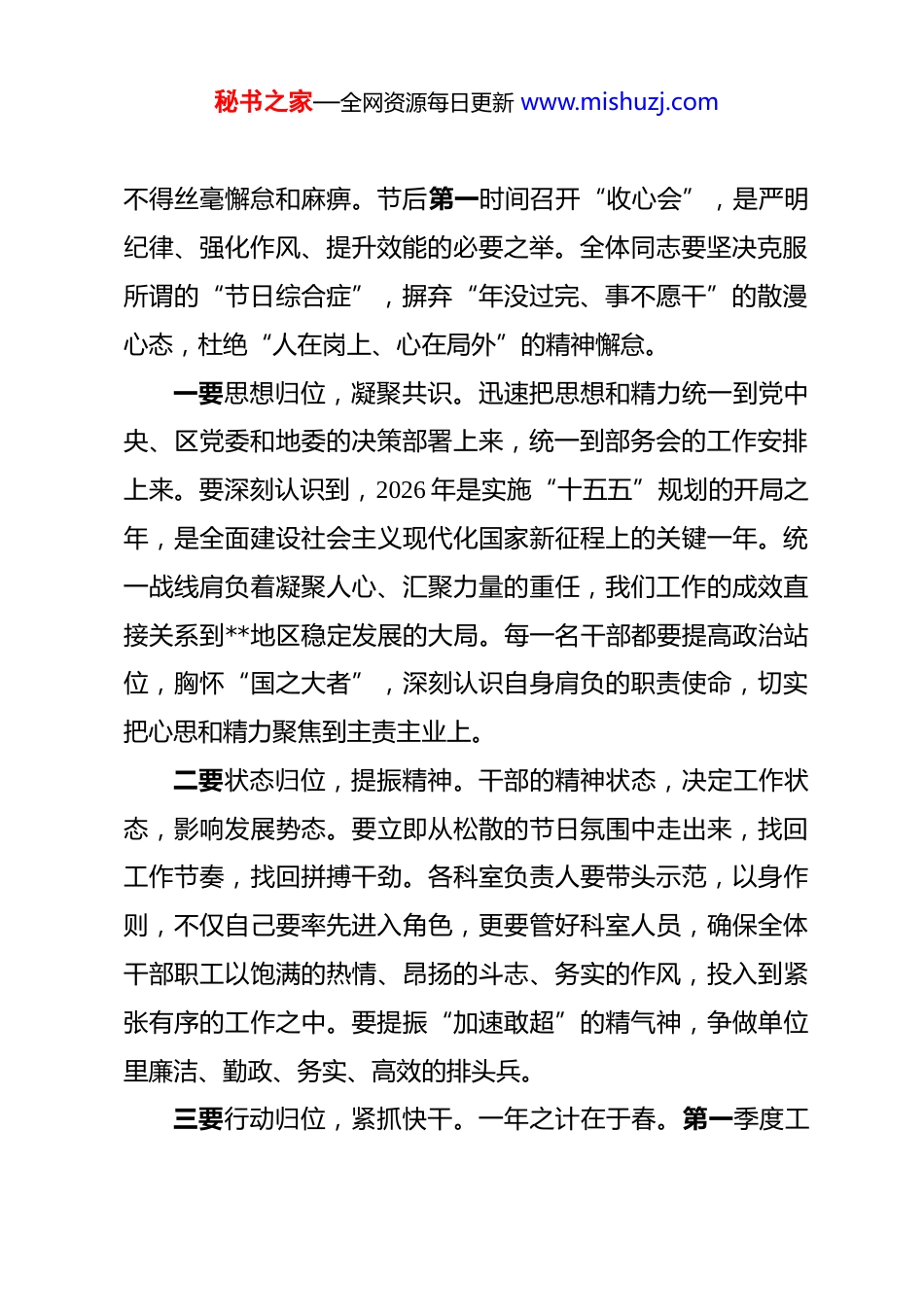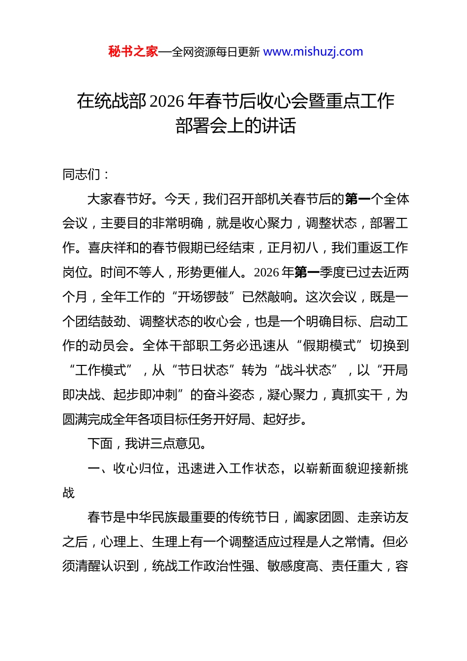秘书之家—全网资源每日更新 www.mishuzj.com在统战部 2026 年春节后收心会暨重点工作部署会上的讲话 同志们:大家春节好。今天,我们召开部机关春节后的第一个全体会议,主要目的非常明确,就是收心聚力,调整状态,部署工作。喜庆祥和的春节假期已经结束,正月初八,我们重返工作岗位。时间不等人,形势更催人。2026 年第一季度已过去近两个月,全年工作的“开场锣鼓”已然敲响。这次会议,既是一个团结鼓劲、调整状态的收心会,也是一个明确目标、启动工作的动员会。全体干部职工务必迅速从“假期模式”切换到“工作模式”,从“节日状态”转为“战斗状态”,以“开局即决战、起步即冲刺”的奋斗姿态,凝心聚力,真抓实干,为圆满完成全年各项目标任务开好局、起好步。下面,我讲三点意见。一、收心归位,迅速进入工作状态,以崭新面貌迎接新挑战春节是中华民族最重要的传统节日,阖家团圆、走亲访友之后,心理上、生理上有一个调整适应过程是人之常情。但必须清醒认识到,统战工作政治性强、敏感度高、责任重大,容秘书之家—全网资源每日更新 www.mishuzj.com不得丝毫懈怠和麻痹。节后第一时间召开“收心会”,是严明纪律、强化作风、提升效能的必要之举。全体同志要坚决克服所谓的“节日综合症”,摒弃“年没过完、事不愿干”的散漫心态,杜绝“人在岗上、心在局外”的精神懈怠。一要思想归位,凝聚共识。迅速把思想和精力统一到党中央、区党委和地委的决策部署上来,统一到部务会的工作安排上来。要深刻认识到,2026 年是实施“十五五”规划的开局之年,是全面建设社会主义现代化国家新征程上的关键一年。统一战线肩负着凝聚人心、汇聚力量的重任,我们工作的成效直接关系到**地区稳定发展的大局。每一名干部都要提高政治站位,胸怀“国之大者”,深刻认识自身肩负的职责使命,切实把心思和精力聚焦到主责主业上。二要状态归位,提振精神。干部的精神状态,决定工作状态,影响发展势态。要立即从松散的节日氛围中走出来,找回工作节奏,找回拼搏干劲。各科室负责人要带头示范,以身作则,不仅自己要率先进入角色,更要管好科室人员,确保全体干部职工以饱满的热情、昂扬的斗志、务实的作风,投入到紧张有序的工作之中。要提振“加速敢超”的精气神,争做单位里廉洁、勤政、务实、高效的排头兵。三要行动归位,紧抓快干。一年之计在于春。第一季度工秘书之家—全网资源每日更新 www.mishuzj.com作时间紧、任务重,很多工作部署早、启动早,才能赢得全年主动。各科室要立即对年前未完成的工作进行梳理,对节后的工作及早谋划。要对照年度工作要点和上级考核指标,拉出清单、明确责任、设定时限,确保各项工作无缝衔接、高效推进。要力戒形式主义,工作部署了就要雷厉风行去干,定了的事情就要一抓到底,切实将“规划图”变成“施工图”,将“时间表”变成“计程表”二、聚焦重点,奋力实现开局破题,以实干担当服务“十五五”新征程收心是为了更好地聚力,归位是为了更准地发力。当前,**地区同全国全区一道,正站在“十五五”开局起步的历史节点上。统战工作必须自觉融入中心、服务大局,找准结合点和发力点,为地区长治久安和高质量发展贡献统战智慧和力量。结合近期中央、自治区相关会议精神和地委部署要求,第一季度及今后一段时期,要重点抓好以下几方面工作:(一)强化思想政治引领,筑牢共同奋斗根基。这是统战工作的首要政治任务。要坚持把学习贯彻新时代党的创新理论作为重中之重,持续在深化、内化、转化上下功夫。要组织统战干部和统战成员深入学习领会关于做好新时代党的统一战线工作的重要思想,学习中央统战工作会议、全国统战部长会议秘书之家—全网资源每日更新 www.mishuzj.com精神,以及自治区党委、地委最新部署要求。要创新学习形式和载体,结合**实际,讲清楚国家发展的宏伟蓝图、“十五五”规划的美好愿景,以及**面临的机遇挑战,不断夯实团结奋斗的共同思想政治基础,引导广大统战成员坚定拥护“两个确立”、坚决做到“两个维护”,始终与党同心同德、同向同行。(二)服务高质量发展大局,彰显统一战线法宝作用。“十五五”规划的核心是推...