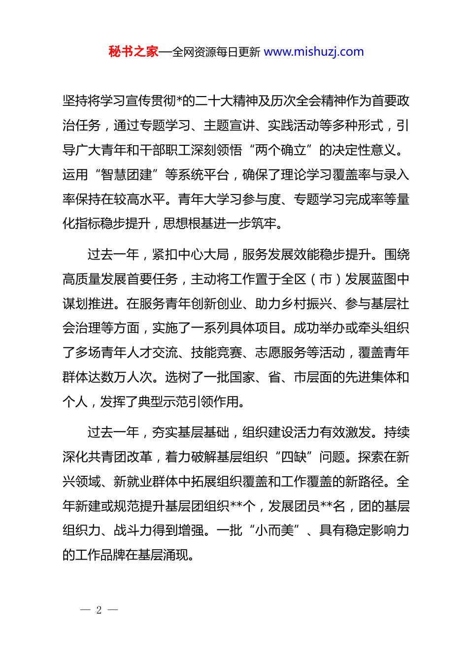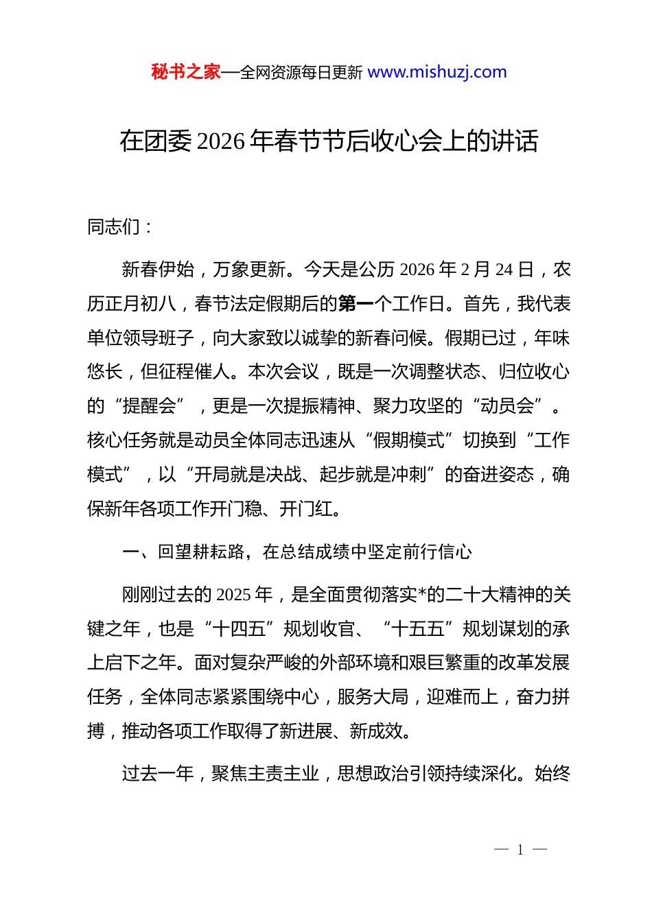 秘书之家—全网资源每日更新 www.mishuzj.com在团委 2026 年春节节后收心会上的讲话同志们:新春伊始,万象更新。今天是公历 2026 年 2 月 24 日,农历正月初八,春节法定假期后的第一个工作日。首先,我代表单位领导班子,向大家致以诚挚的新春问候。假期已过,年味悠长,但征程催人。本次会议,既是一次调整状态、归位收心的“提醒会”,更是一次提振精神、聚力攻坚的“动员会”。核心任务就是动员全体同志迅速从“假期模式”切换到“工作模式”,以“开局就是决战、起步就是冲刺”的奋进姿态,确保新年各项工作开门稳、开门红。一、回望耕耘路,在总结成绩中坚定前行信心刚刚过去的 2025 年,是全面贯彻落实*的二十大精神的关键之年,也是“十四五”规划收官、“十五五”规划谋划的承上启下之年。面对复杂严峻的外部环境和艰巨繁重的改革发展任务,全体同志紧紧围绕中心,服务大局,迎难而上,奋力拼搏,推动各项工作取得了新进展、新成效。过去一年,聚焦主责主业,思想政治引领持续深化。始终— 1 —秘书之家—全网资源每日更新 www.mishuzj.com坚持将学习宣传贯彻*的二十大精神及历次全会精神作为首要政治任务,通过专题学习、主题宣讲、实践活动等多种形式,引导广大青年和干部职工深刻领悟“两个确立”的决定性意义。运用“智慧团建”等系统平台,确保了理论学习覆盖率与录入率保持在较高水平。青年大学习参与度、专题学习完成率等量化指标稳步提升,思想根基进一步筑牢。过去一年,紧扣中心大局,服务发展效能稳步提升。围绕高质量发展首要任务,主动将工作置于全区(市)发展蓝图中谋划推进。在服务青年创新创业、助力乡村振兴、参与基层社会治理等方面,实施了一系列具体项目。成功举办或牵头组织了多场青年人才交流、技能竞赛、志愿服务等活动,覆盖青年群体达数万人次。选树了一批国家、省、市层面的先进集体和个人,发挥了典型示范引领作用。过去一年,夯实基层基础,组织建设活力有效激发。持续深化共青团改革,着力破解基层组织“四缺”问题。探索在新兴领域、新就业群体中拓展组织覆盖和工作覆盖的新路径。全年新建或规范提升基层团组织**个,发展团员**名,团的基层组织力、战斗力得到增强。一批“小而美”、具有稳定影响力的工作品牌在基层涌现。— 2 —秘书之家—全网资源每日更新 www.mishuzj.com过去一年,聚焦青年需求,服务联系纽带更加牢固。扎实开展“我为青年办实事”实践活动,在青年就业见习、婚恋交友、权益维护等方面推出一批务实举措。青年满意度、服务对象满意率作为关键质量指标,被纳入年度绩效评估体系。通过问卷调查、线上平台反馈等方式收集的青年诉求办结率超过**%,青年群体的获得感、归属感切实增强。这些成绩的取得,凝结着每一位同志的智慧、心血和汗水实践证明,我们的队伍是一支能打硬仗、善作善成的队伍。在肯定成绩的同时,也必须清醒认识到工作中的短板与不足。例如,对标高质量发展要求,工作的创新性与穿透力尚有提升空间;面对新形势新任务,部分干部的能力素质存在“本领恐慌”;一些工作的推进存在“重数量轻质量、重短期轻长效”的倾向;将宏观政策转化为基层具体项目和可感成果的路径仍需进一步探索和细化。这些问题,必须在新一年的工作中高度重视,着力解决。二、研判新形势,在把握机遇中明晰奋进方向2026 年,是实施“十五五”规划的开局之年,是向第二个百年奋斗目标进军新征程上的重要一年。当前,宏观政策环境正发生深刻变化。中央经济工作会议明确指出,2026 年政策基— 3 —秘书之家—全网资源每日更新 www.mishuzj.com调将更加强调“提质增效”,财政、货币政策将加强协同,着力扩大有效内需,兜牢基层“三保”底线,政策红利将持续释放。特别是关于“发展新质生产力”的战略部署,已经成为推动高质量发展的核心引擎与关键着力点。这要求我们必须深刻理解新质生产力“高科技、高效能、高质量”的特征,思考如何更好地发挥青年在科技创新、产业升级中的生力军作用。与此同时,区域发展面临新的机遇与挑战。地方财政运行民生保障、社会治理等方面对群团组织发挥桥梁纽带作用提出了更高要求...