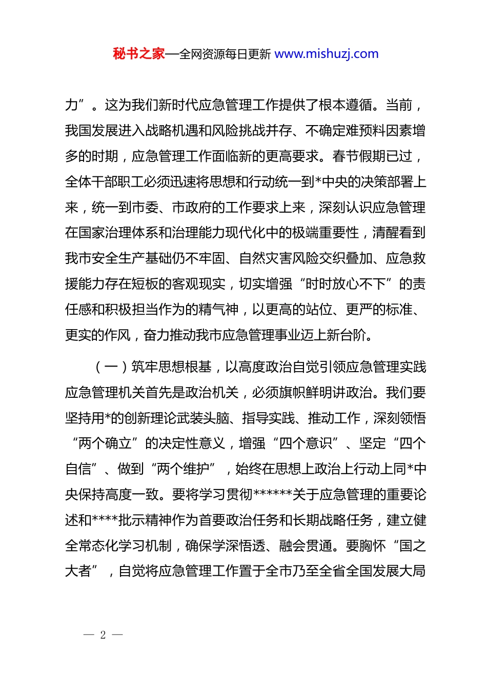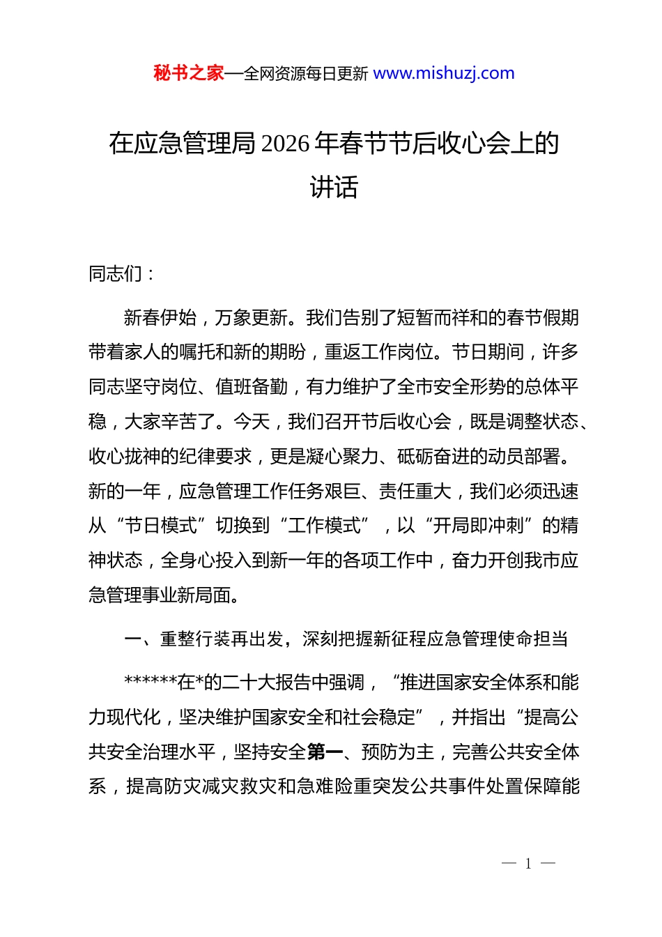 秘书之家—全网资源每日更新 www.mishuzj.com在应急管理局 2026 年春节节后收心会上的讲话同志们:新春伊始,万象更新。我们告别了短暂而祥和的春节假期带着家人的嘱托和新的期盼,重返工作岗位。节日期间,许多同志坚守岗位、值班备勤,有力维护了全市安全形势的总体平稳,大家辛苦了。今天,我们召开节后收心会,既是调整状态、收心拢神的纪律要求,更是凝心聚力、砥砺奋进的动员部署。新的一年,应急管理工作任务艰巨、责任重大,我们必须迅速从“节日模式”切换到“工作模式”,以“开局即冲刺”的精神状态,全身心投入到新一年的各项工作中,奋力开创我市应急管理事业新局面。一、重整行装再出发,深刻把握新征程应急管理使命担当******在*的二十大报告中强调,“推进国家安全体系和能力现代化,坚决维护国家安全和社会稳定”,并指出“提高公共安全治理水平,坚持安全第一、预防为主,完善公共安全体系,提高防灾减灾救灾和急难险重突发公共事件处置保障能— 1 —秘书之家—全网资源每日更新 www.mishuzj.com力”。这为我们新时代应急管理工作提供了根本遵循。当前,我国发展进入战略机遇和风险挑战并存、不确定难预料因素增多的时期,应急管理工作面临新的更高要求。春节假期已过,全体干部职工必须迅速将思想和行动统一到*中央的决策部署上来,统一到市委、市政府的工作要求上来,深刻认识应急管理在国家治理体系和治理能力现代化中的极端重要性,清醒看到我市安全生产基础仍不牢固、自然灾害风险交织叠加、应急救援能力存在短板的客观现实,切实增强“时时放心不下”的责任感和积极担当作为的精气神,以更高的站位、更严的标准、更实的作风,奋力推动我市应急管理事业迈上新台阶。(一)筑牢思想根基,以高度政治自觉引领应急管理实践应急管理机关首先是政治机关,必须旗帜鲜明讲政治。我们要坚持用*的创新理论武装头脑、指导实践、推动工作,深刻领悟“两个确立”的决定性意义,增强“四个意识”、坚定“四个自信”、做到“两个维护”,始终在思想上政治上行动上同*中央保持高度一致。要将学习贯彻******关于应急管理的重要论述和****批示精神作为首要政治任务和长期战略任务,建立健全常态化学习机制,确保学深悟透、融会贯通。要胸怀“国之大者”,自觉将应急管理工作置于全市乃至全省全国发展大局— 2 —秘书之家—全网资源每日更新 www.mishuzj.com中谋划和推进,不断提高政治判断力、政治领悟力、政治执行力。要坚持人民至上、生命至上,把保护人民群众生命财产安全作为一切工作的出发点和落脚点,将“两个至上”理念内化于心、外化于行,贯穿于风险防范、隐患排查、抢险救援、灾害救助全过程。要牢固树立总体国家安全观,统筹发展和安全,以高水平安全服务高质量发展。要强化忧患意识,坚持底线思维,时刻保持如履薄冰的谨慎和见叶知秋的敏锐,对各种风险隐患做到早识别、早预警、早处置。要发扬斗争精神,增强斗争本领,勇于面对应急管理领域的各种风险挑战,敢于动真碰硬,坚决同一切危害安全的行为和现象作斗争。要加强意识形态阵地管理,牢牢把握应急管理领域意识形态工作主动权,积极稳妥做好突发事件舆论引导,弘扬应急管理正能量,讲好应急管理故事,为事业发展营造良好氛围。(二)洞察发展态势,以清醒战略头脑锚定年度工作方位******指出,“预判风险是防范风险的前提,把握风险走向是谋求战略主动的关键”。科学研判形势是做好一切工作的基础。我们要立足新阶段新要求,全面审视我市应急管理工作面临的机遇与挑战。从宏观环境看,国家层面持续推进应急管理体系和能力现代化战略部署,*省“十四五”应急体系规划深入实施,— 3 —秘书之家—全网资源每日更新 www.mishuzj.com为我市工作提供了政策指引和项目支撑。市委、市政府高度重视安全发展,将应急管理摆在更加突出的位置,为事业发展创造了有利条件。从风险挑战看,我市产业结构调整进入深化期,新产业新业态新模式带来的新型安全风险与传统高危行业风险并存;极端天气事件呈现频发重发态势,洪涝、干旱、森林火灾等自然灾害风险加剧;城市运行系统日益复杂,各类基础设施安全风险、人...
