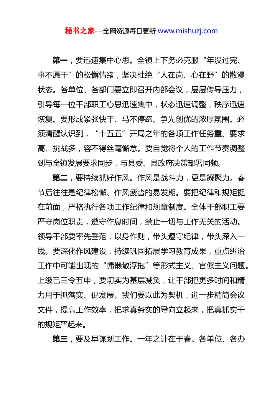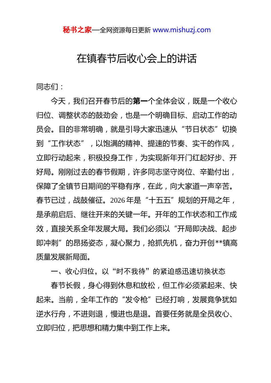 秘书之家—全网资源每日更新 www.mishuzj.com在镇春节后收心会上的讲话 同志们:今天,我们召开春节后的第一个全体会议,既是一个收心归位、调整状态的鼓劲会,也是一个明确目标、启动工作的动员会。目的非常明确,就是引导大家迅速从“节日状态”切换到“工作状态”,以饱满的精神、提速的节奏、实干的作风,立即行动起来,积极投身工作,为实现新年开门红起好步、开好局。刚刚过去的春节假期,许多同志坚守岗位、辛勤付出,保障了全镇节日期间的平稳有序,在此,向大家道一声辛苦。春节已过,战鼓催征。2026 年是“十五五”规划的开局之年,是承前启后、继往开来的关键一年。开年的工作状态和工作成效,直接关系全年发展大局。我们必须以“开局即决战、起步即冲刺”的昂扬姿态,凝心聚力,抢抓先机,奋力开创**镇高质量发展新局面。一、收心归位,以“时不我待”的紧迫感迅速切换状态春节长假,身心得到休息和放松,但工作必须紧起来、快起来。当前,全年工作的“发令枪”已经打响,发展竟争犹如逆水行舟,不进则退,慢进也是退。首要任务就是全员收心、立即归位,把思想和精力集中到工作上来。秘书之家—全网资源每日更新 www.mishuzj.com第一,要迅速集中心思。全镇上下务必克服“年没过完、事不愿干”的松懈情绪,坚决杜绝“人在岗、心在野”的散漫状态。各单位、各部门要立即召开内部会议,层层传导压力,引导每一位干部职工心思迅速集中,状态迅速调整,秩序迅速恢复。要形成紧张快干、马不停蹄、争先创优的浓厚氛围。必须清醒认识到,“十五五”开局之年的各项工作任务重、要求高、挑战多,容不得丝毫懈怠。要自觉将个人的工作节奏调整到与全镇发展要求同步,与县委、县政府决策部署同频。第二,要持续抓好作风。作风是战斗力,更是凝聚力。春节后往往是纪律松懈、作风疲沓的易发期。要把纪律和规矩挺在前面,严格执行各项工作纪律和规章制度。全体干部职工要严守岗位职责,遵守作息时间,禁止一切与工作无关的活动。领导干部要率先垂范,以身作则,带头遵守纪律,带头深入一线。要深化作风建设,持续巩固拓展学习教育成果,重点纠治工作中可能出现的“慵懒散浮拖”等形式主义、官僚主义问题。上级已三令五申,要切实为基层减负,让干部把更多时间和精力用于抓落实、促发展。我们要以此为契机,进一步精简会议文件,提高工作效率,把求真务实的导向立起来,把真抓实干的规矩严起来。第三,要及早谋划工作。一年之计在于春。各单位、各办秘书之家—全网资源每日更新 www.mishuzj.com公室要结合全县“四高四争先”总体部署和镇党委、政府年度工作要点,对各自分管领域、负责线条的工作进行再梳理、再谋划、再细化。要对照“十五五”规划的开局要求,立足**镇实际,找准工作切入点和着力点。目标任务要具体化,工作措施要项目化,时间节点要清单化,责任分工要明确化。决不能“脚踩西瓜皮,滑到哪里算哪里”,必须做到心中有谱、手中有招、肩上有责。二、聚焦重点,以“拼抢实干”的精气神奋力夺取开门红第一季度是全年经济的“风向标”,实现“开门红”对于稳定社会预期、提振发展信心、完成全年目标具有决定性意义。我们必须把夺取“开门红”作为当前压倒一切的中心任务,集中力量、攻坚克难。第一,要在经济运行调度上实现“开门红”。要紧盯核心经济指标,加强监测分析和精准调度。围绕地区生产总值、固定资产投资、工业增加值、社会消费品零售总额、财政收入等关键指标逐一分解任务,压实责任。相关部门要下沉企业,主动服务,及时掌握并协调解决企业复工复产、生产经营中遇到的困难和问题。要全力保障生产要素供给,推动企业满负荷生产,确保一季度主要经济指标增速达到或超过预期目标,为全年增长奠定坚实基础。根据宏观趋势和县域发展要求,一季度秘书之家—全网资源每日更新 www.mishuzj.com全镇应力争实现地区生产总值增长*%以上,固定资产投资增长*%以上,规上工业增加值增长*%以上的阶段性目标。第二,要在项目攻坚突破上实现“开门红”。项目是发展的“牛鼻子”和“压舱石”。要对在建项目进行全面摸排,督促施工单位上足人力机械,在确保安全和质量的前提...