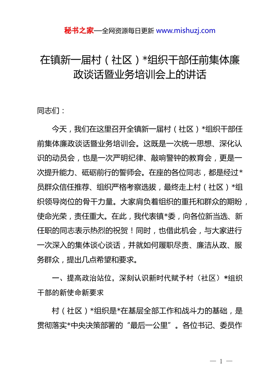 秘书之家—全网资源每日更新 www.mishuzj.com在镇新一届村(社区)*组织干部任前集体廉政谈话暨业务培训会上的讲话同志们:今天,我们在这里召开全镇新一届村(社区)*组织干部任前集体廉政谈话暨业务培训会。这既是一次统一思想、深化认识的动员会,也是一次严明纪律、敲响警钟的教育会,更是一次提升能力、砥砺前行的誓师会。在座的各位同志,都是经过*员群众信任推荐、组织严格考察选拔,最终走上村(社区)*组织领导岗位的骨干力量。大家肩负着组织的重托和群众的期盼,使命光荣,责任重大。在此,我代表镇*委,向各位新当选、新任职的同志表示热烈的祝贺!同时,也借此机会,与大家进行一次深入的集体谈心谈话,并就如何履职尽责、廉洁从政、服务群众,提出几点希望和要求。一、提高政治站位,深刻认识新时代赋予村(社区)*组织干部的新使命新要求村(社区)*组织是*在基层全部工作和战斗力的基础,是贯彻落实*中央决策部署的“最后一公里”。各位书记、委员作— 1 —秘书之家—全网资源每日更新 www.mishuzj.com为“领头雁”和“主心骨”,其政治素养、能力水平和作风形象,直接关系到*的执政根基是否稳固,关系到乡村振兴战略能否落地生根,关系到基层治理效能能否有效提升,更关系到千家万户的福祉冷暖。当前,我国正处在实现中华民族伟大复兴的关键时期,乡村振兴全面推进,基层治理体系和治理能力现代化不断深化。从宏观政策层面看,*中央始终坚持将“三农”工作作为全*工作的重中之重,连续多年的中央一号文件聚焦乡村振兴,出台了一系列强农惠农富农政策。上级*委政府也围绕高质量发展、共同富裕、美丽乡村建设等目标,作出了具体部署。这些大政方针和决策部署,最终都需要通过我们基层*组织的扎实工作,转化为群众看得见、摸得着的实际成果。从全面从严治*要求看,*风廉政建设和反腐败斗争持续向纵深推进、向基层延伸。群众身边的“微腐败”和不正之风,直接侵蚀*的执政基础,损害*群干群关系。因此,加强基层干部廉政教育,筑牢拒腐防变的思想防线,一刻也不能放松。从**镇自身发展实际看,过去一年,全镇上下凝心聚力,攻坚克难,在经济社会发展、民生事业改善、社会大局稳定等方面取得了长足进步。我们坚持稳中求进工作总基调,预计全镇地区生产总值保持稳步增长,产业— 2 —秘书之家—全网资源每日更新 www.mishuzj.com结构持续优化,招商引资和项目建设取得新突破,为高质量发展积蓄了动能。在民生领域,我们着力解决了一批群众急难愁盼问题,基础设施不断完善,社会保障网越织越密,人居环境显著提升,教育、医疗、文化等公共服务水平持续提高。在*风廉政建设方面,我们严格落实主体责任,深化作风建设,强化监督执纪,风清气正的政治生态得到进一步巩固。这些成绩的取得,离不开历届村(社区)干部的辛勤付出,也为各位新同志开展工作奠定了良好基础。但同时,我们也要清醒看到,对标高质量发展要求和人民群众对美好生活的向往,我们的工作还存在一些短板和不足。新形势、新任务对大家的能力素质提出了更高标准、更严要求。大家必须深刻认识到肩上担子的分量,迅速进入角色,找准定位,以“赶考”的心态、“奋斗”的姿态,投身到新的工作中去。二、坚守清廉底线,永葆共产*人清正廉洁的政治本色“廉者,政之本也。”廉洁是从政者的第一生命线。开展任前廉政谈话,是加强*内监督、关心爱护干部的重要制度安排,目的在于早打“预防针”、早敲“警示钟”,帮助大家在新的起点上开好头、起好步。大家必须把廉洁自律作为立身之本、成事之基,时刻保持清醒头脑,筑牢思想防线。— 3 —秘书之家—全网资源每日更新 www.mishuzj.com第一,要筑牢信仰之基,补足精神之钙。理想信念是“总开关”。一些干部出问题,根源在于理想信念动摇、思想防线失守。大家要持续加强理论学习,深入学习*的创新理论,深刻领会其核心要义和精神实质,不断增强“四个意识”、坚定“四个自信”、做到“两个维护”的政治自觉。要牢固树立正确的世界观、人生观、价值观和权力观、地位观、利益观,牢记全心全意为人民服务的根本宗旨,把为民造福作为最大政绩。要经常对照*章*规 d...