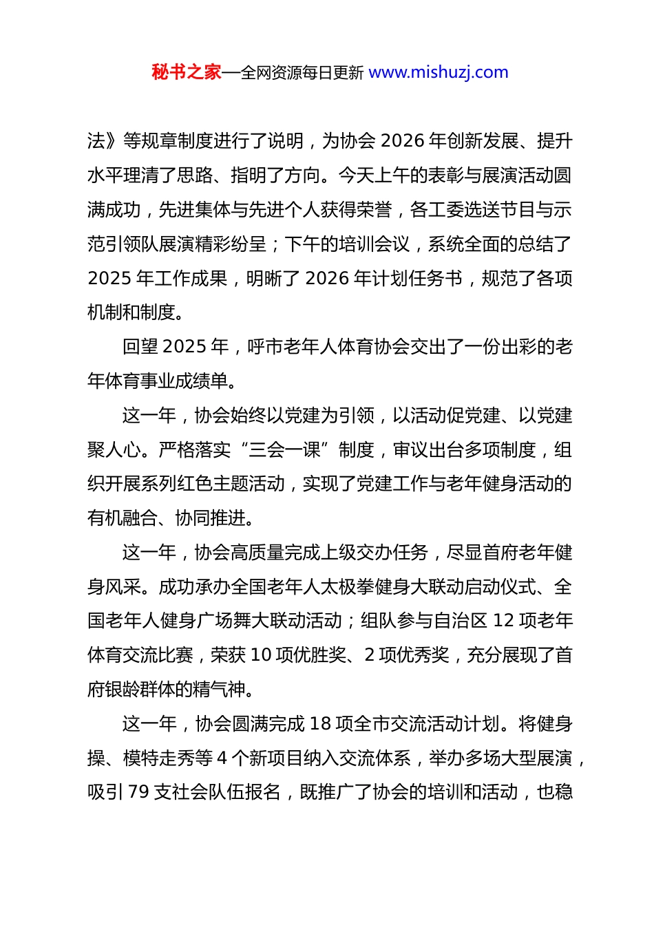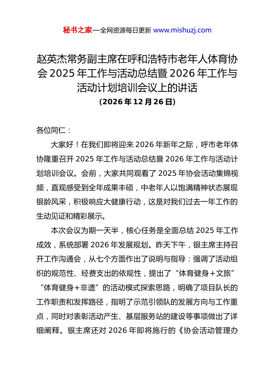 秘书之家—全网资源每日更新 www.mishuzj.com赵英杰常务副主席在呼和浩特市老年人体育协会 2025 年工作与活动总结暨 2026 年工作与活动计划培训会议上的讲话(2026 年 12 月 26 日)各位同仁:大家好!在我们即将迎来 2026 年新年之际,呼市老年体协隆重召开 2025 年工作与活动总结暨 2026 年工作与活动计划培训会议。会前,大家共同观看了 2025 年协会活动集锦视频,直观感受到全年成果丰硕,中老年人以饱满精神状态展现银龄风采,积极响应大健康行动,这是对我们过去一年工作的生动见证和精彩展示。 本次会议为期一天半,核心任务是全面总结 2025 年工作成效,系统部署 2026 年发展规划。昨天下午,银主席主持召开工作沟通会,从七个方面作出了说明与指导:强调了活动组织的规范性、经费支出的依规性,提出了“体育健身+文旅”“体育健身+非遗”的活动模式探索思路,明确了项目队长的工作职责和发挥路径,指明了示范引领队的发展方向与工作重点,同时对表彰活动产生、基层服务站的建设等事项做出了详细阐释。银主席还对 2026 年即将施行的《协会活动管理办秘书之家—全网资源每日更新 www.mishuzj.com法》等规章制度进行了说明,为协会 2026 年创新发展、提升水平理清了思路、指明了方向。今天上午的表彰与展演活动圆满成功,先进集体与先进个人获得荣誉,各工委选送节目与示范引领队展演精彩纷呈;下午的培训会议,系统全面的总结了2025 年工作成果,明晰了 2026 年计划任务书,规范了各项机制和制度。 回望 2025 年,呼市老年人体育协会交出了一份出彩的老年体育事业成绩单。 这一年,协会始终以党建为引领,以活动促党建、以党建聚人心。严格落实“三会一课”制度,审议出台多项制度,组织开展系列红色主题活动,实现了党建工作与老年健身活动的有机融合、协同推进。这一年,协会高质量完成上级交办任务,尽显首府老年健身风采。成功承办全国老年人太极拳健身大联动启动仪式、全国老年人健身广场舞大联动活动;组队参与自治区 12 项老年体育交流比赛,荣获 10 项优胜奖、2 项优秀奖,充分展现了首府银龄群体的精气神。 这一年,协会圆满完成 18 项全市交流活动计划。将健身操、模特走秀等 4 个新项目纳入交流体系,举办多场大型展演,吸引 79 支社会队伍报名,既推广了协会的培训和活动,也稳秘书之家—全网资源每日更新 www.mishuzj.com固了协会在群众心中的平台地位。这一年,各工委及基层服务站下沉服务,让健身乐趣惠及基层。全年累计开展近百场接地气的文体活动,让基层老年人在家门口就能享受优质体育健身服务。这一年,协会培训工作扎实推进,培训基地顺利落成,针对太极拳、广场舞、健身秧歌、柔力球、健身球操、健身操等6 个项目开展春秋两季基础技能培训及示范引领队集训,完成500 余课时教学,惠及 1000 余人次,为老年群体提供了科学健身的专业平台。这一年,协会建立了示范引领队伍,这是协会工作的尝试和创新。选拔优秀骨干、组建引领队伍、提升技能水平,充分发挥骨干带头作用和示范引领作用,带动更多老年人加入健身队伍。这一年,协会聚焦制度创新与服务改革,成效显著。主持召开各类主席办公会,研究解决近 50 项工作议题,通过精准服务跟进保障活动落地,实现工作高效化、规范化运转。这些成绩的取得,离不开市委、市政府的坚强领导,离不开自治区老年体协的关心和支持,离不开市财政局、体育局等部门的鼎力支持,更离不开全体同仁的无私奉献、辛勤付出,与广大老年朋友的积极参与。在此,我代表协会,向所有受到秘书之家—全网资源每日更新 www.mishuzj.com表彰的先进集体和个人致以最热烈的祝贺!希望获奖者珍惜荣誉、再接再厉,也向每一位为老年体育事业付出辛劳的同仁致以诚挚敬意,愿大家以先进为标杆,凝心聚力、争先创优,共同推动首府老年体育事业再攀新高。 当前,我国老龄化进程持续加快,老年体育工作迎来新机遇与新挑战。老年体育事业是积极应对人口老龄化的重要抓手,关乎老年人幸福指数。我们要务实进取,让更多老年人在体育锻炼中收获健康与快乐。面对日益增长的老年人口规模和多...