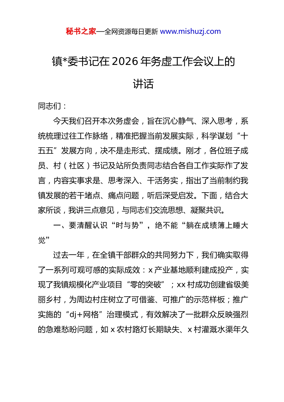 秘书之家—全网资源每日更新 www.mishuzj.com镇*委书记在 2026 年务虚工作会议上的讲话同志们:今天我们召开本次务虚会,旨在沉心静气、深入思考,系统梳理过往工作脉络,精准把握当前发展实际,科学谋划“十五五”发展方向,决不是走形式、摆成绩。刚才,各位班子成员、村(社区)书记及站所负责同志结合各自工作实际作了发言,内容实事求是、思考深入、干活务实,指出了当前制约我镇发展的若干堵点、痛点问题,听后深受启发。下面,结合大家所谈,我讲三点意见,与同志们交流思想、凝聚共识。一、要清醒认识“时与势”,绝不能“躺在成绩簿上睡大觉”过去一年,在全镇干部群众的共同努力下,我们确实取得了一系列可观可感的实际成效:x 产业基地顺利建成投产,实现了我镇规模化产业项目“零的突破”;xx 村成功创建省级美丽乡村,为周边村庄树立了可借鉴、可推广的示范样板;推广实施的“dj+网格”治理模式,有效解决了一批群众反映强烈的急难愁盼问题,如 x 农村路灯长期缺失、x 村灌溉水渠年久秘书之家—全网资源每日更新 www.mishuzj.com失修等事项均得到及时妥善处置。这些成绩值得充分肯定。但越是在取得成绩的时候,越要增强忧患意识,绝不可沾沾自喜、故步自封。必须清醒认识到,当前区域竞争日趋激烈,周边乡镇发展态势逼人、各显其能。如果我们满足于现有成绩而放缓前进脚步,必将很快落后于时代发展潮流。我们必须冷静分析、深刻反思当前存在的短板与不足:产业结构方面,仍以传统种养殖业为主,结构单一,缺乏深加工和高附加值产业支撑,农民增收基础不牢,抗风险能力较弱;乡村振兴方面,虽有个别亮点村,但多数村庄公共服务设施依然薄弱,部分村文化体育活动场所匮乏,群众精神文化生活有待丰富,留守老人、儿童关爱服务不足,与人民群众对美好生活的向往存在差距;基层治理方面,一些矛盾隐患尚未根本化解,个别信访积案仍未彻底解决,网格化服务管理在部分村落地见效不足,未能充分发挥前沿哨所作用。这些问题都是下一步必须啃下的“硬骨头”。全体同志务必深刻认识到,这些绝非小事,而是事关我镇能否实现高质量发展的关键大事,必须做到心中有数、绝不回避。要以“时时放心不下”的责任感,真正把短板弱项找准、把问题根源挖深,从而明确今后努力方向和改进措施。二、要聚焦“三个重点”,明确明年工作的“主攻方向”秘书之家—全网资源每日更新 www.mishuzj.com明年工作要紧紧围绕“产业强镇、生态立镇、治理兴镇”三大重点战略统筹推进、狠抓落实。三者相互关联、相互促进,必须系统谋划、一体推进。一是聚焦产业强镇,夯实发展根基,促进农民收入持续增长。产业是发展的生命线。要立足本地资源禀赋(如生态优势、区位优势等),在做精做特上下功夫。要积极引进培育农产品深加工企业,着力将本地特色水果资源转化为罐头、果脯等高附加值产品,延伸产业链、提升价值链,缓解季节性销售难和价格波动问题;要支持家庭农场、专业合作社改善生产条件,推广绿色有机种植模式,提升农产品品质与品牌影响力;要整合资源,科学规划打造“x 生态旅游线路”,串联自然景观、古村落资源与农业体验项目,设计主题游览套餐,加强宣传推介,吸引市民消费,拓宽农民增收渠道;要持续优化营商环境,主动服务现有及意向投资企业,切实帮助解决用地、用工、审批等实际困难。二是聚焦生态立镇,守护绿水青山,全面提升农村人居环境质量。良好的生态环境是我镇的最大优势和宝贵财富。要持续深入抓好农村人居环境整治,健全长效管护机制,扎实推进垃圾分类、污水治理、厕所革命等重点任务,确保村容村貌整洁有序;要加强 xx 河流域系统治理,清淤疏浚、加固堤岸,严秘书之家—全网资源每日更新 www.mishuzj.com厉打击非法排污和采砂行为,逐步恢复河流生态功能;要因地制宜推进村庄绿化美化,利用闲置地、边角地及庭院空间,增植乡土树种花草,建设小微公园和公共绿地,努力实现“处处是景、步步入画”,切实提升人民群众生活环境品质和幸福感。三是聚焦治理兴镇,提升服务效能,凝聚共建共治共享合力。要深化“dj+网格”治理模式,优化网格设置,加强网格员队伍建设...